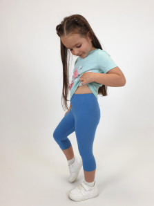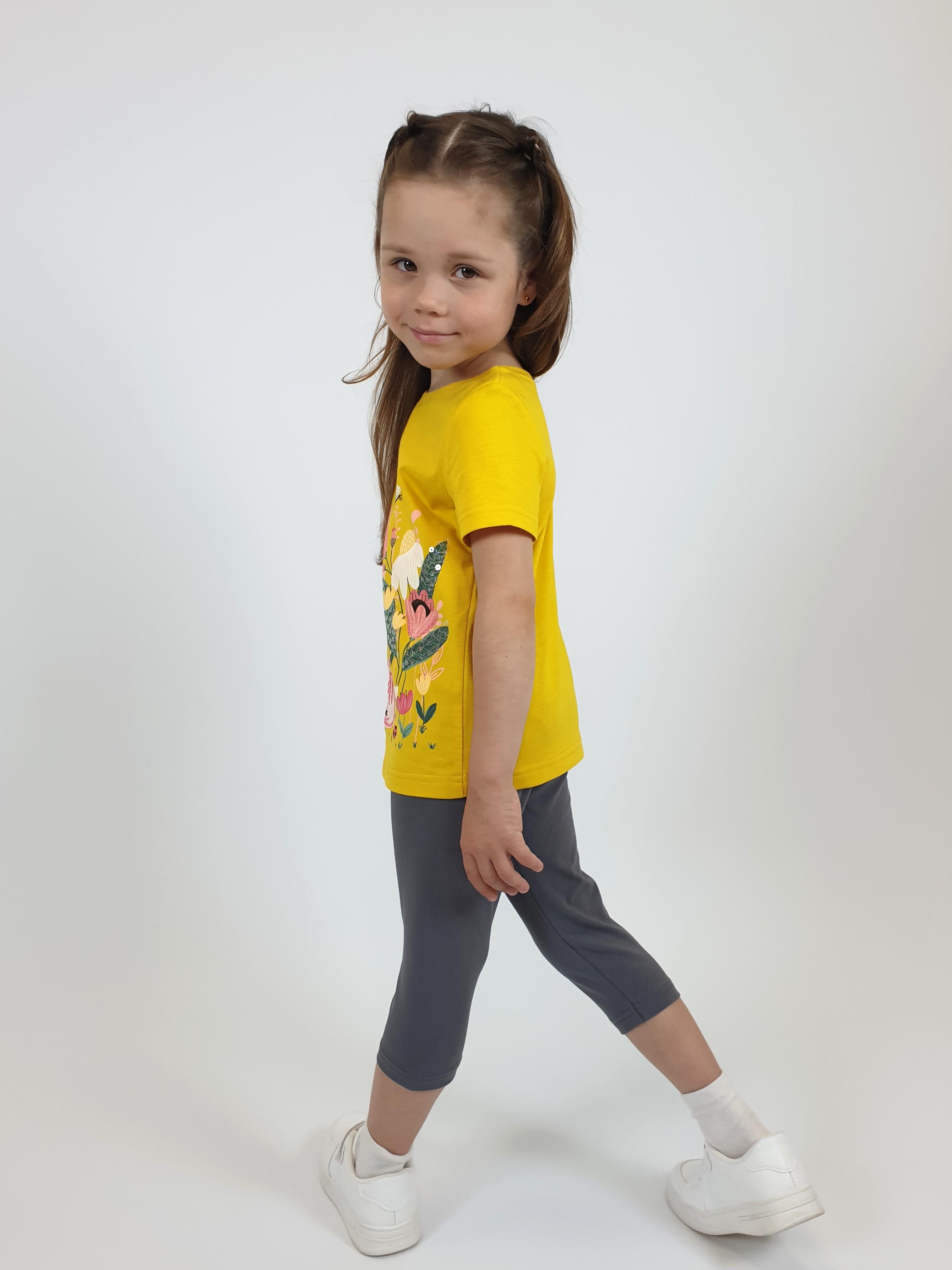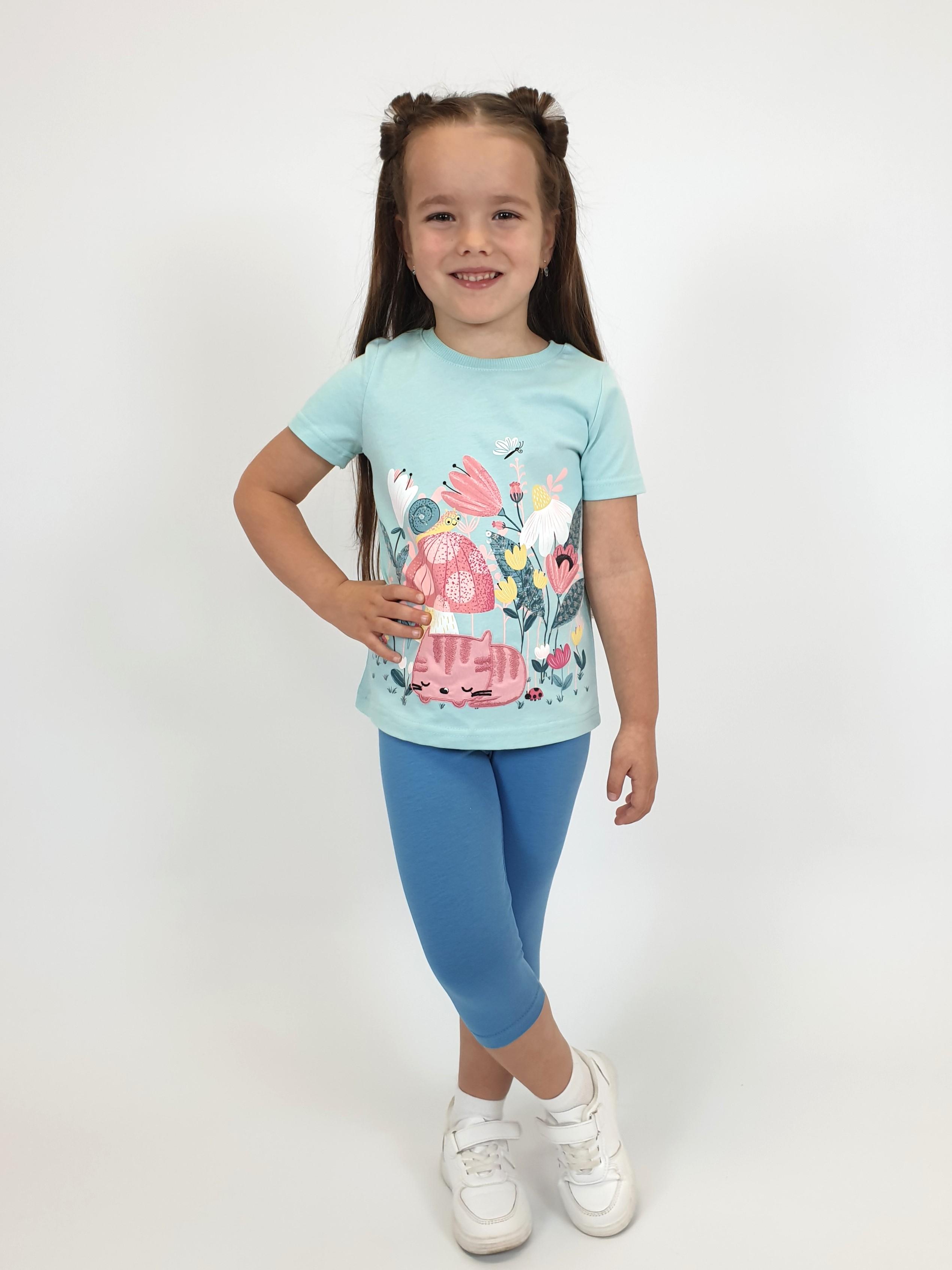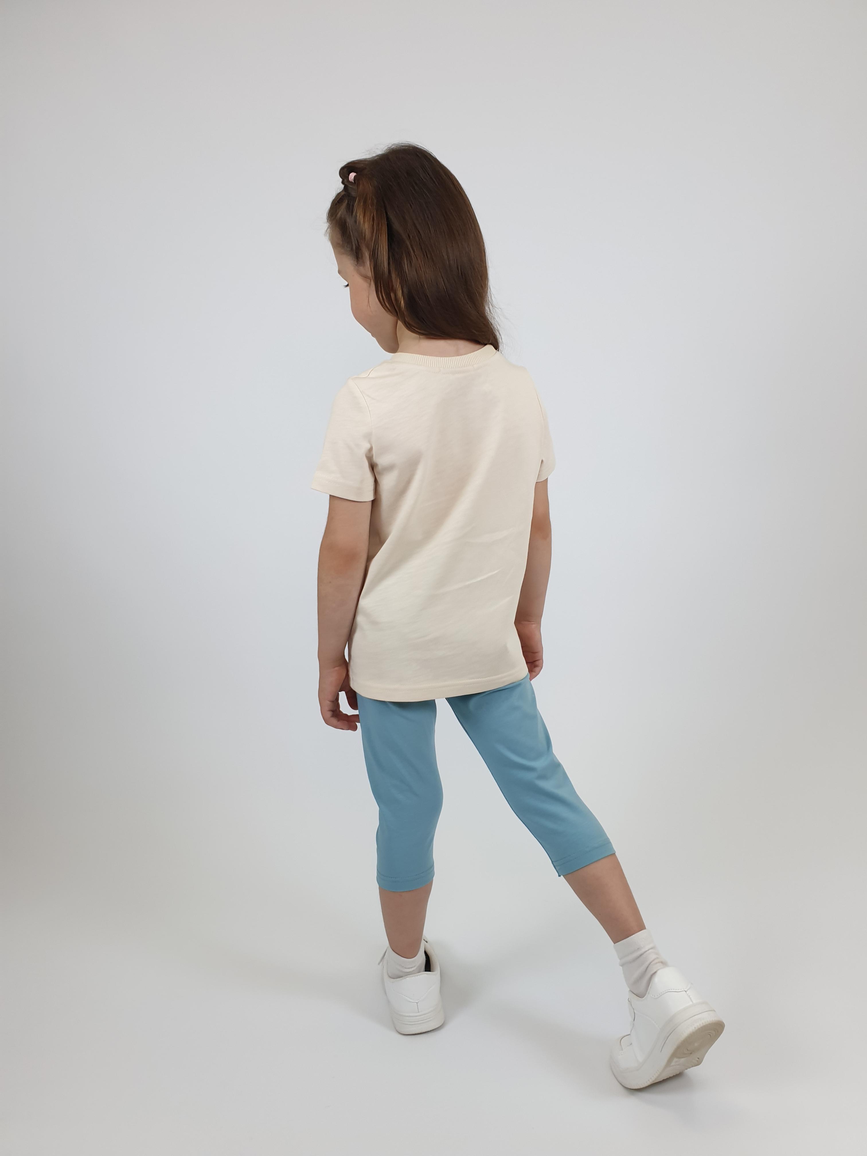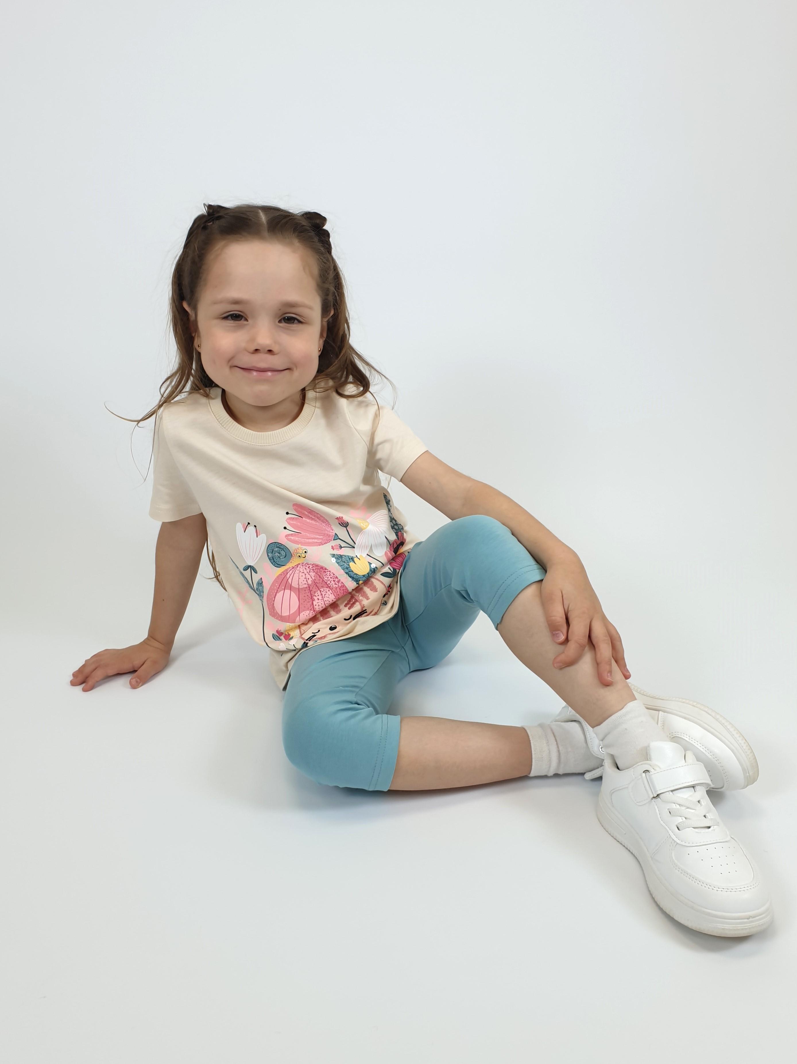 Кулирное полотно: Фуфайка- 100% х/б.,лосины-95% х/б,5% лайкра. Фуфайка-прямой силуэт,печать и вышивка на переде,короткий втачной рукав.Низ рукава и фуфайки подшит.Горловина обработана ластиком. Лосины-укороченные,вверху на резинке.