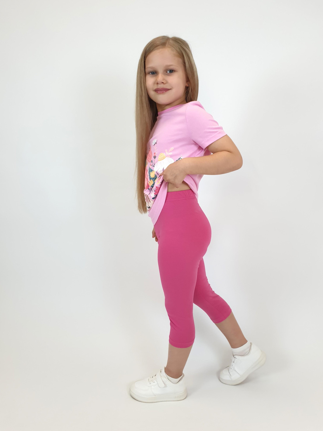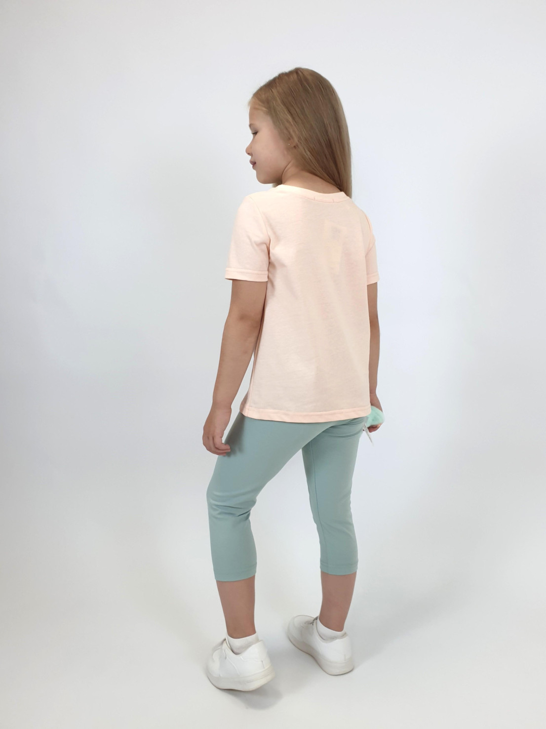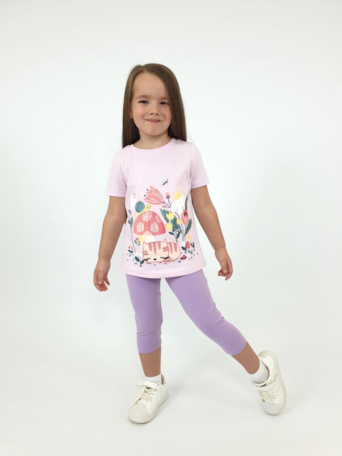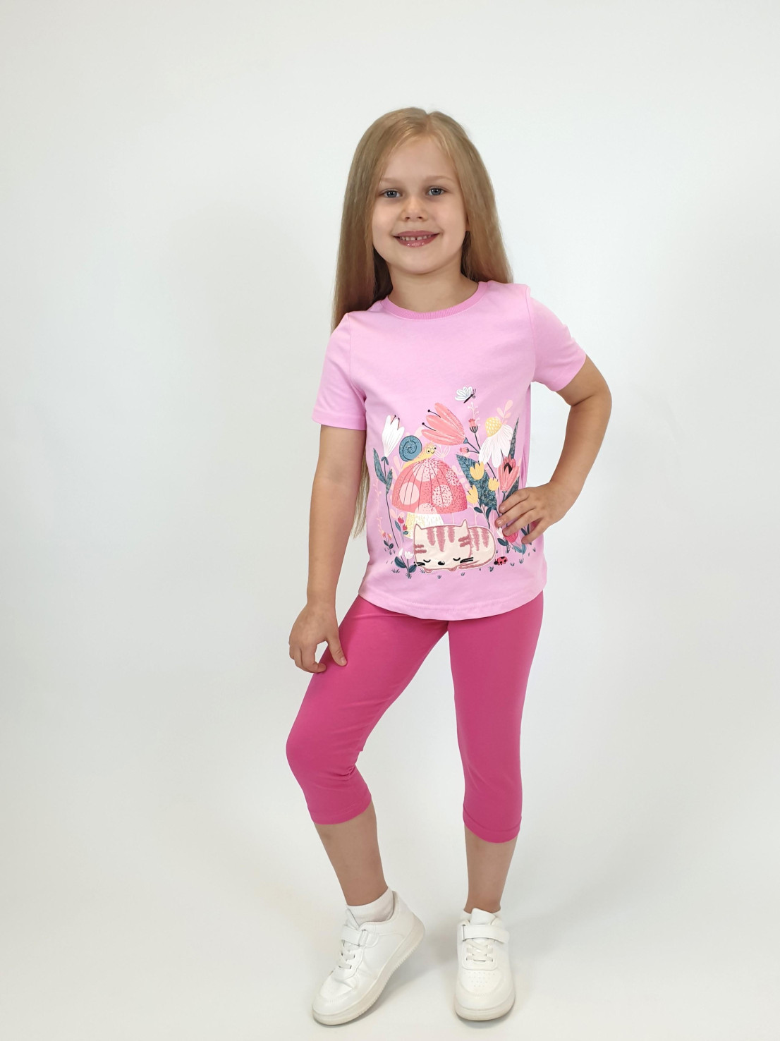 Кулирное полотно: Фуфайка- 100% х/б.,лосины-95% х/б,5% лайкра. Фуфайка-прямой силуэт,печать и вышивка на переде,короткий втачной рукав.Низ рукава и фуфайки подшит.Горловина обработана ластиком. Лосины-укороченные,вверху на резинке.