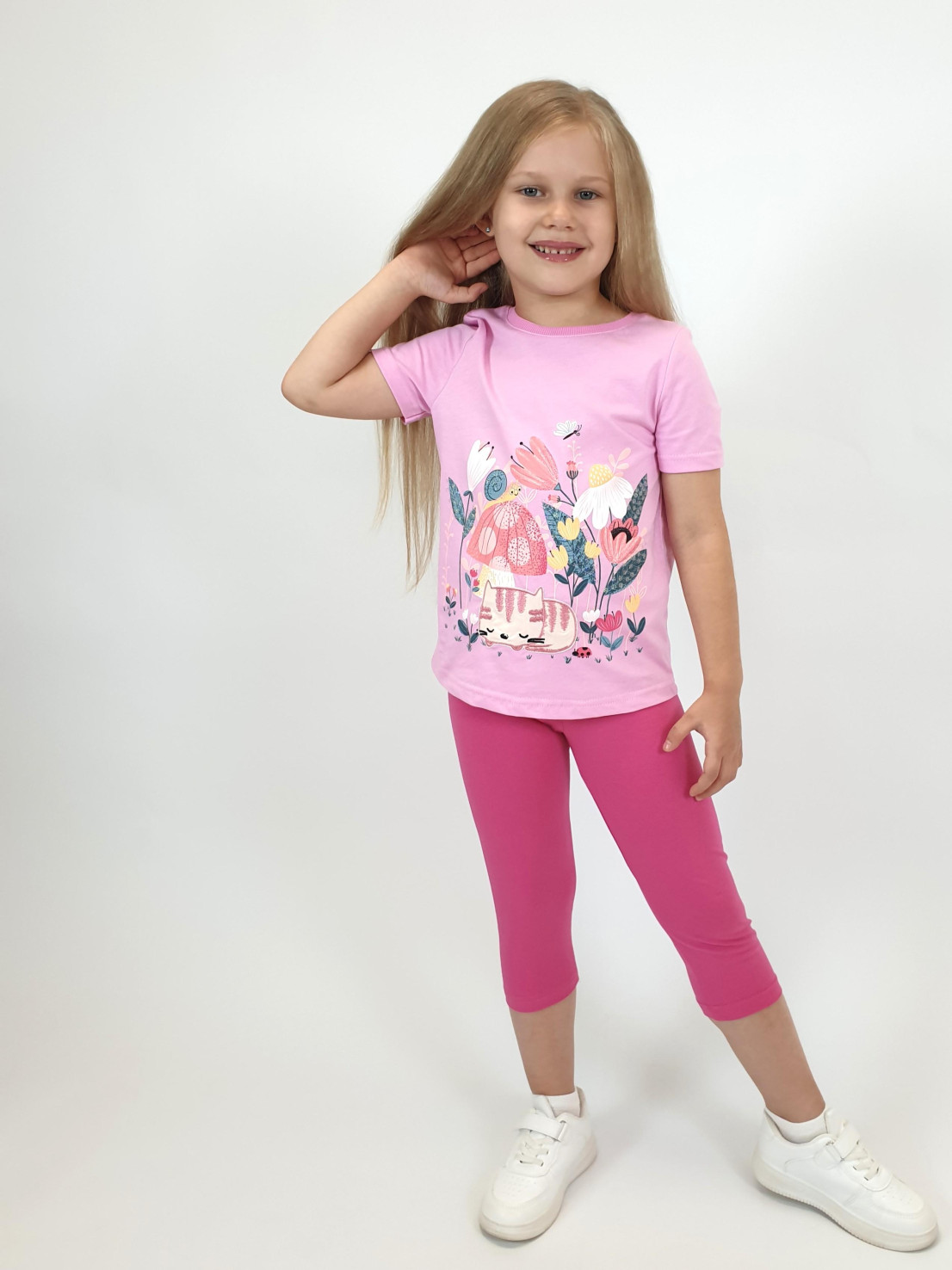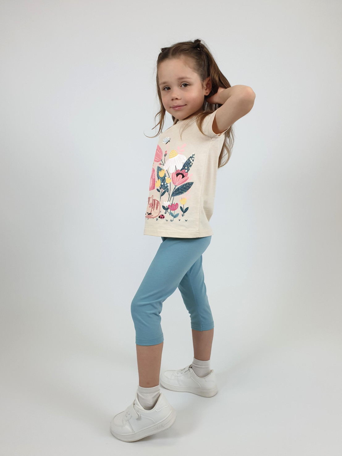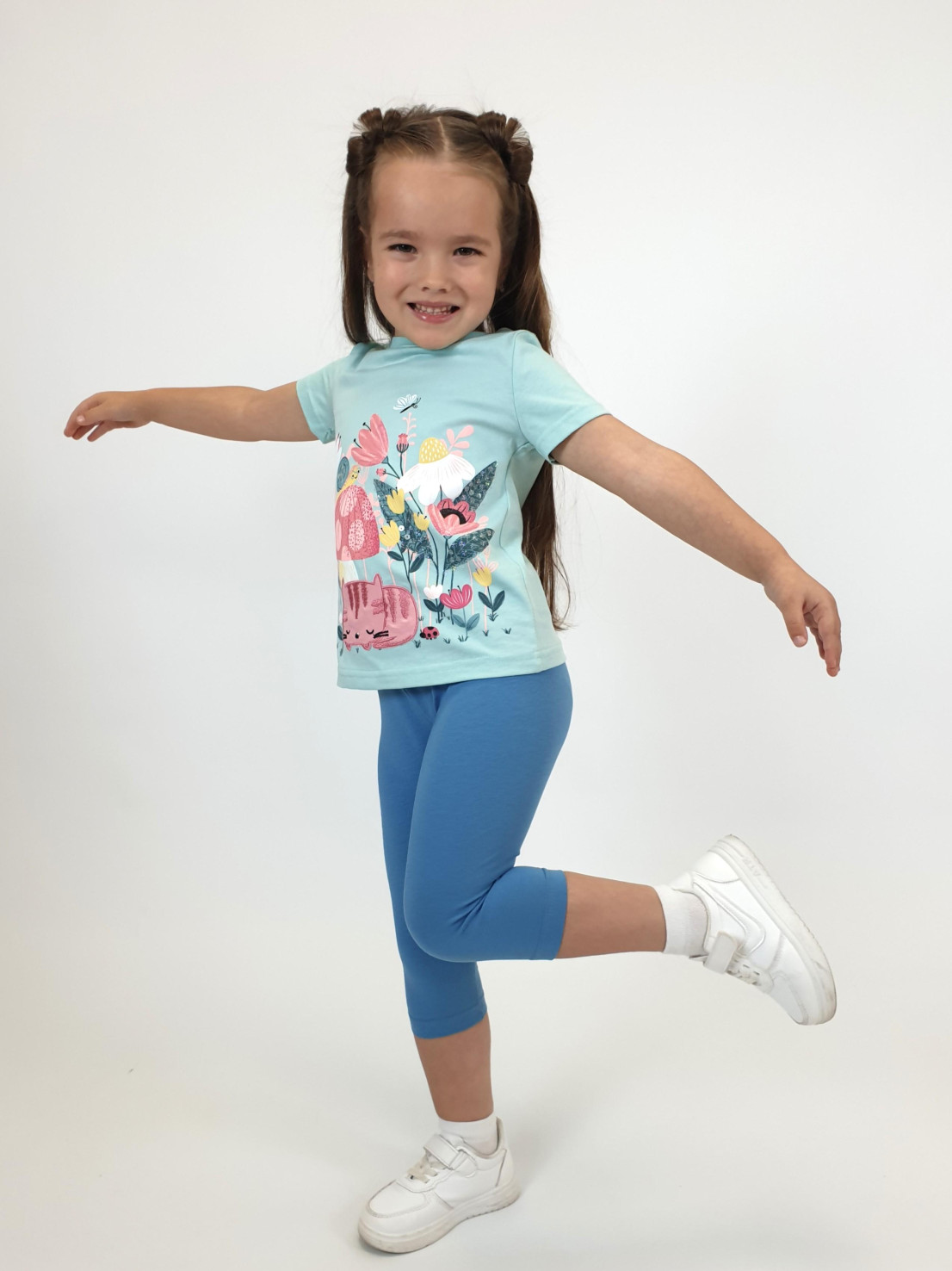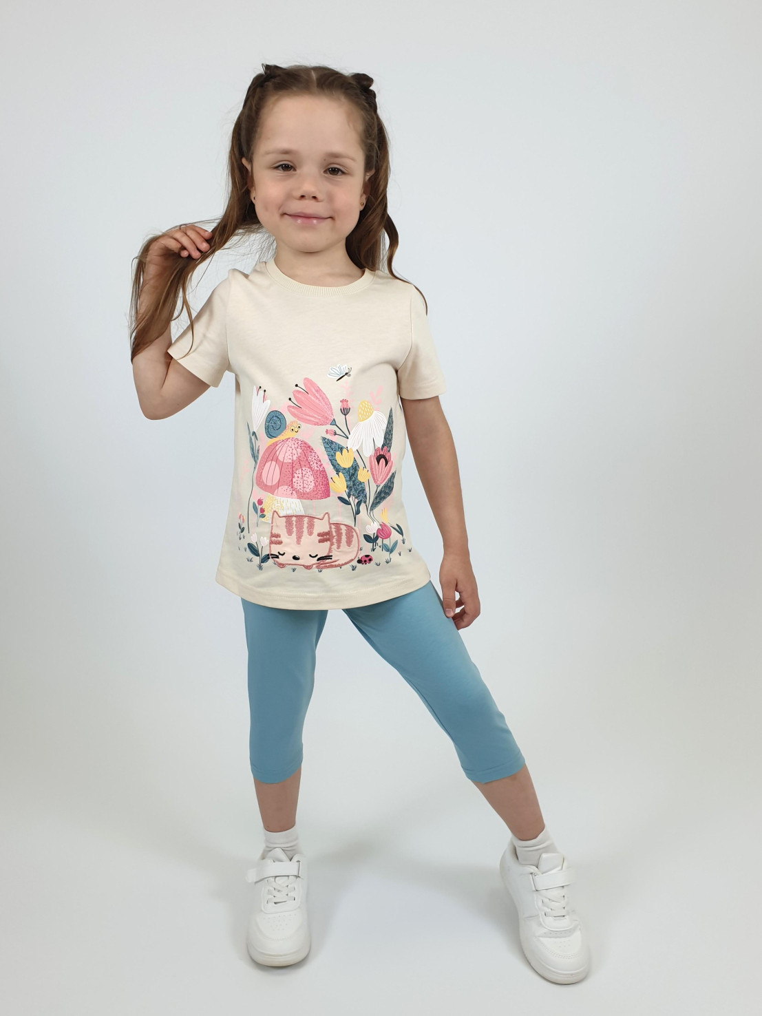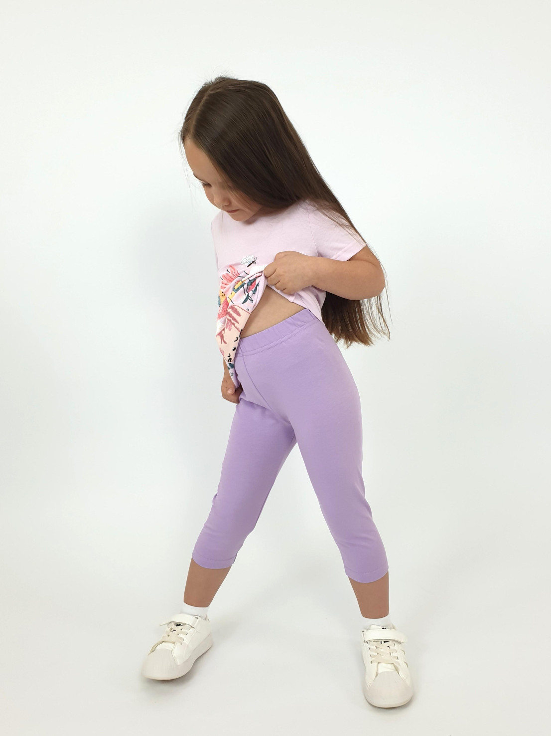 Кулирное полотно: Фуфайка- 100% х/б.,лосины-95% х/б,5% лайкра. Фуфайка-прямой силуэт,печать и вышивка на переде,короткий втачной рукав.Низ рукава и фуфайки подшит.Горловина обработана ластиком. Лосины-укороченные,вверху на резинке.