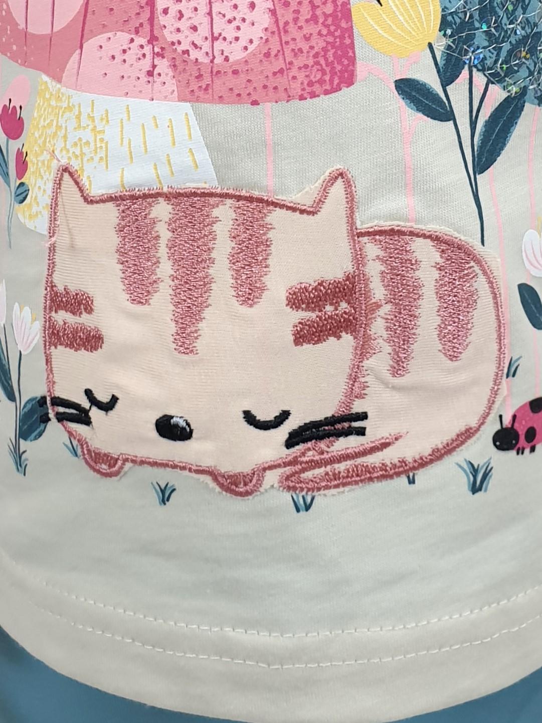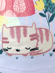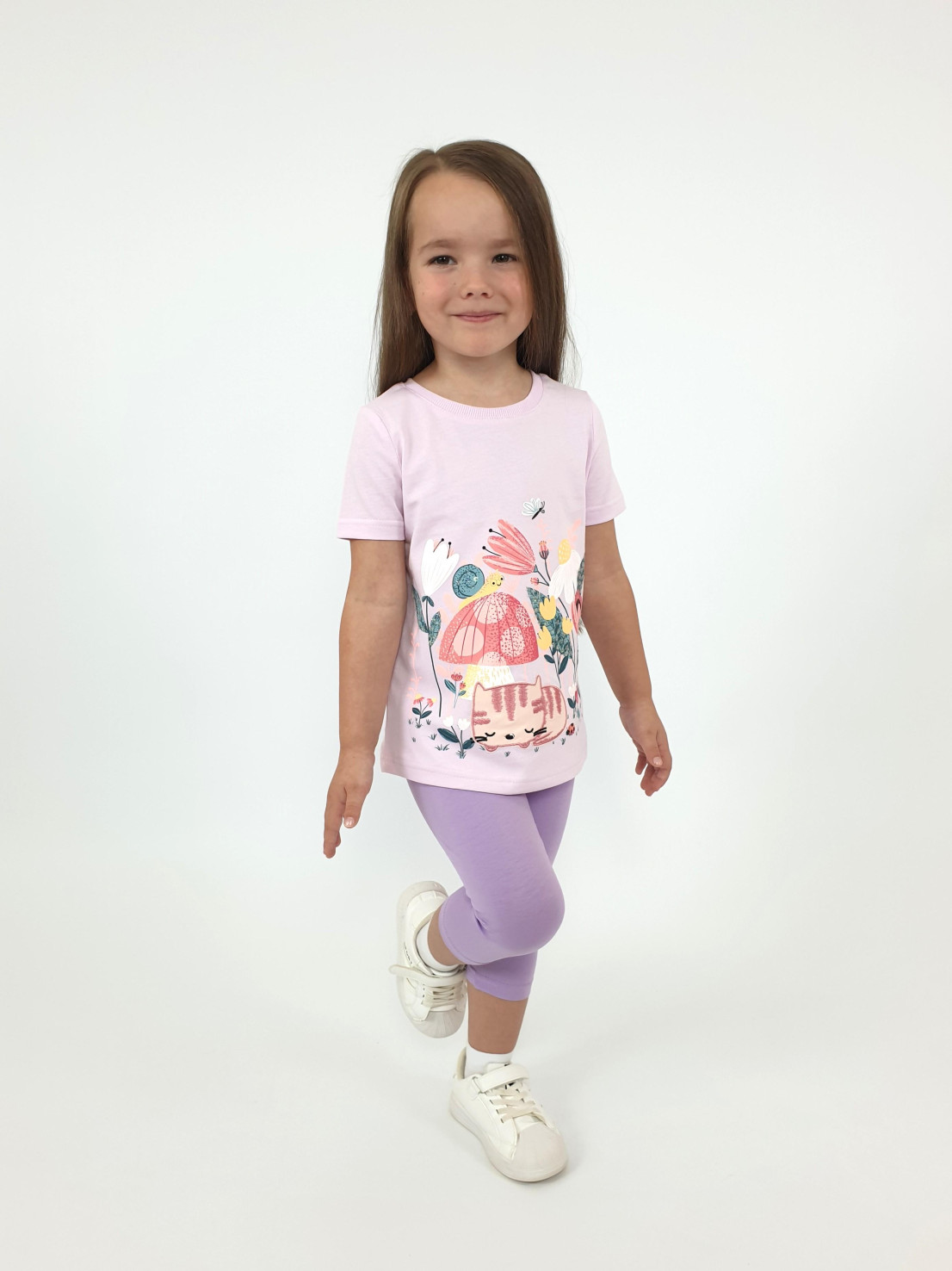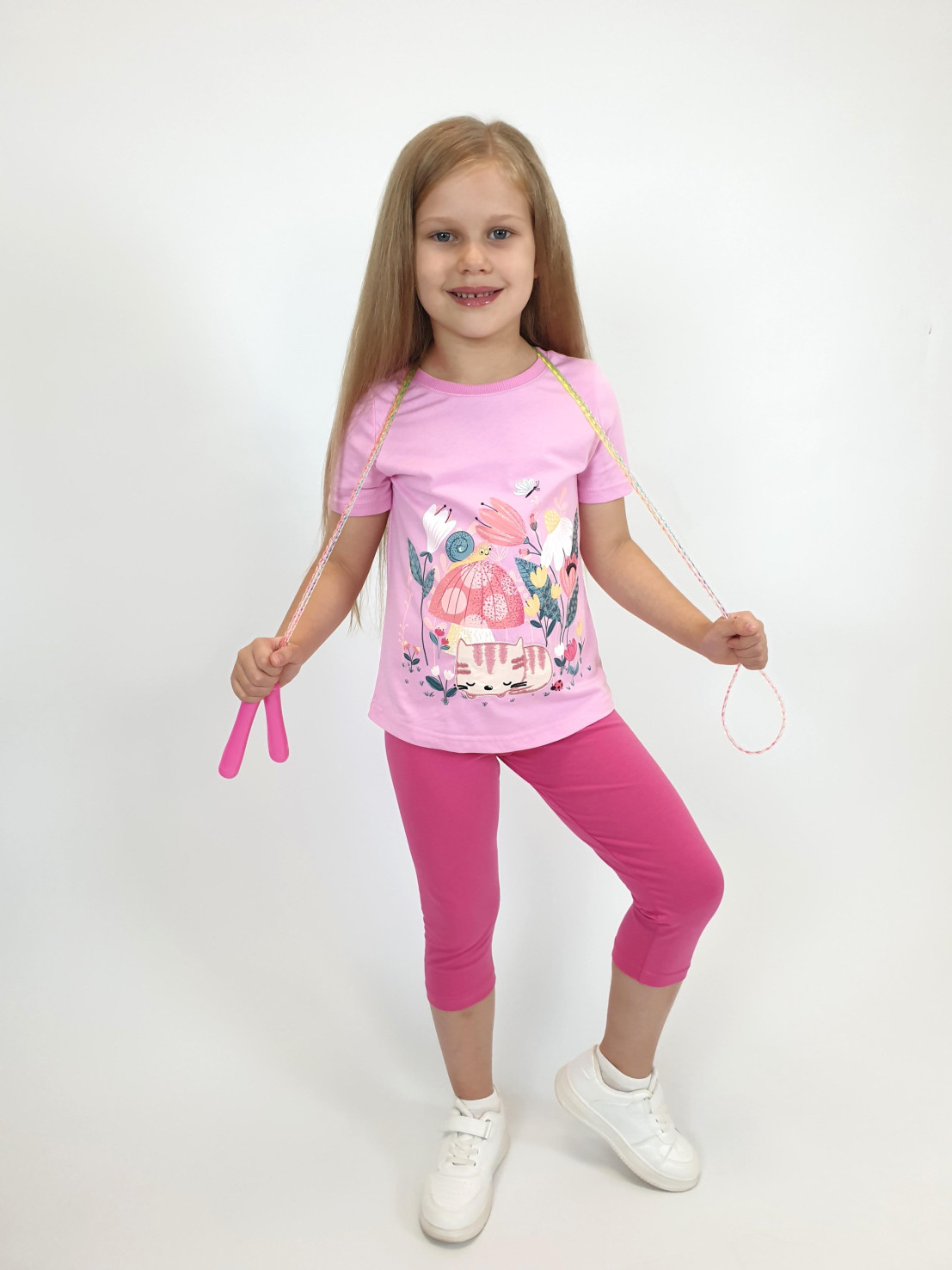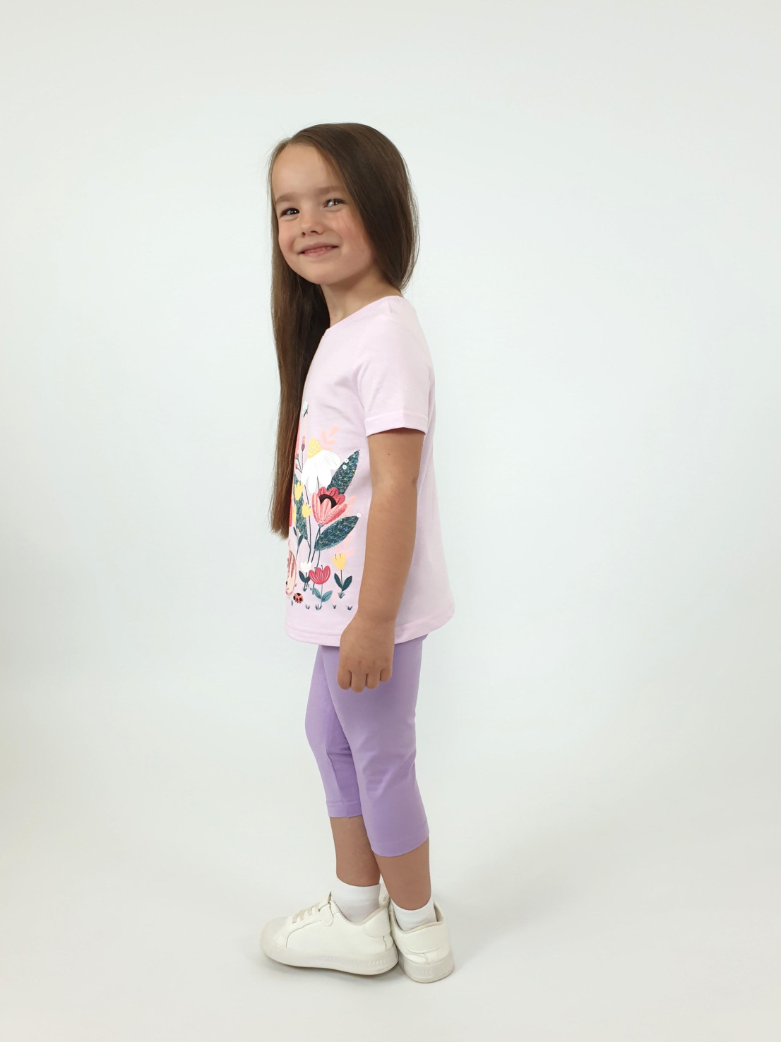 Кулирное полотно: Фуфайка- 100% х/б.,лосины-95% х/б,5% лайкра. Фуфайка-прямой силуэт,печать и вышивка на переде,короткий втачной рукав.Низ рукава и фуфайки подшит.Горловина обработана ластиком. Лосины-укороченные,вверху на резинке.