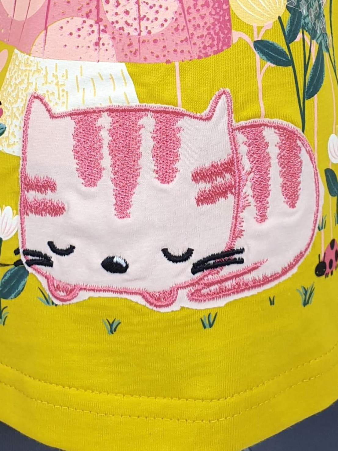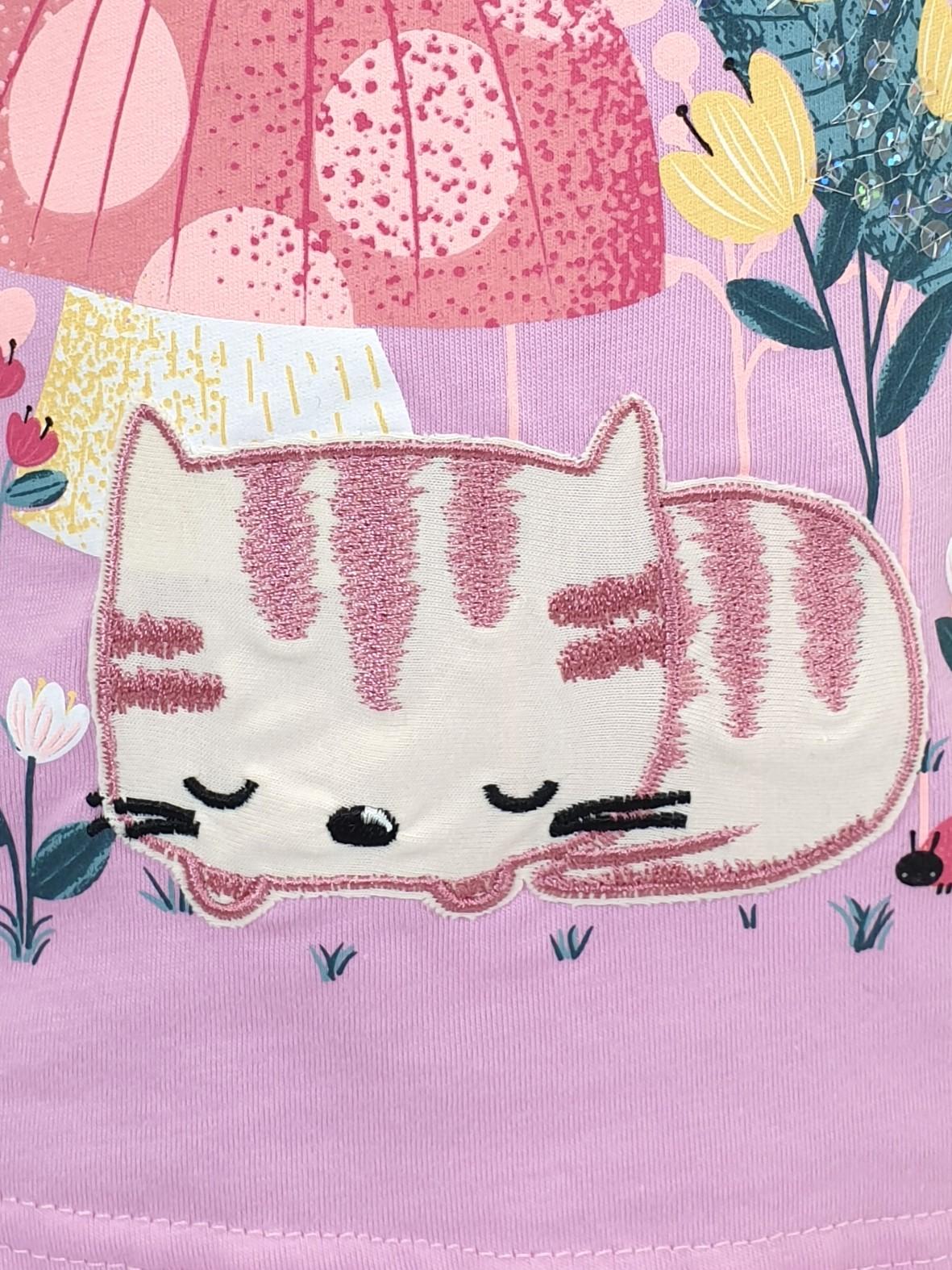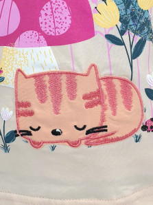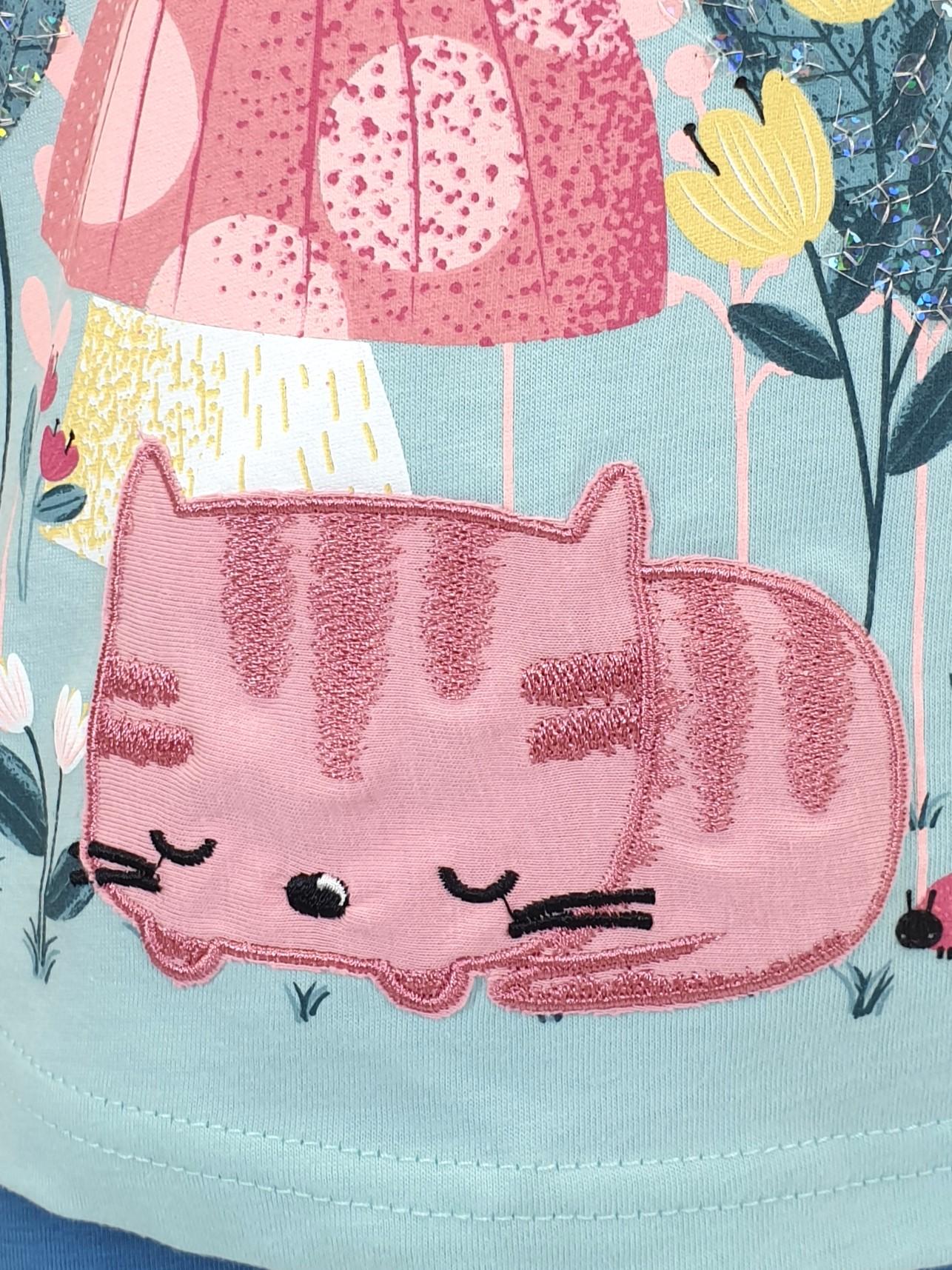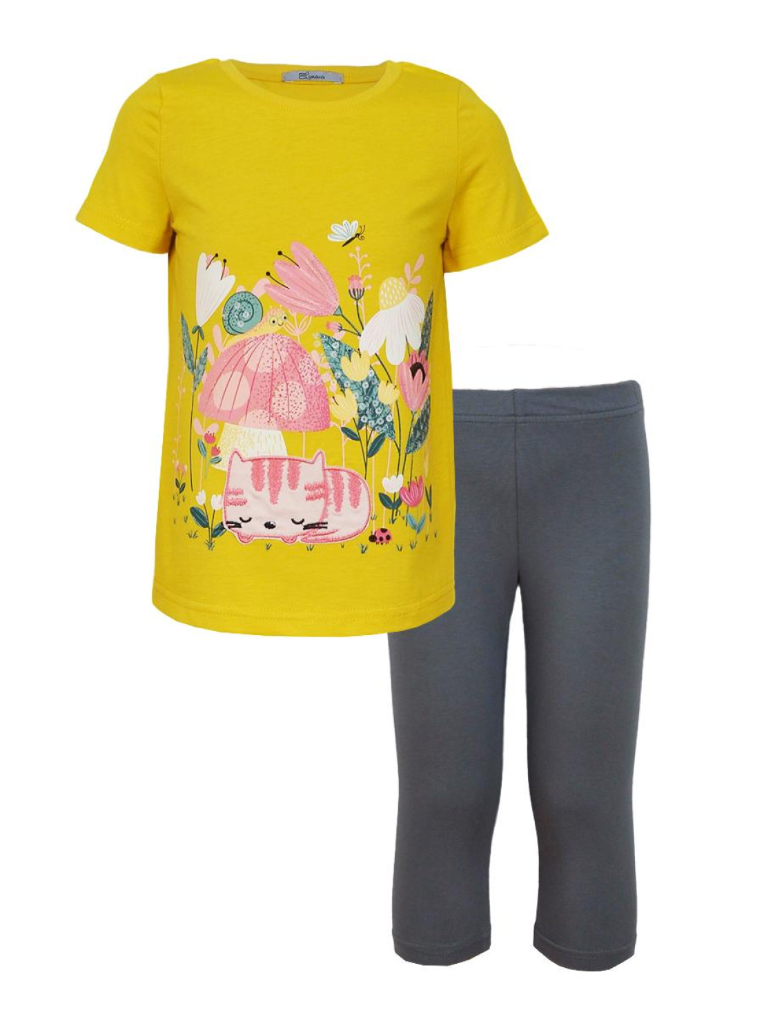 Кулирное полотно: Фуфайка- 100% х/б.,лосины-95% х/б,5% лайкра. Фуфайка-прямой силуэт,печать и вышивка на переде,короткий втачной рукав.Низ рукава и фуфайки подшит.Горловина обработана ластиком. Лосины-укороченные,вверху на резинке.