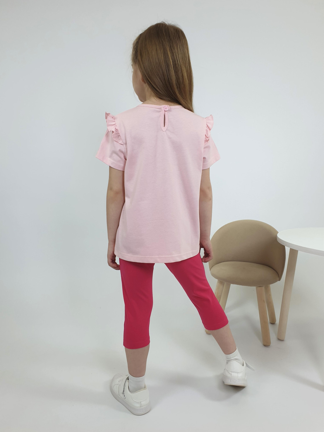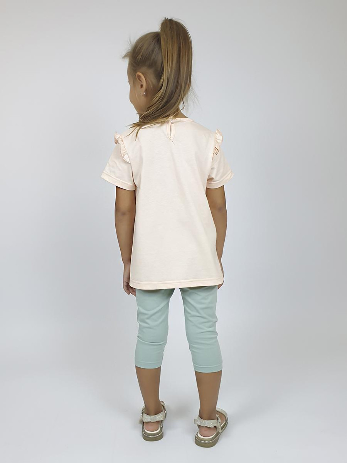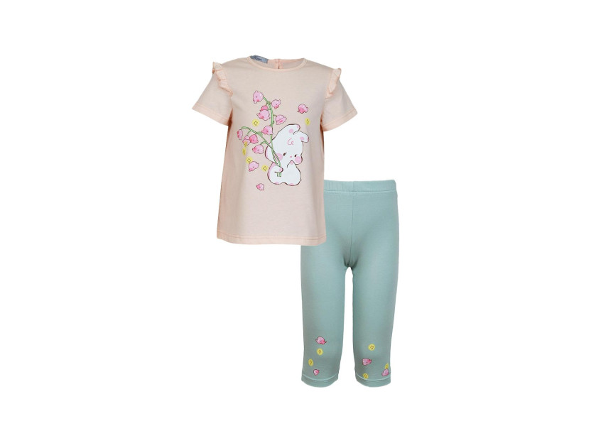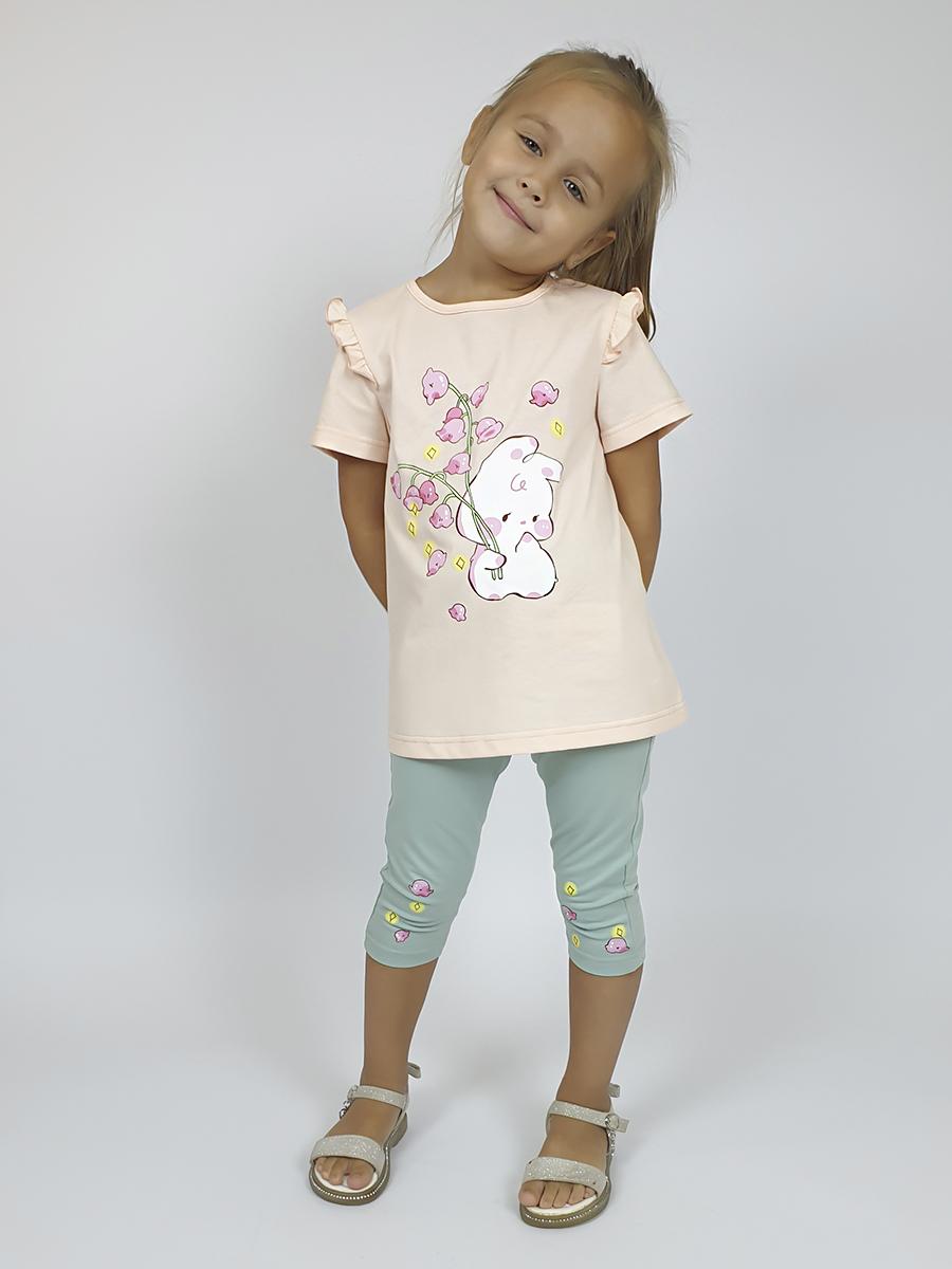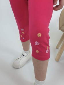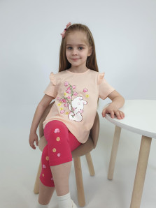 Кулирное полотно: Фуфайка- 100% х/б.,лосины-95% х/б,5% лайкра. Фуфайка-силуэт трапеция,короткий втачной рукав,в пройме рюша.Горловина окантована,застежка на пуговицу по спинке.Печать на переде. Лосины-укороченные с печатью внизу,вверху на резинке.