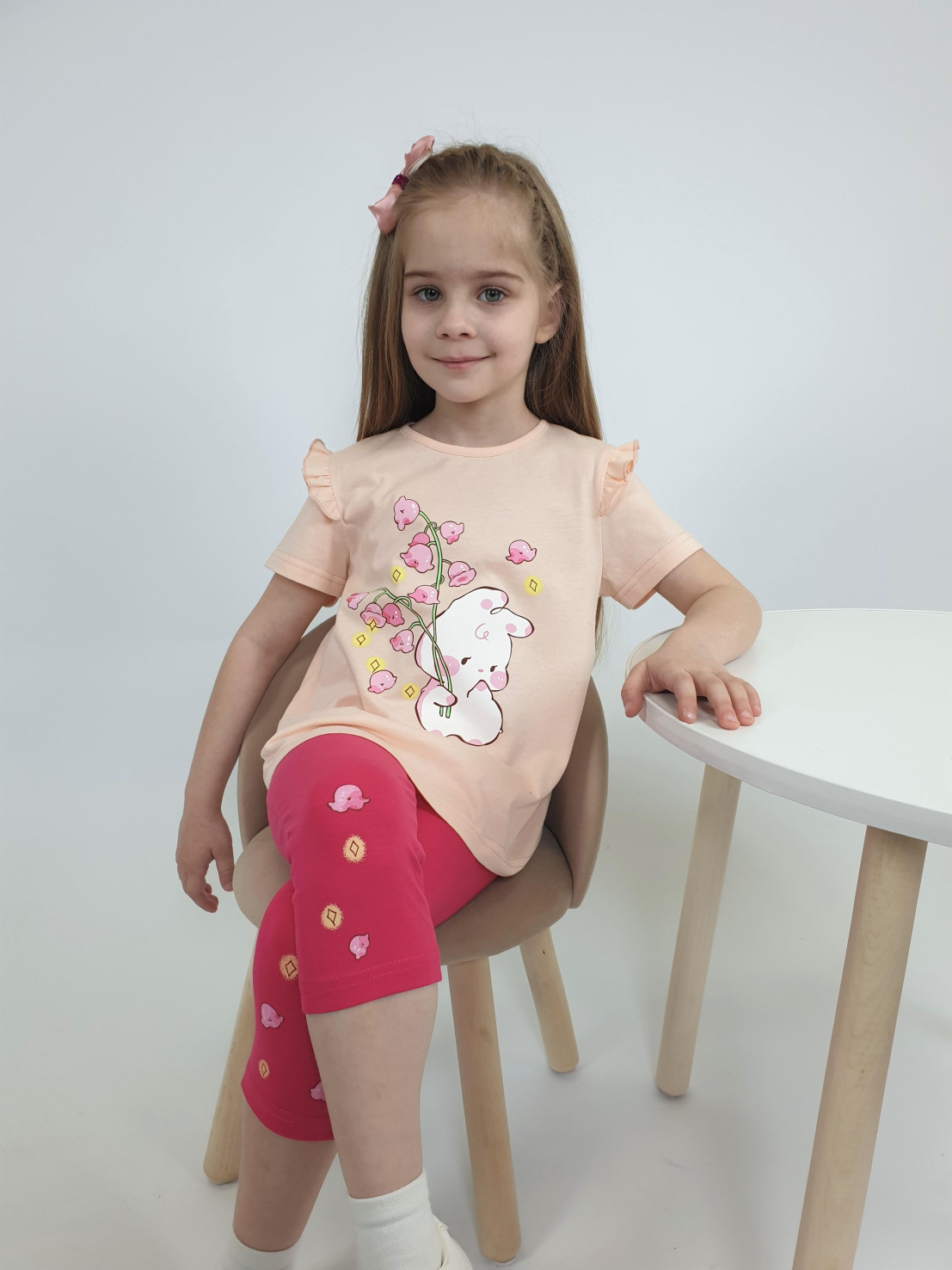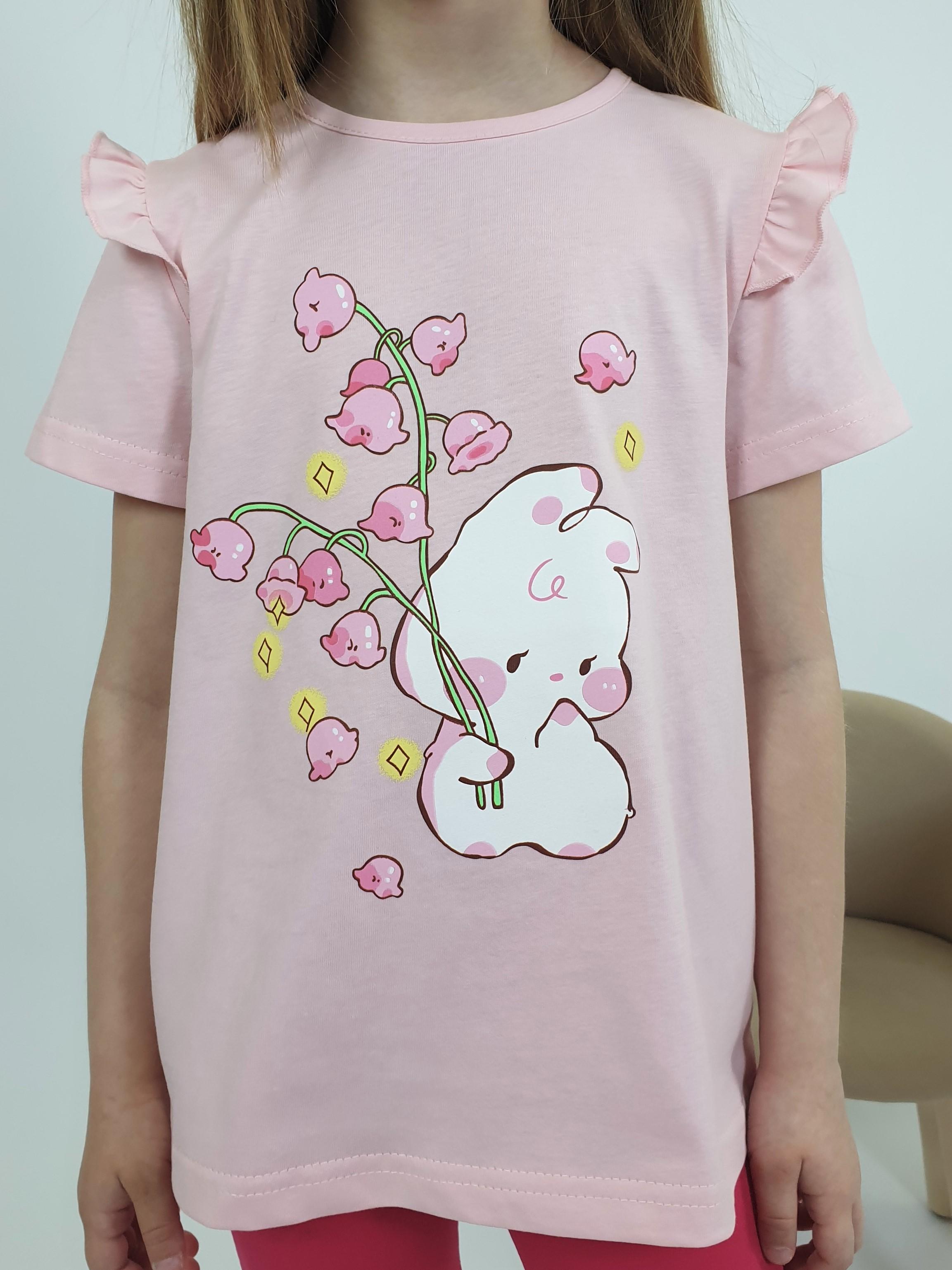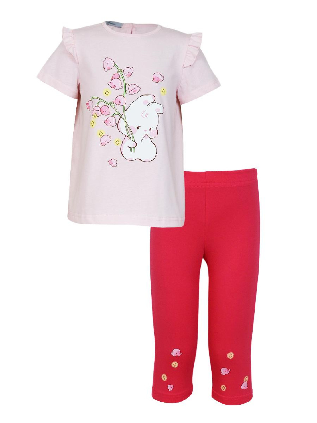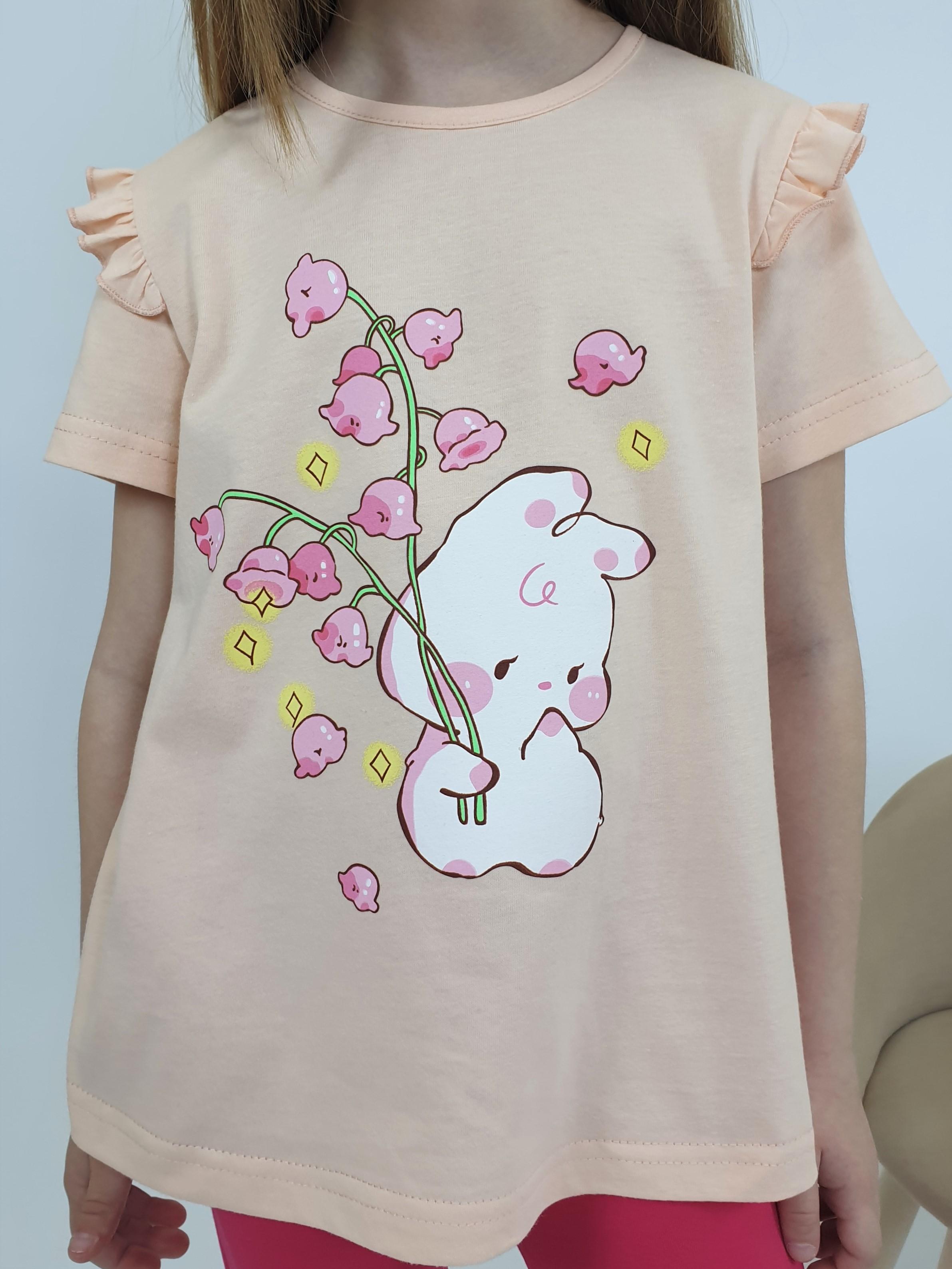 Кулирное полотно: Фуфайка- 100% х/б.,лосины-95% х/б,5% лайкра. Фуфайка-силуэт трапеция,короткий втачной рукав,в пройме рюша.Горловина окантована,застежка на пуговицу по спинке.Печать на переде. Лосины-укороченные с печатью внизу,вверху на резинке.