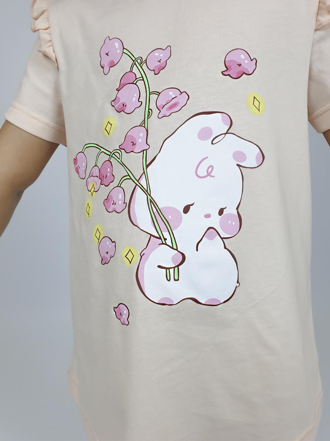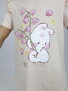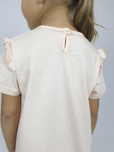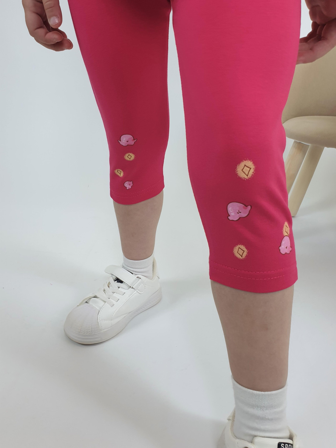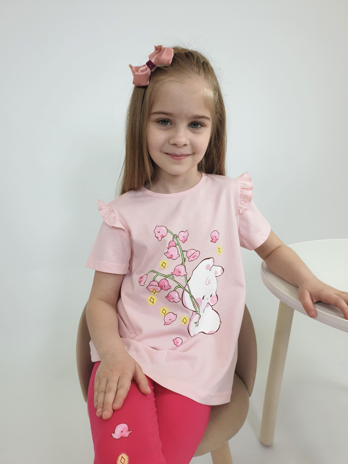 Кулирное полотно: Фуфайка- 100% х/б.,лосины-95% х/б,5% лайкра. Фуфайка-силуэт трапеция,короткий втачной рукав,в пройме рюша.Горловина окантована,застежка на пуговицу по спинке.Печать на переде. Лосины-укороченные с печатью внизу,вверху на резинке.