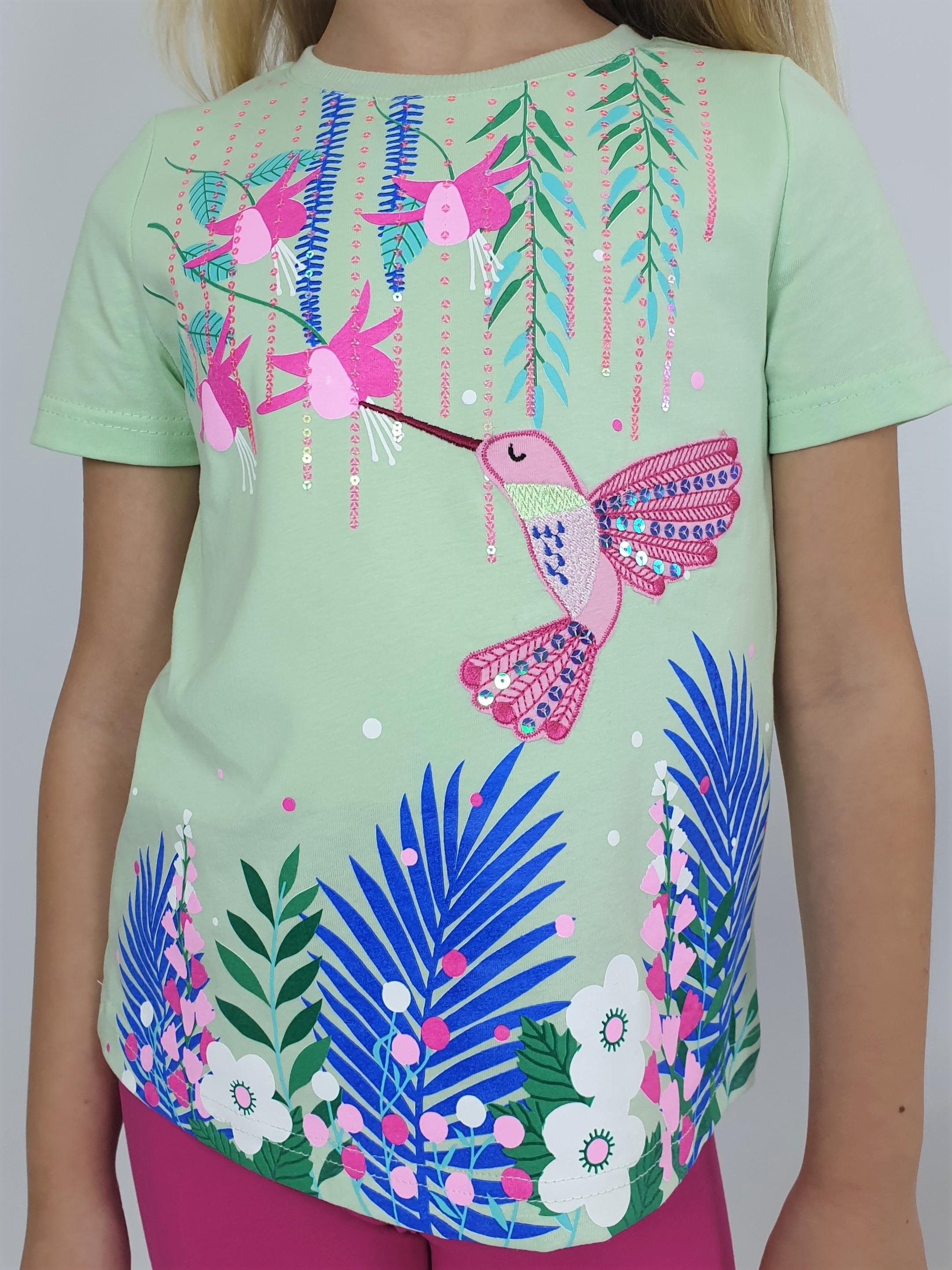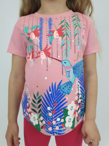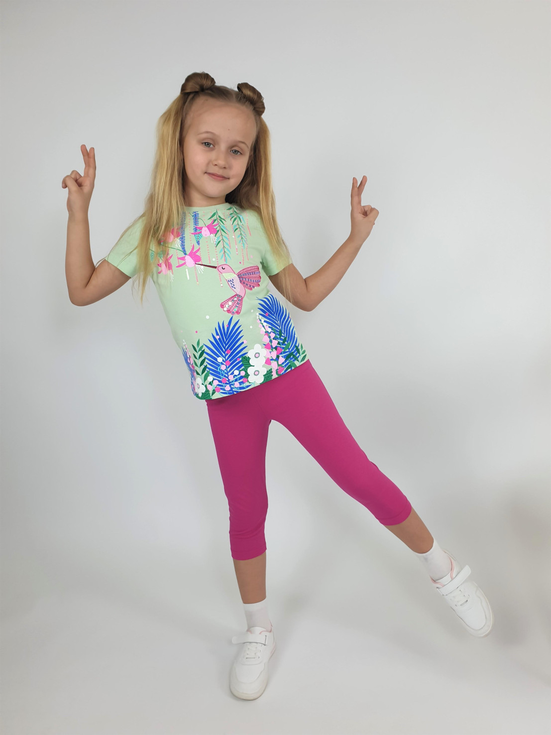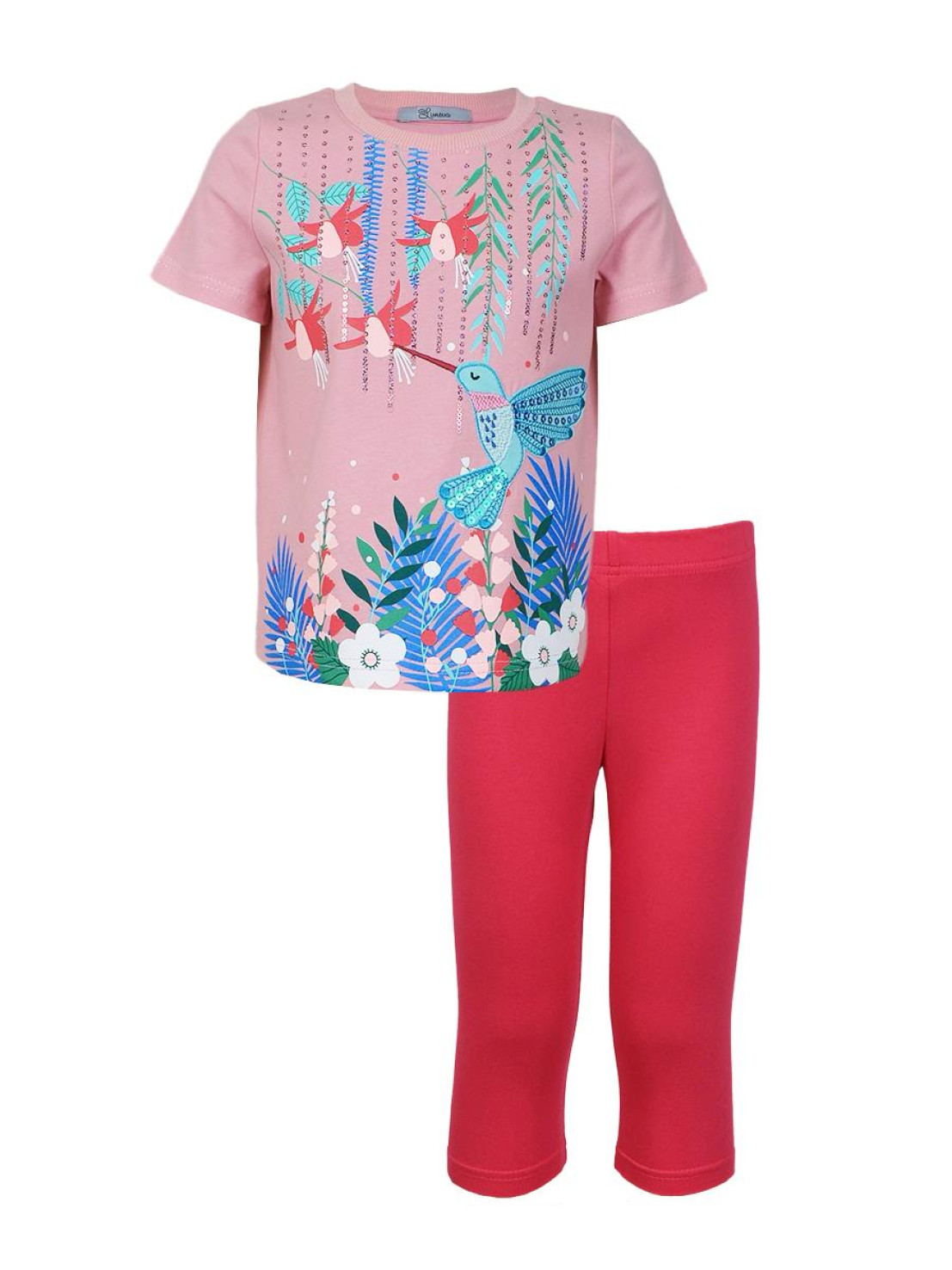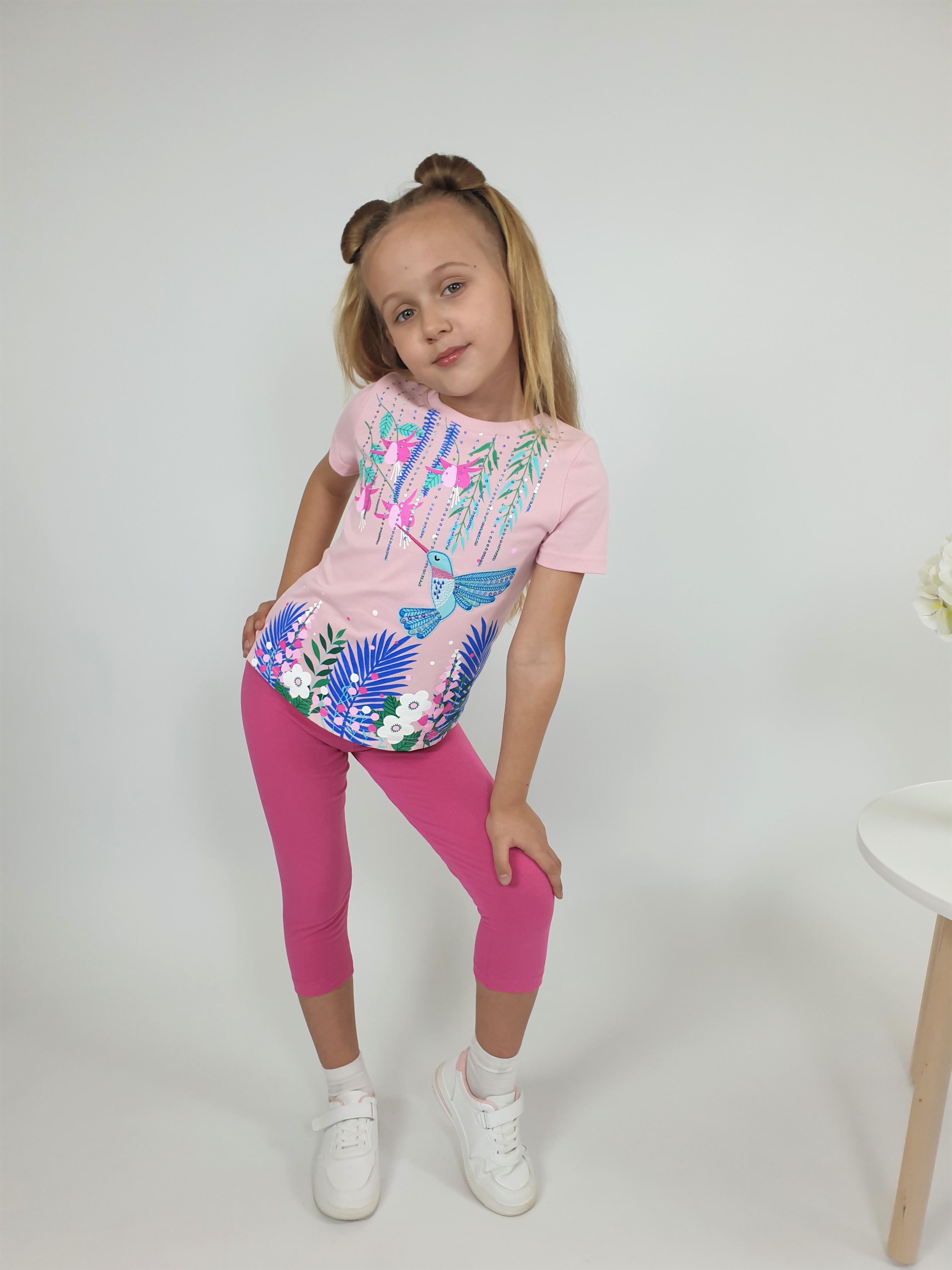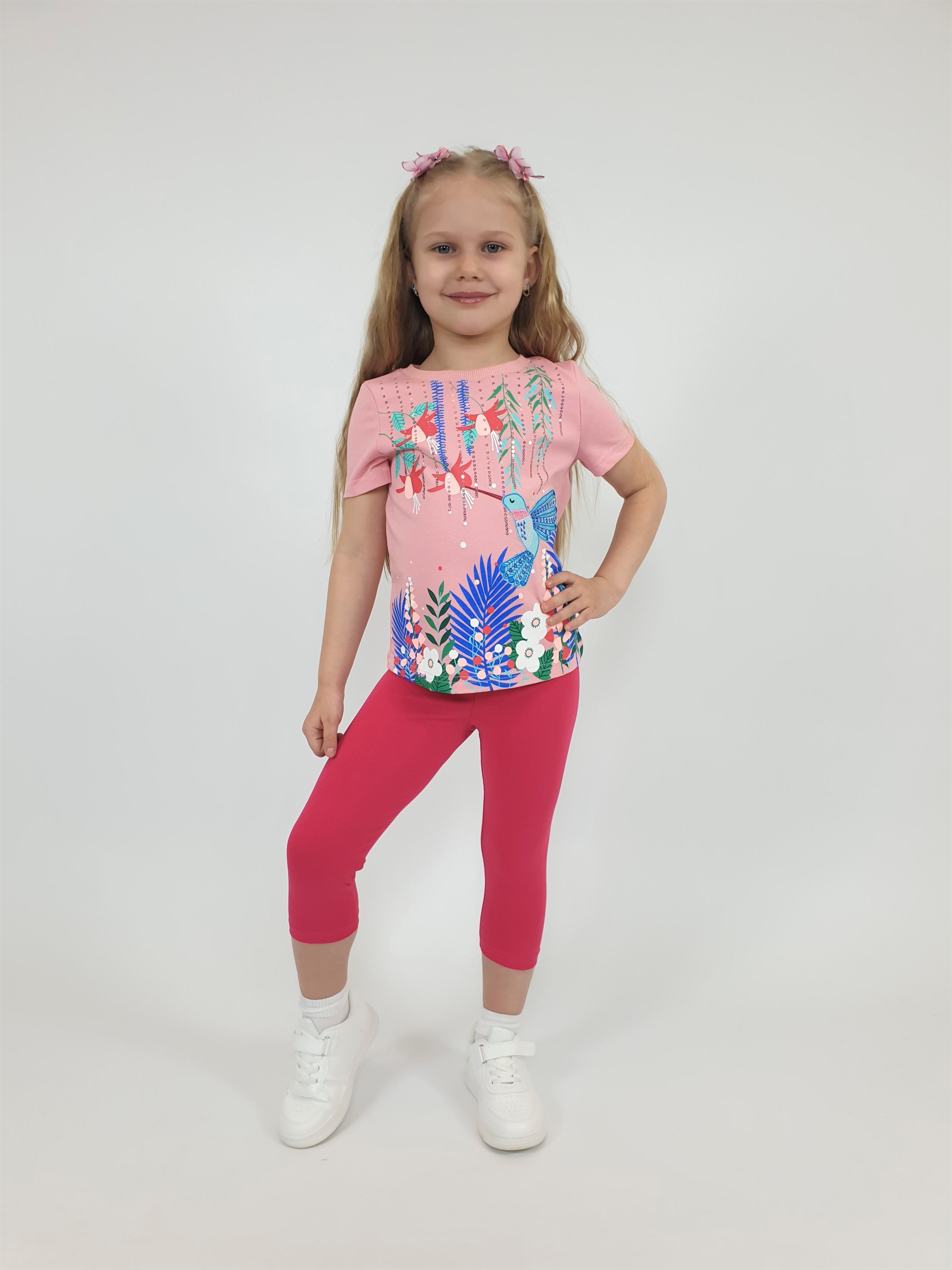 Кулирное полотно:Фуфайка- 100% х/б,лосины-95% х/б,5% лайкра. Фуфайка-прямой силуэт,печать и вышивка на переде(пайетки),короткий втачной рукав.Низ рукава и фуфайки подшит.Горловина обработана ластиком. Лосины-укороченные,вверху на резинке.