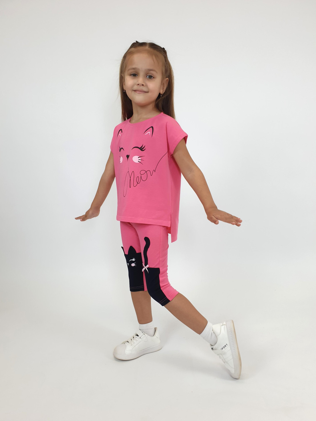 Кулирное полотно:95% х/б,5% лайкра. Фуфайка-прямой силуэт,удлиненная спинка с разрезами,перед с печатью.Спущенное плечо,горловина окантована и подшита. Лосины-укороченные,передние половинки с подрезами.Вышивка-аппликация слева,печать на правой передней стороне.Отделочный бантик.