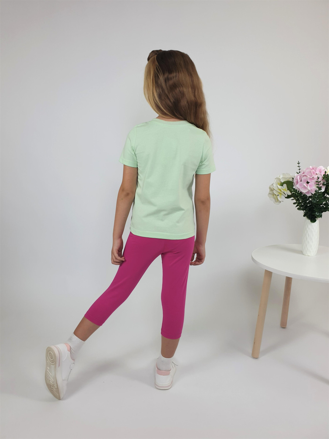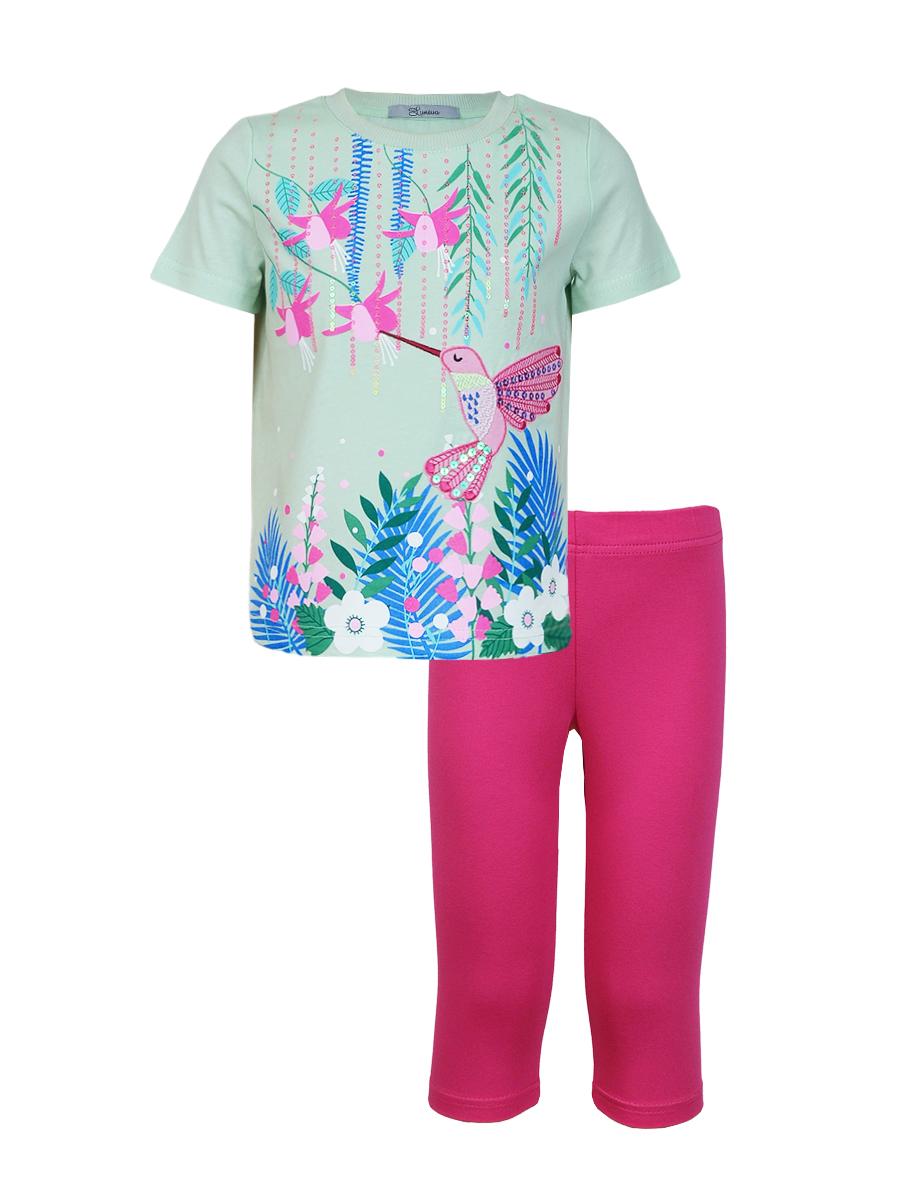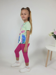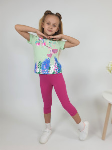 Кулирное полотно:Фуфайка- 100% х/б,лосины-95% х/б,5% лайкра. Фуфайка-прямой силуэт,печать и вышивка на переде(пайетки),короткий втачной рукав.Низ рукава и фуфайки подшит.Горловина обработана ластиком. Лосины-укороченные,вверху на резинке.