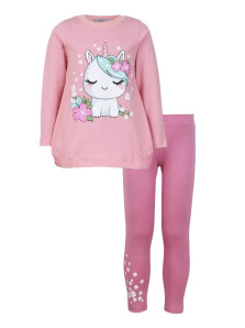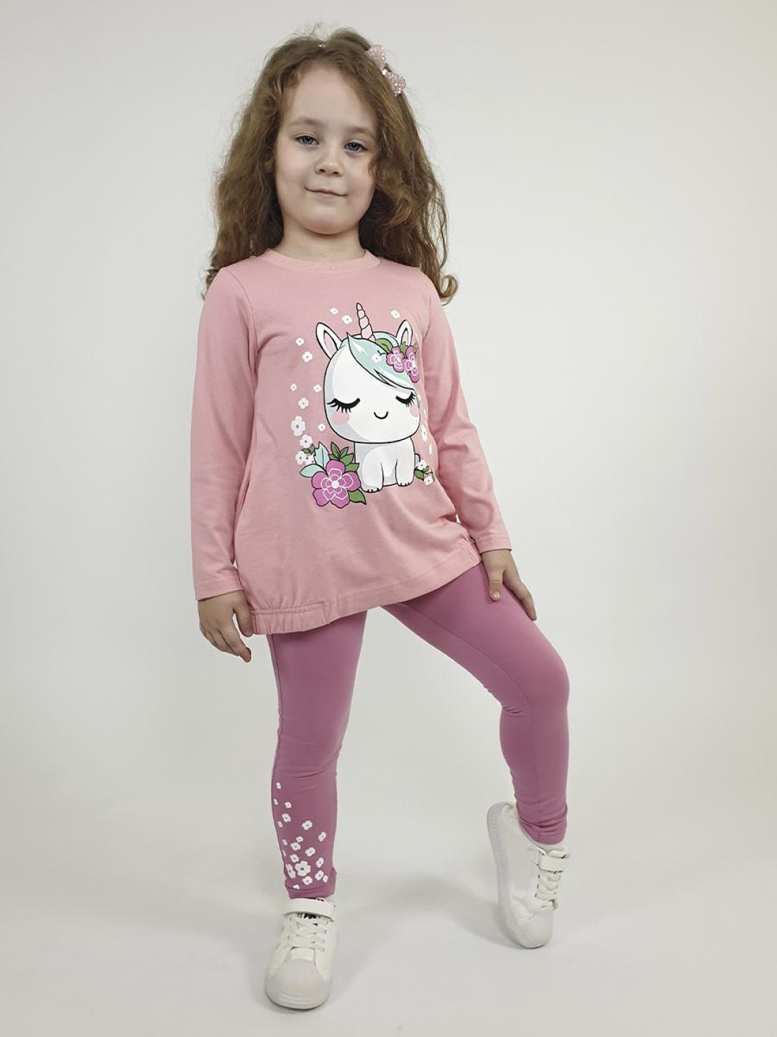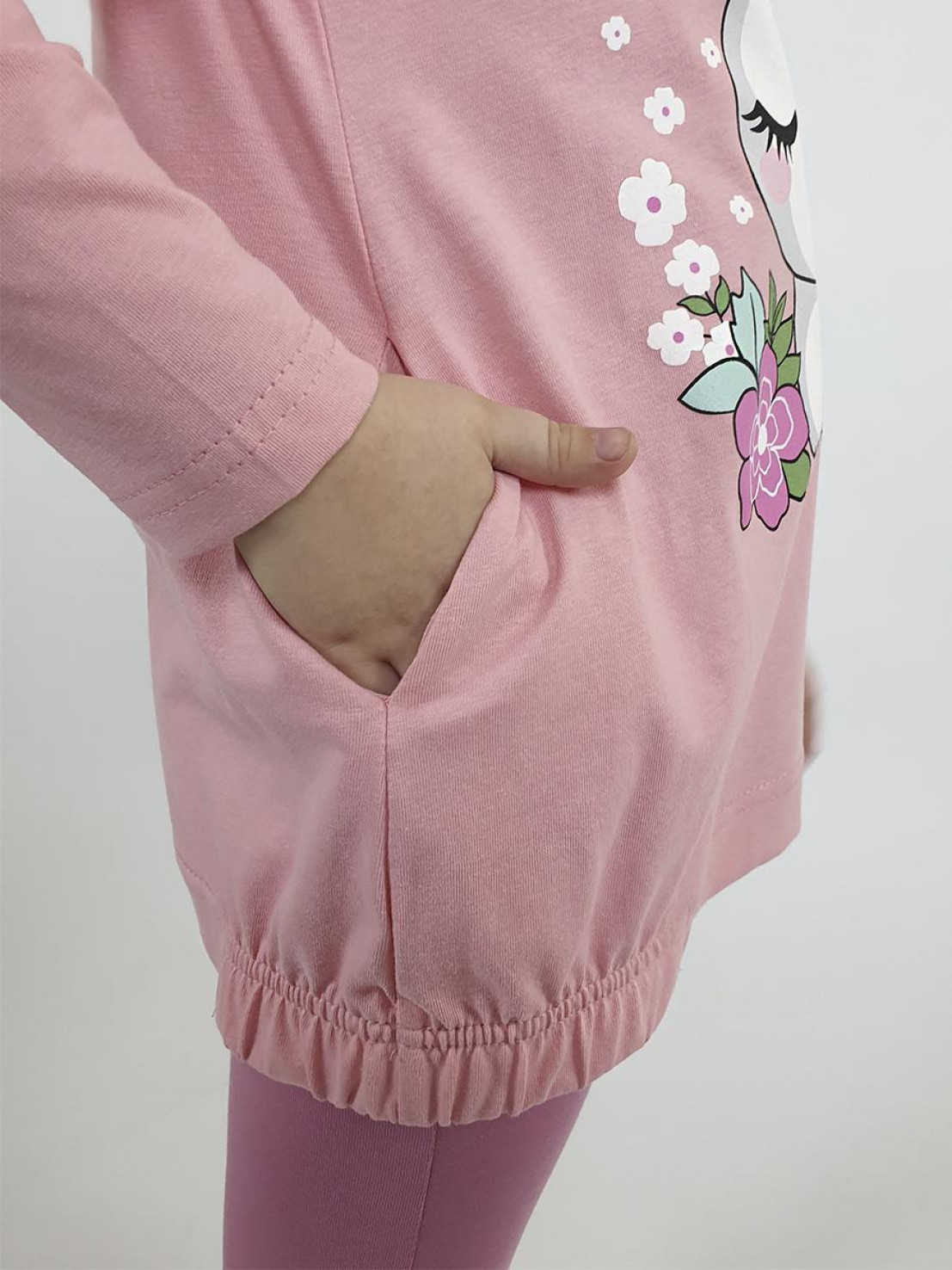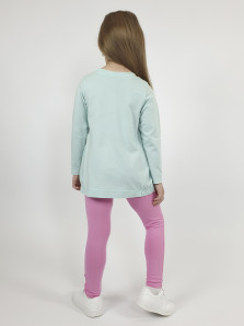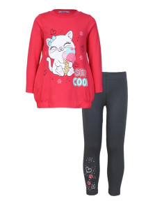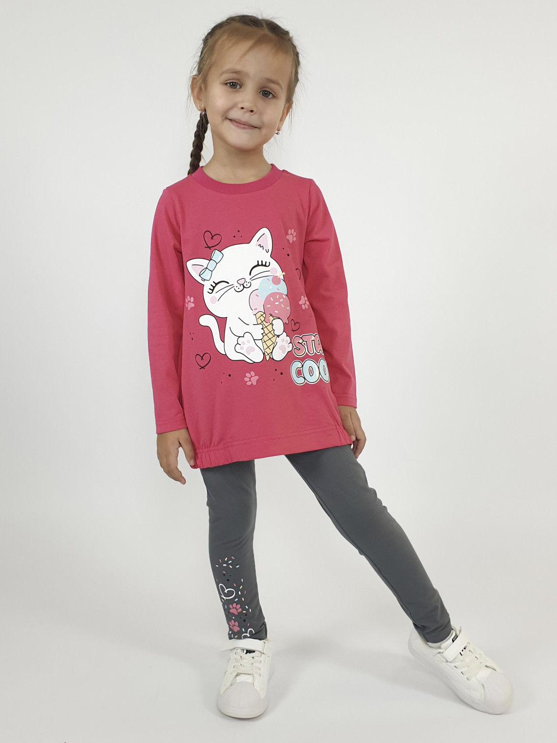 Кулирное полотно:Фуфайка- 100% х/б,лосины-95% х/б,5% лайкра. Фуфайка-свободная,с печатью по переду и двумя карманами в боковых швах.Рукав втачной.длинный.Низ изделия подшит с резинкой по боковым швам.Горловина обработана ластиком. Лосины-длинные с печатью на правой передней половинке внизу.Вверху на резинке.