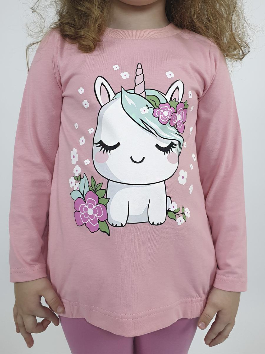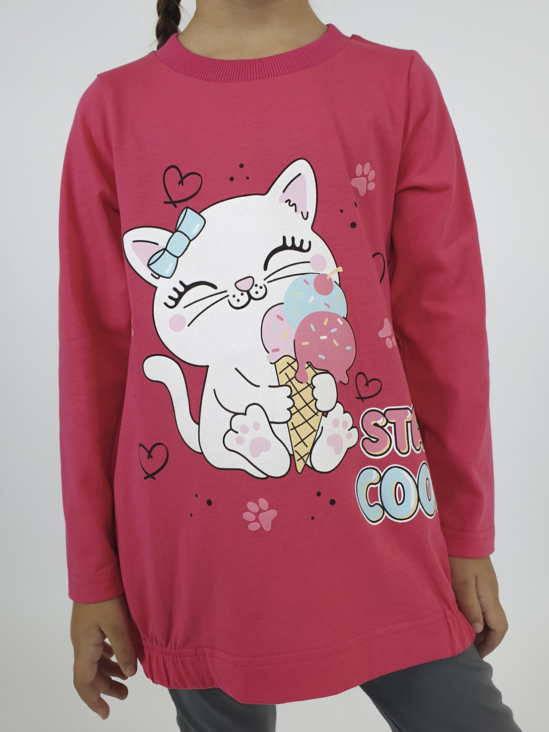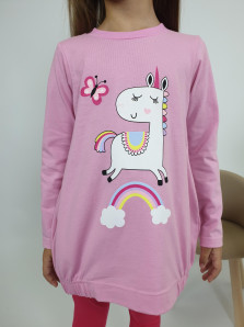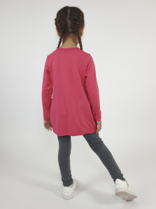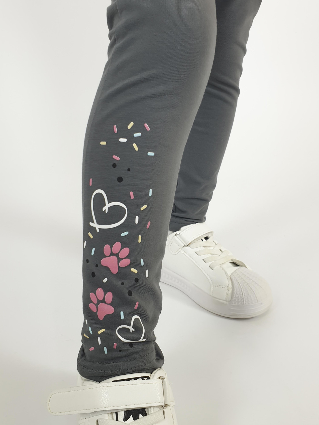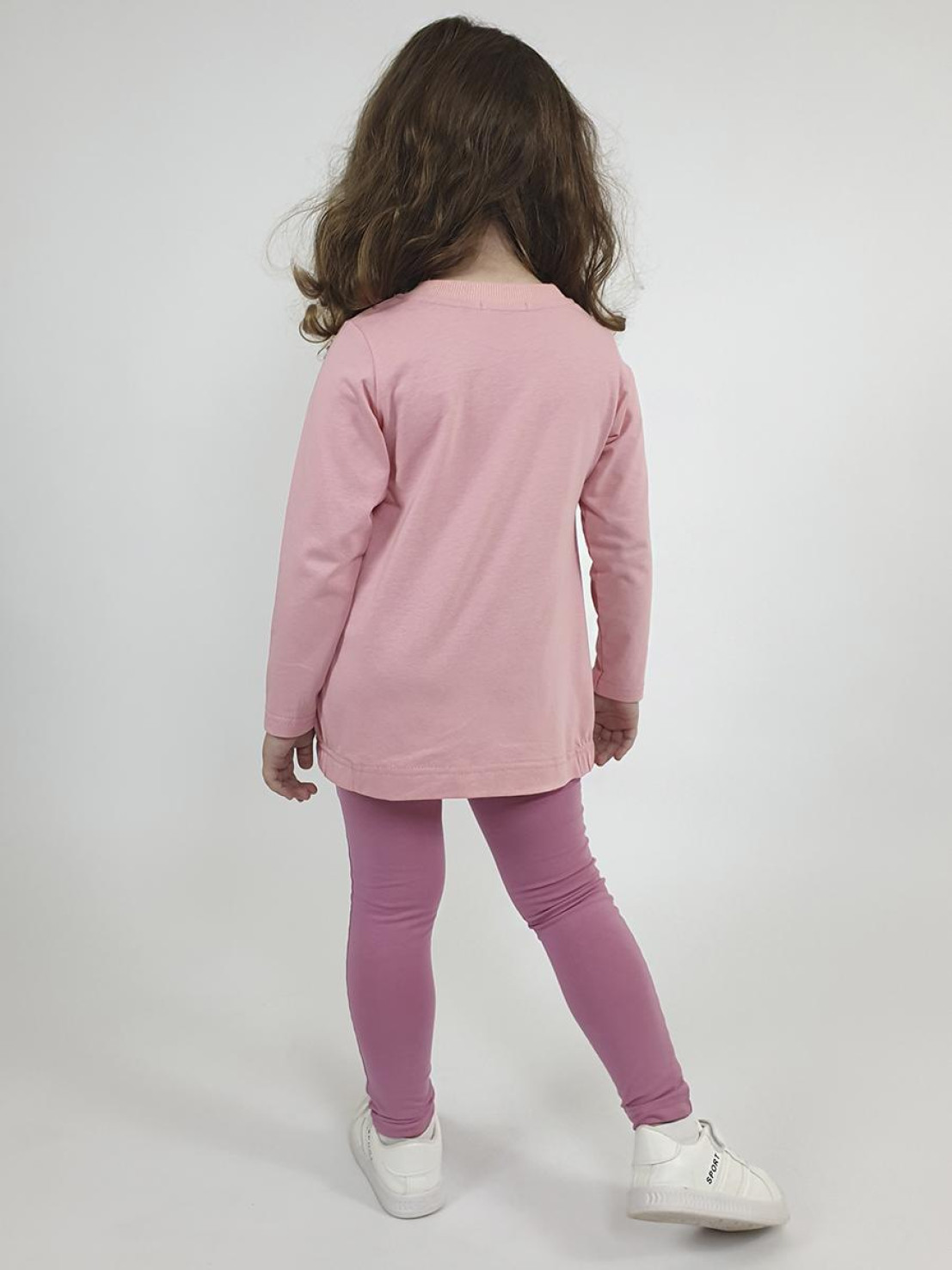 Кулирное полотно:Фуфайка- 100% х/б,лосины-95% х/б,5% лайкра. Фуфайка-свободная,с печатью по переду и двумя карманами в боковых швах.Рукав втачной.длинный.Низ изделия подшит с резинкой по боковым швам.Горловина обработана ластиком. Лосины-длинные с печатью на правой передней половинке внизу.Вверху на резинке.