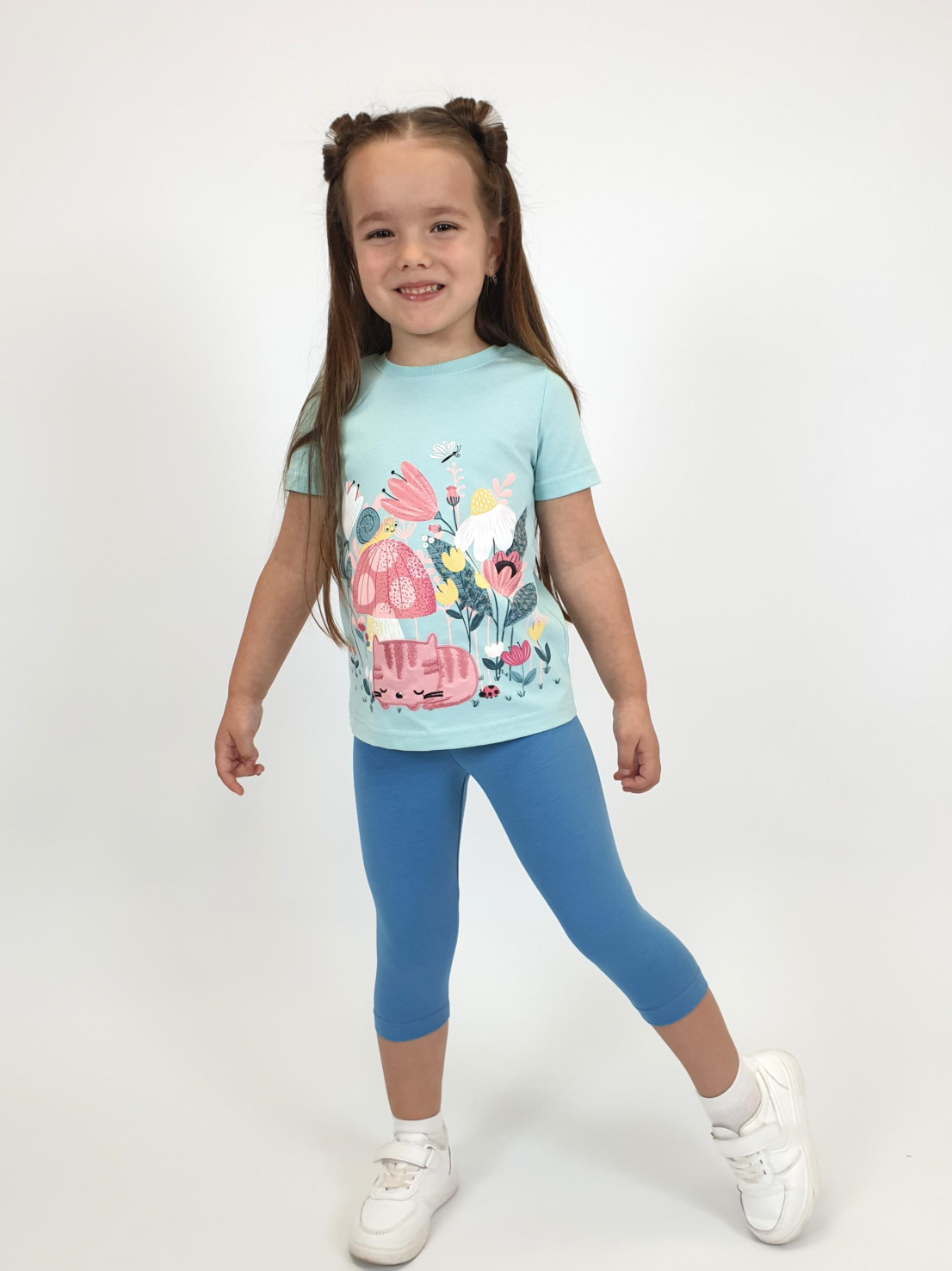 Кулирное полотно: Фуфайка- 100% х/б.,лосины-95% х/б,5% лайкра. Фуфайка-прямой силуэт,печать и вышивка на переде,короткий втачной рукав.Низ рукава и фуфайки подшит.Горловина обработана ластиком. Лосины-укороченные,вверху на резинке.