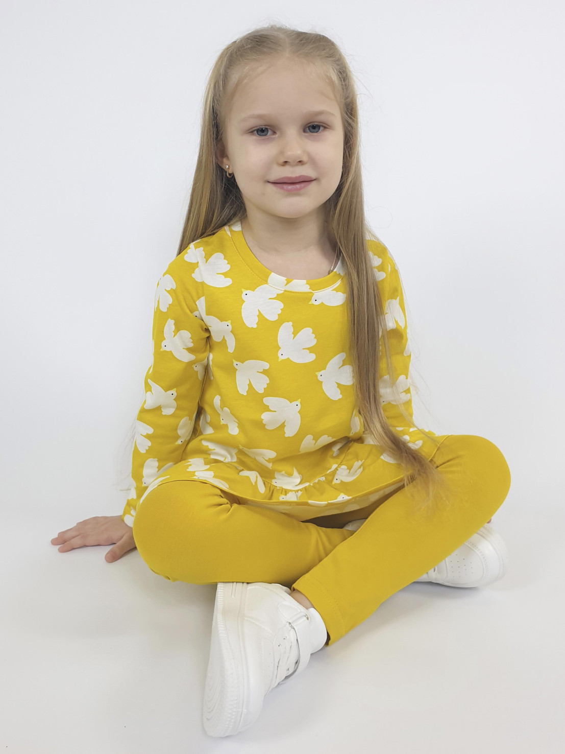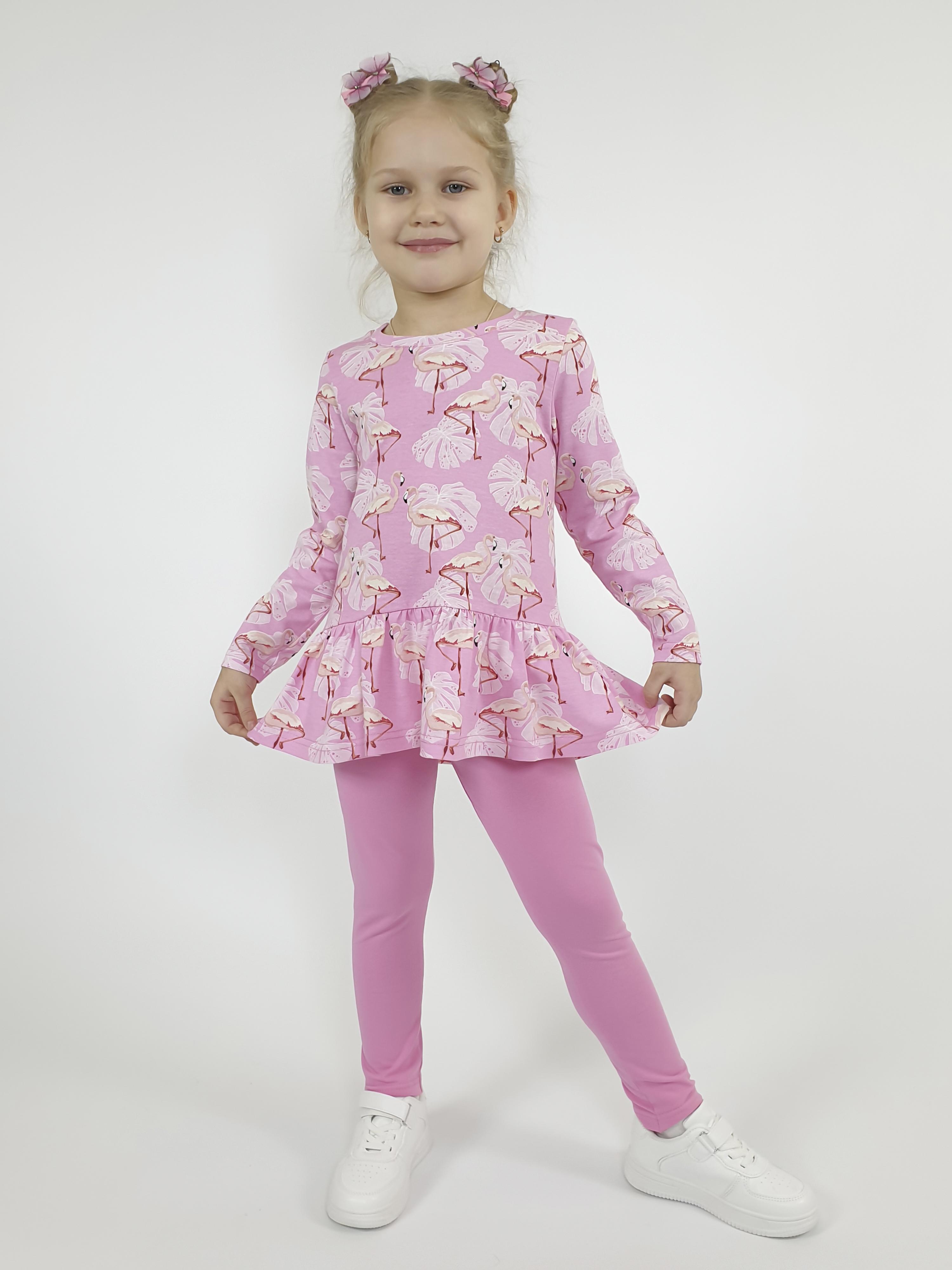 Кулирное полотно:фуфайка 100% х/б.,лосины 95% х/б,5% лайкра. Фуфайка-силуэт трапеция,внизу волан.Рукав втачной,длинный.Горловина обработана планкой. Лосины-длинные,вверху на резинке.