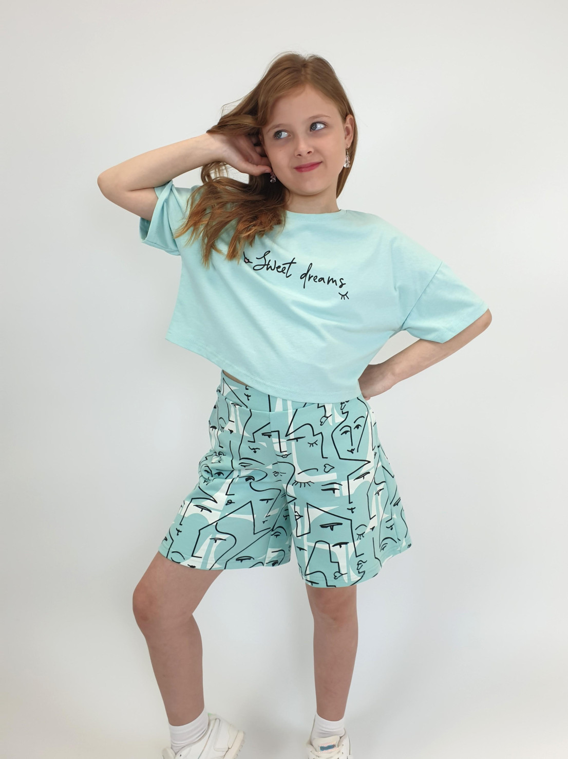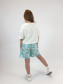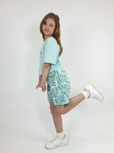 Фуфайка-кулирное полотно:100% х/б. Шорты-футер двух нитка:75% х/б,25% п/э. Фуфайка(оверсайз)-укороченная,спущенное плечо,короткий рукав.Печать-перед и левый рукав,горловина обработана планкой. Шорты-короткие,два боковых кармана,пояс на резинке сзади.