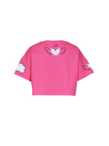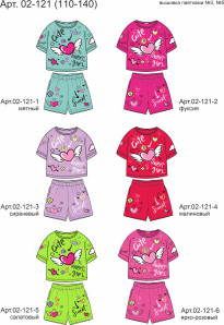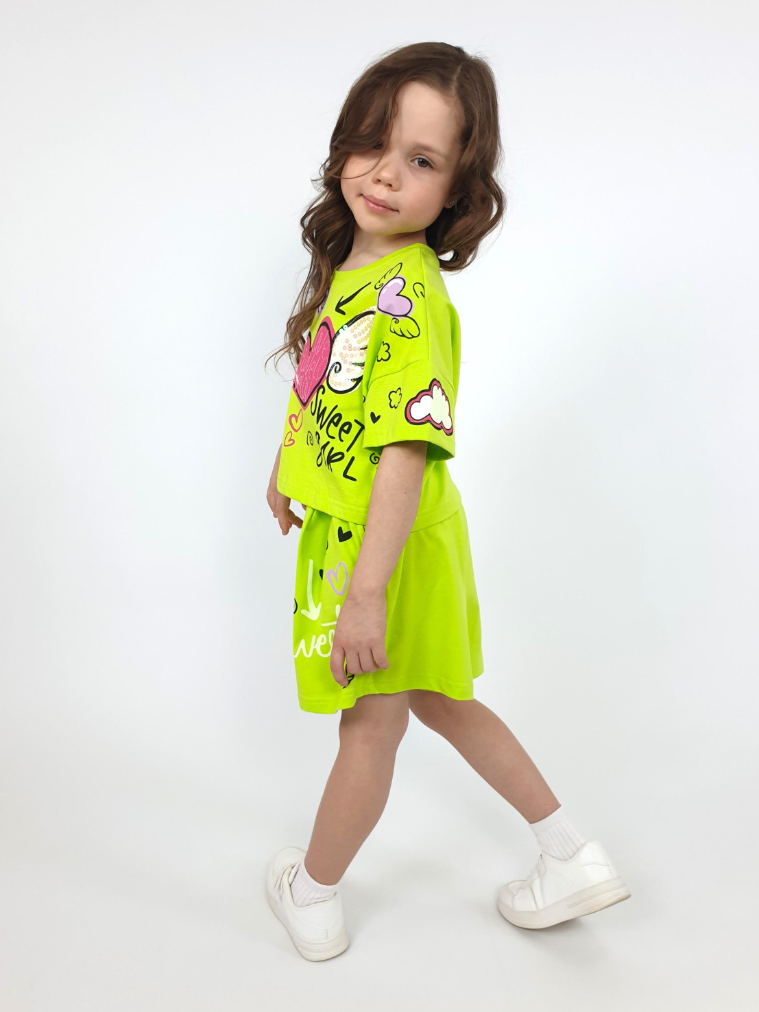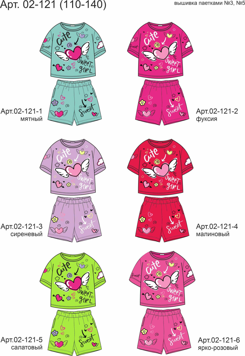 Кулирное полотно:100% х/б. Фуфайка(оверсайз)-укороченная,спущенное плечо,короткий рукав.Печать и вышивка(пайетки) на переде,горловина обработана планкой. Шорты-короткие,складки спереди,два боковых кармана,пояс на резинке.Печать на переде.