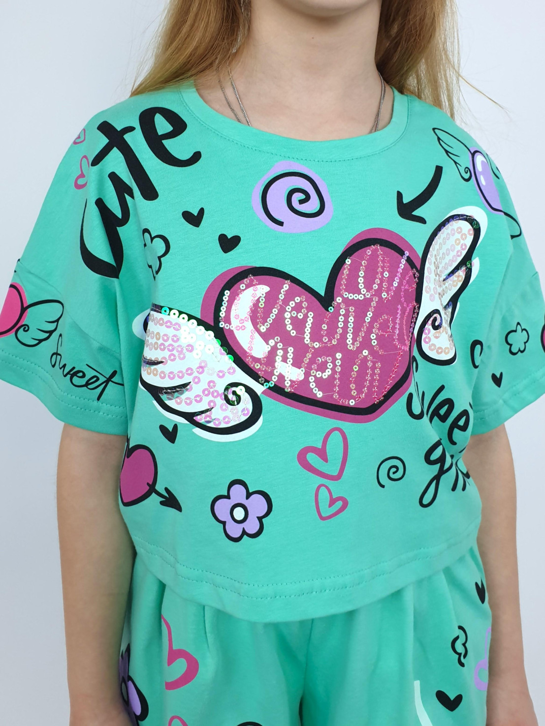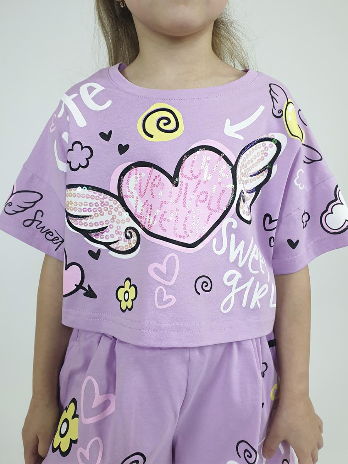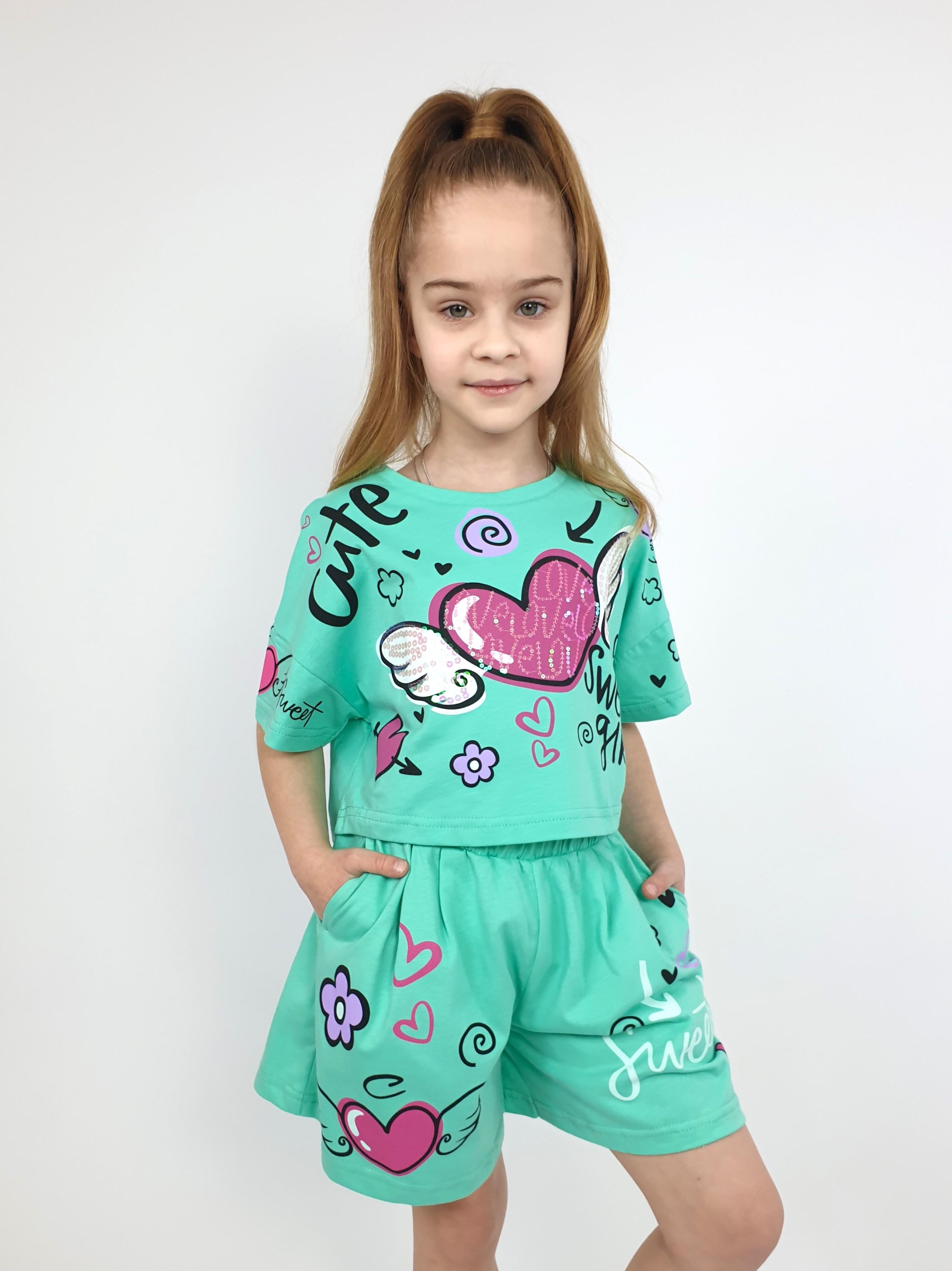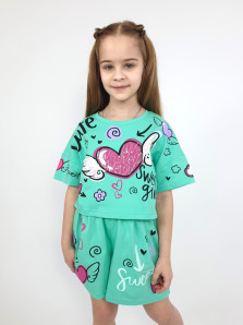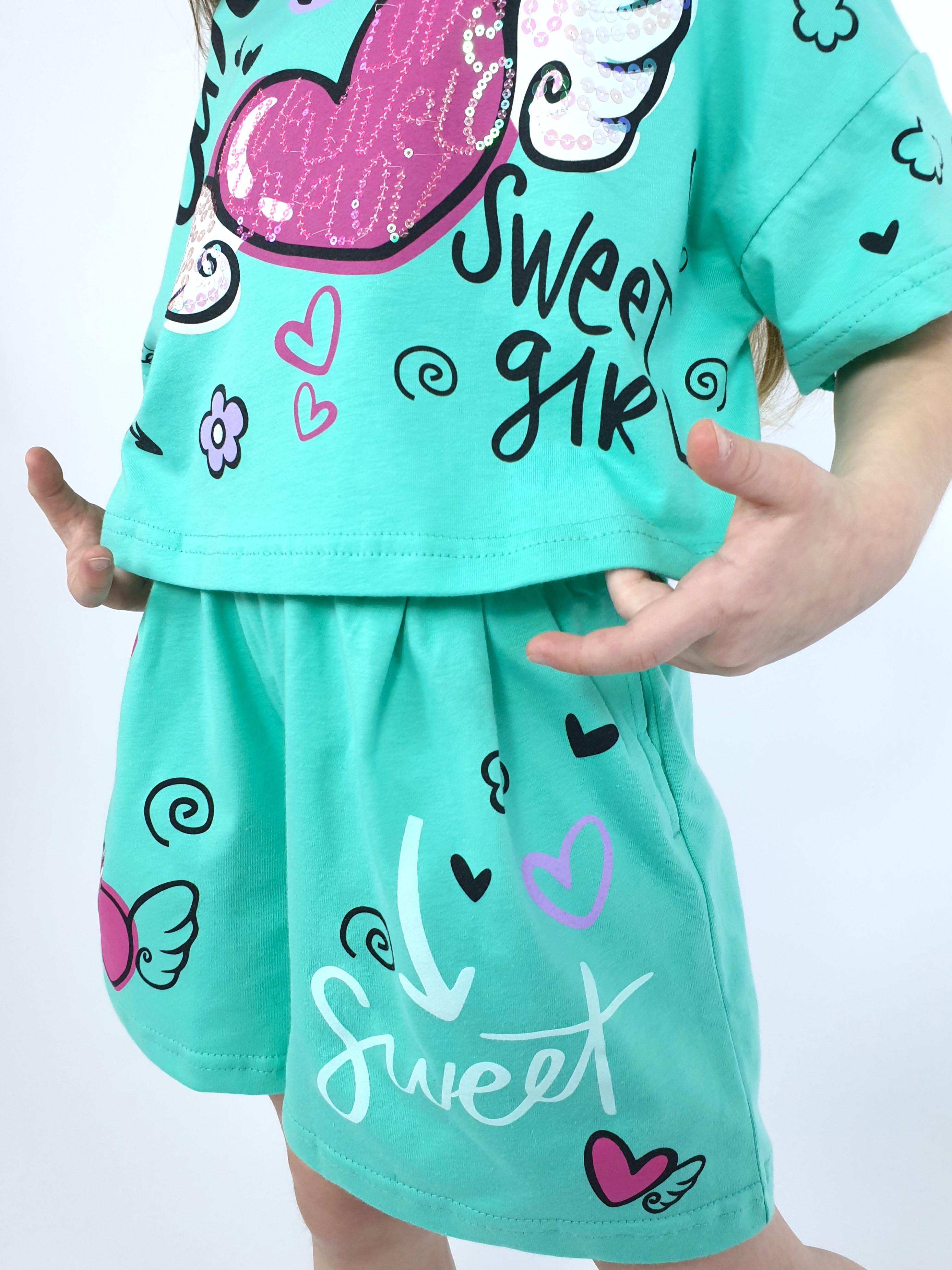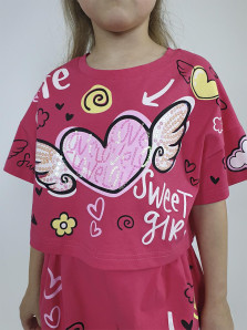 Кулирное полотно:100% х/б. Фуфайка(оверсайз)-укороченная,спущенное плечо,короткий рукав.Печать и вышивка(пайетки) на переде,горловина обработана планкой. Шорты-короткие,складки спереди,два боковых кармана,пояс на резинке.Печать на переде.