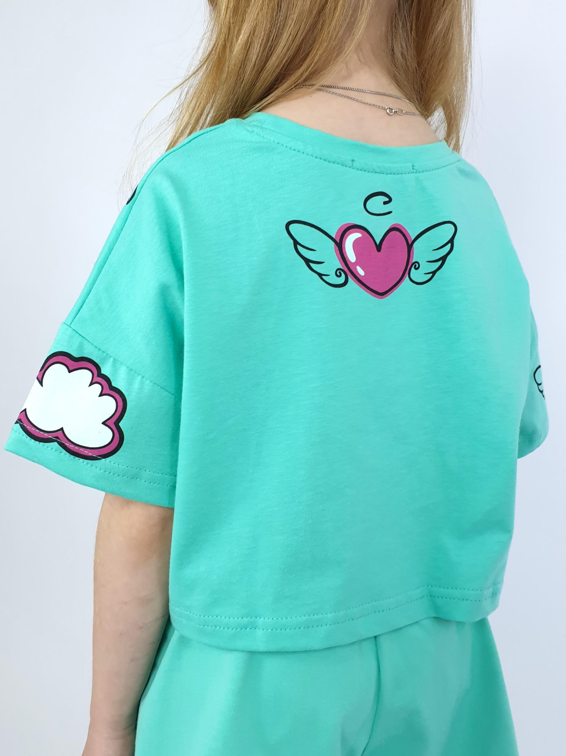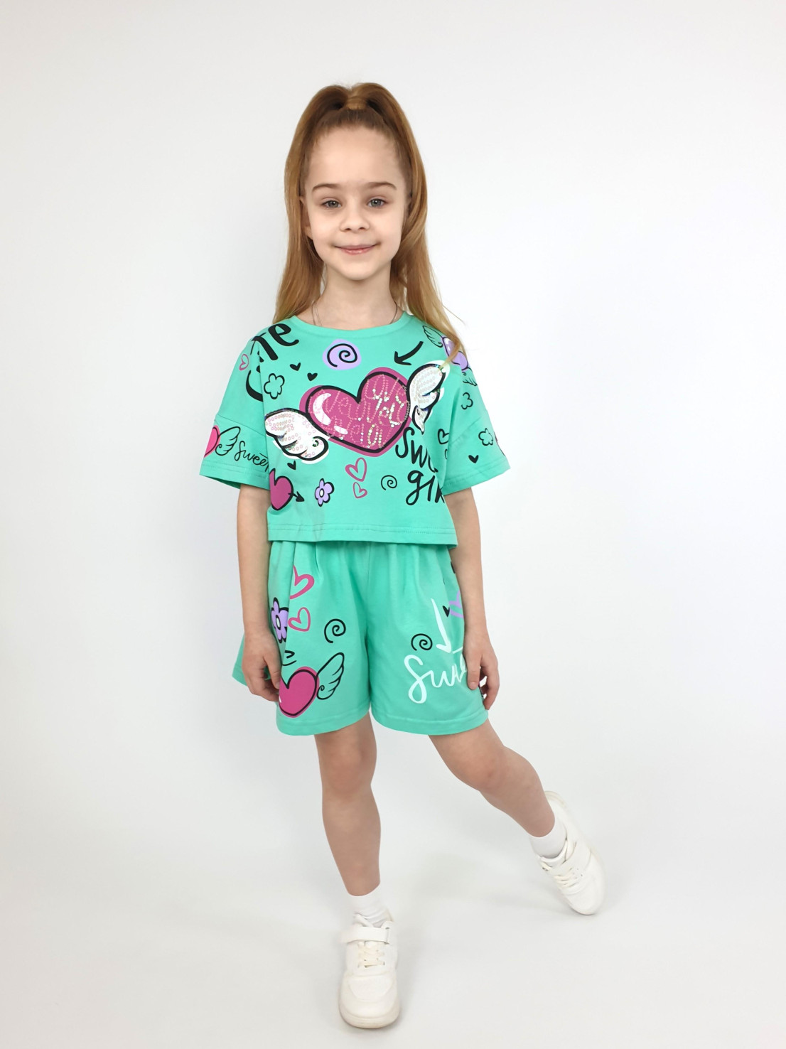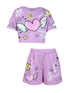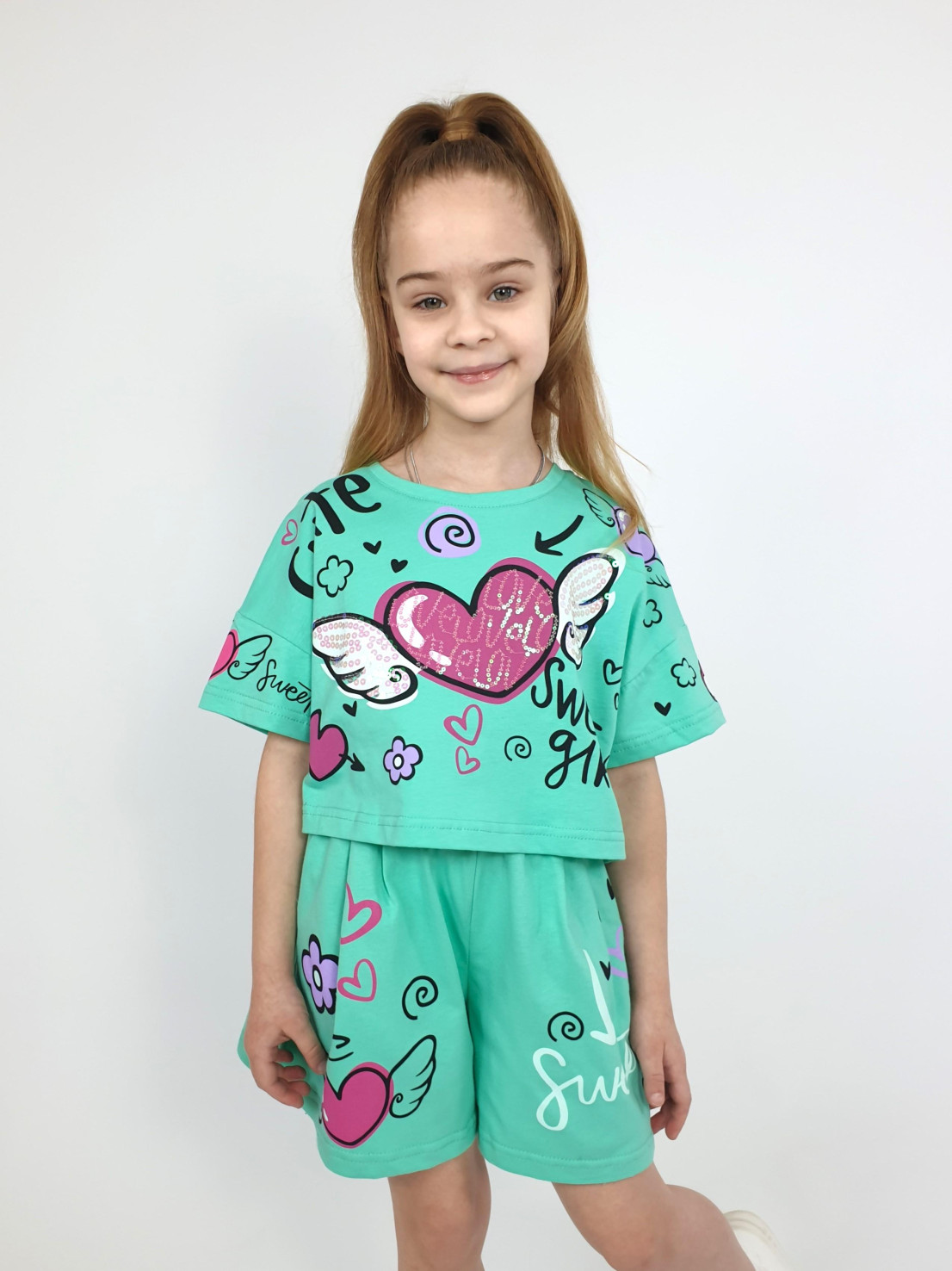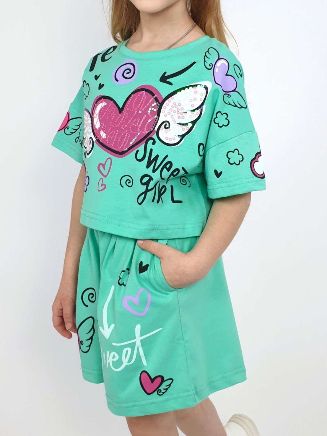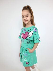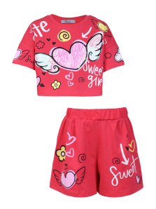 Кулирное полотно:100% х/б. Фуфайка(оверсайз)-укороченная,спущенное плечо,короткий рукав.Печать и вышивка(пайетки) на переде,горловина обработана планкой. Шорты-короткие,складки спереди,два боковых кармана,пояс на резинке.Печать на переде.