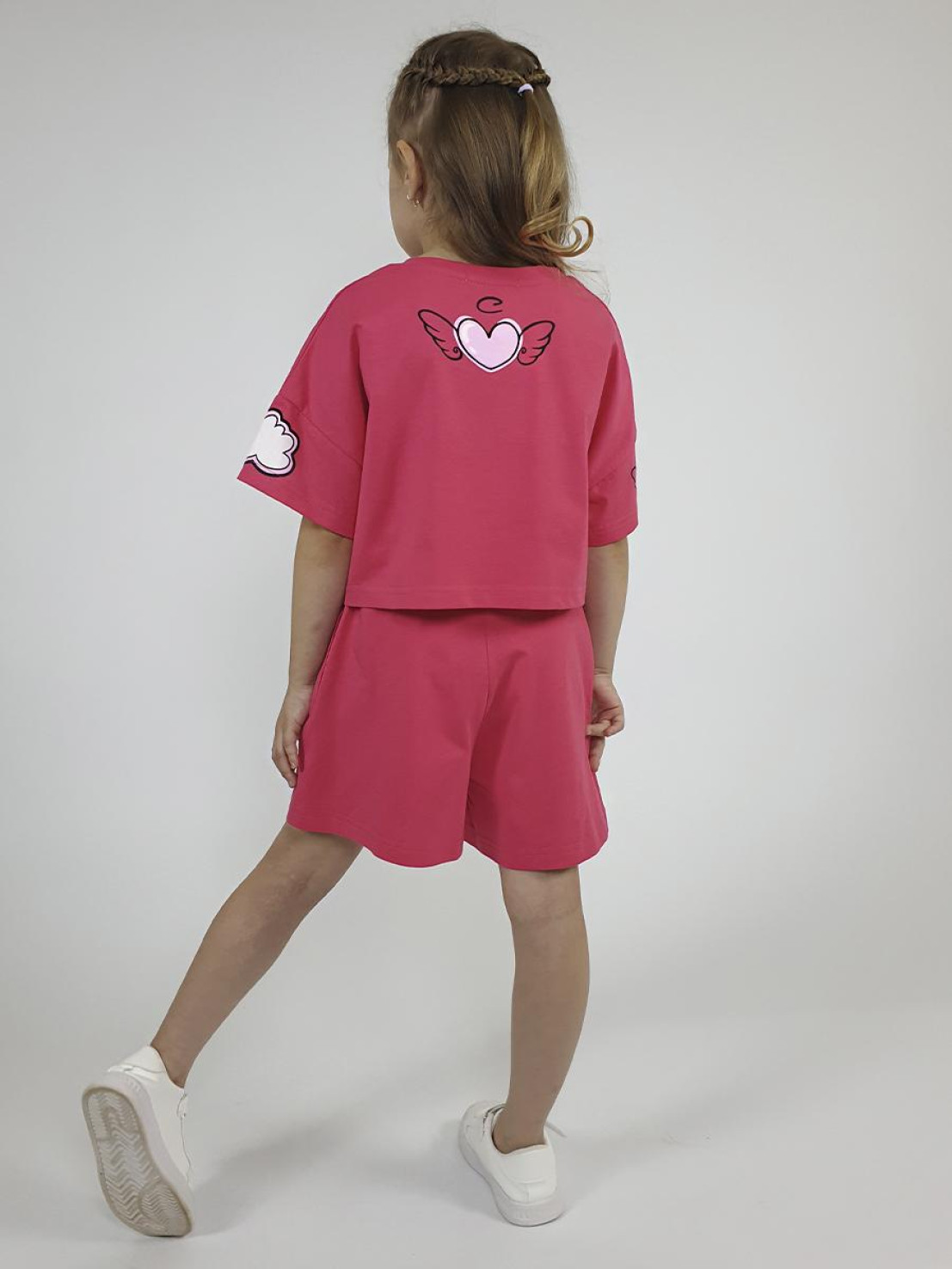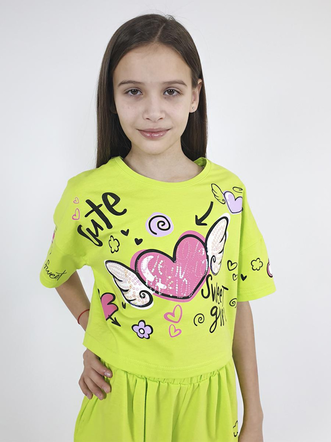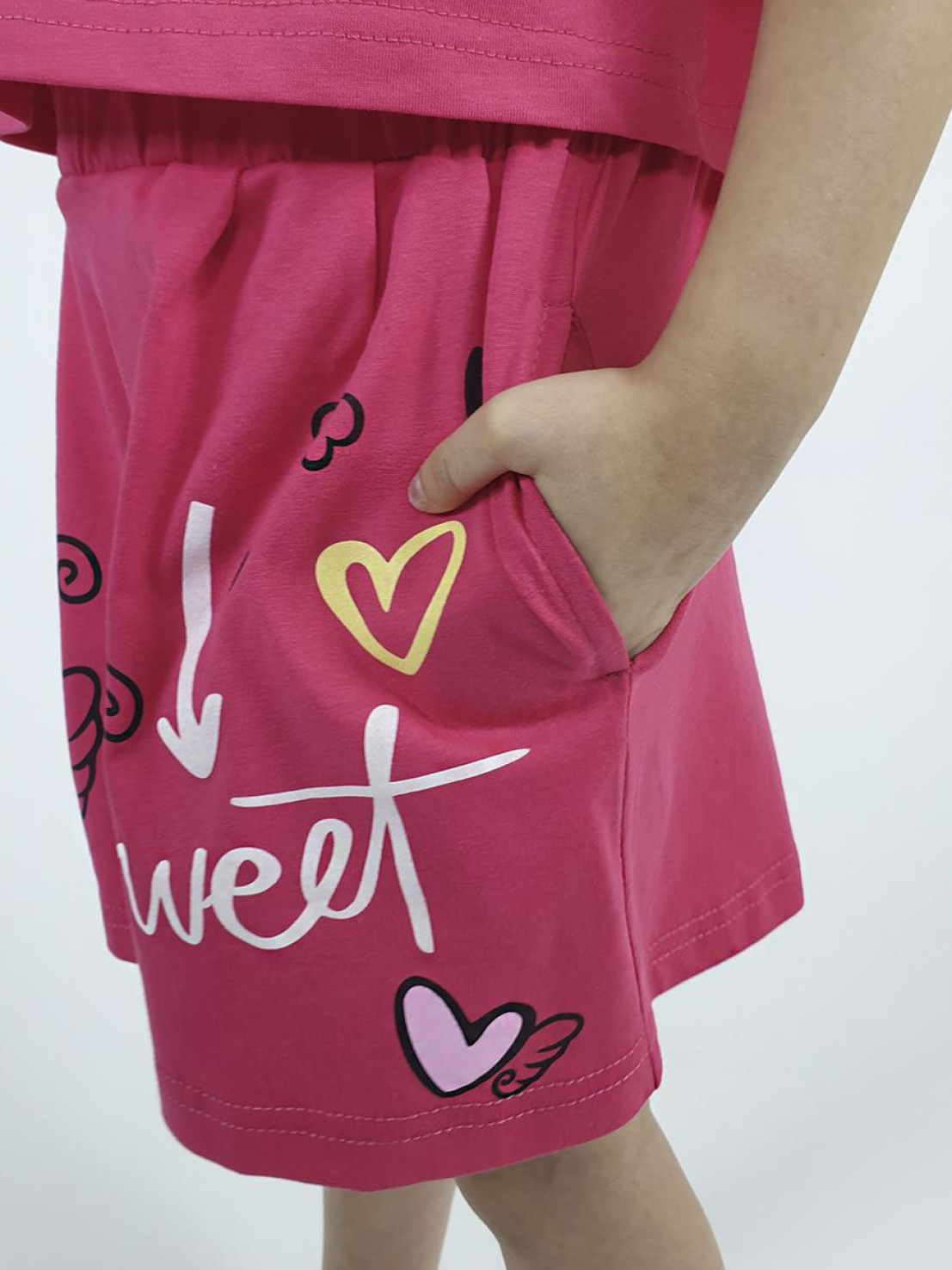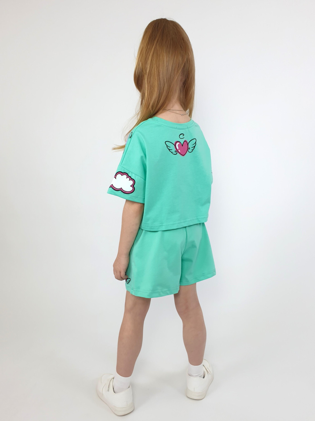 Кулирное полотно:100% х/б. Фуфайка(оверсайз)-укороченная,спущенное плечо,короткий рукав.Печать и вышивка(пайетки) на переде,горловина обработана планкой. Шорты-короткие,складки спереди,два боковых кармана,пояс на резинке.Печать на переде.