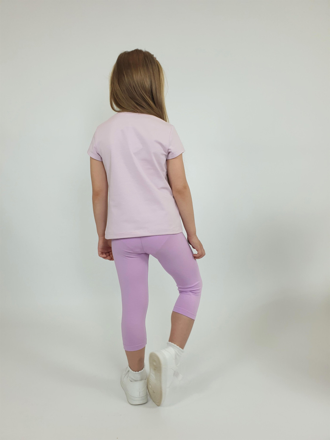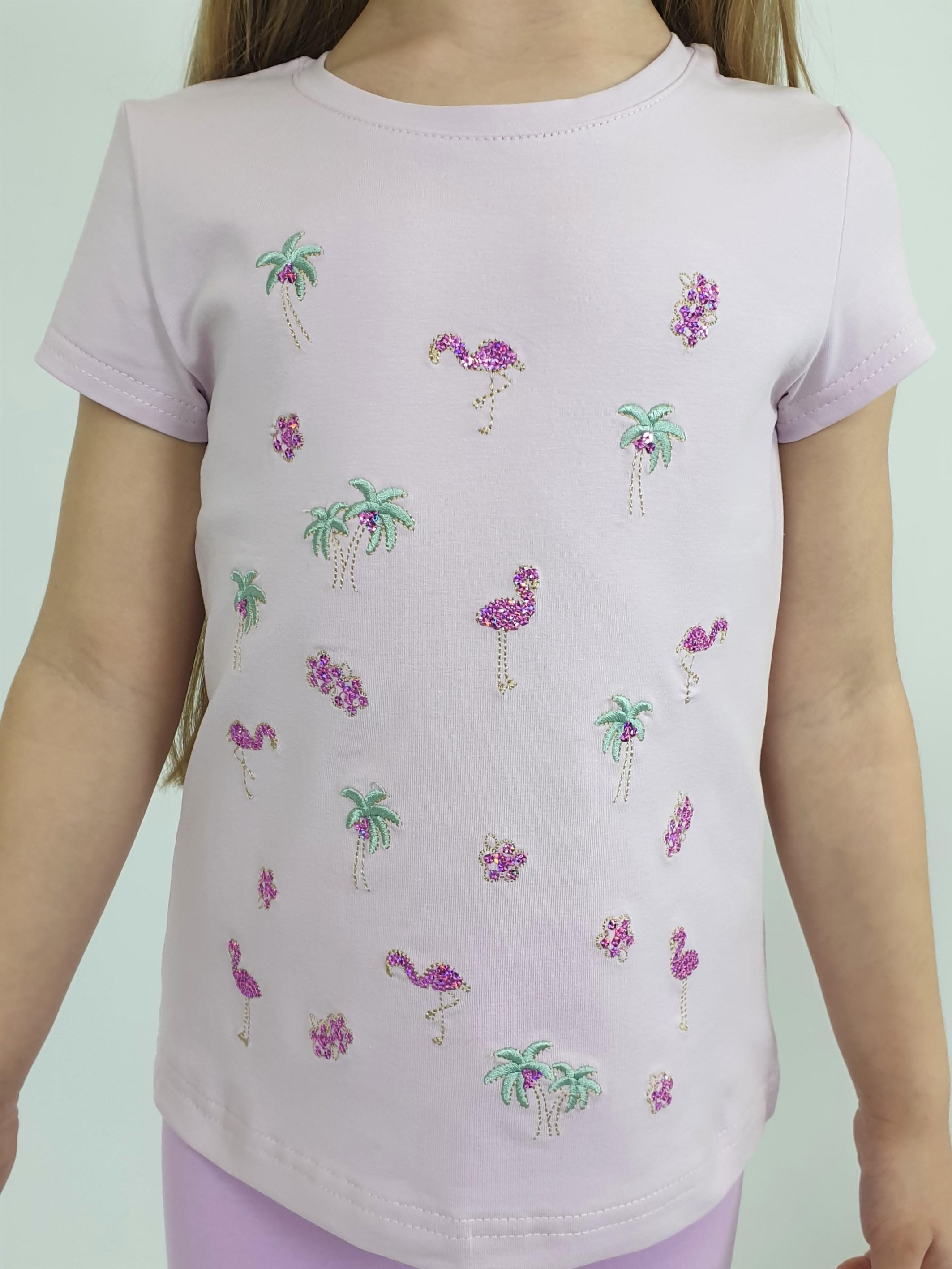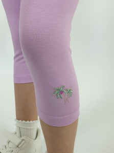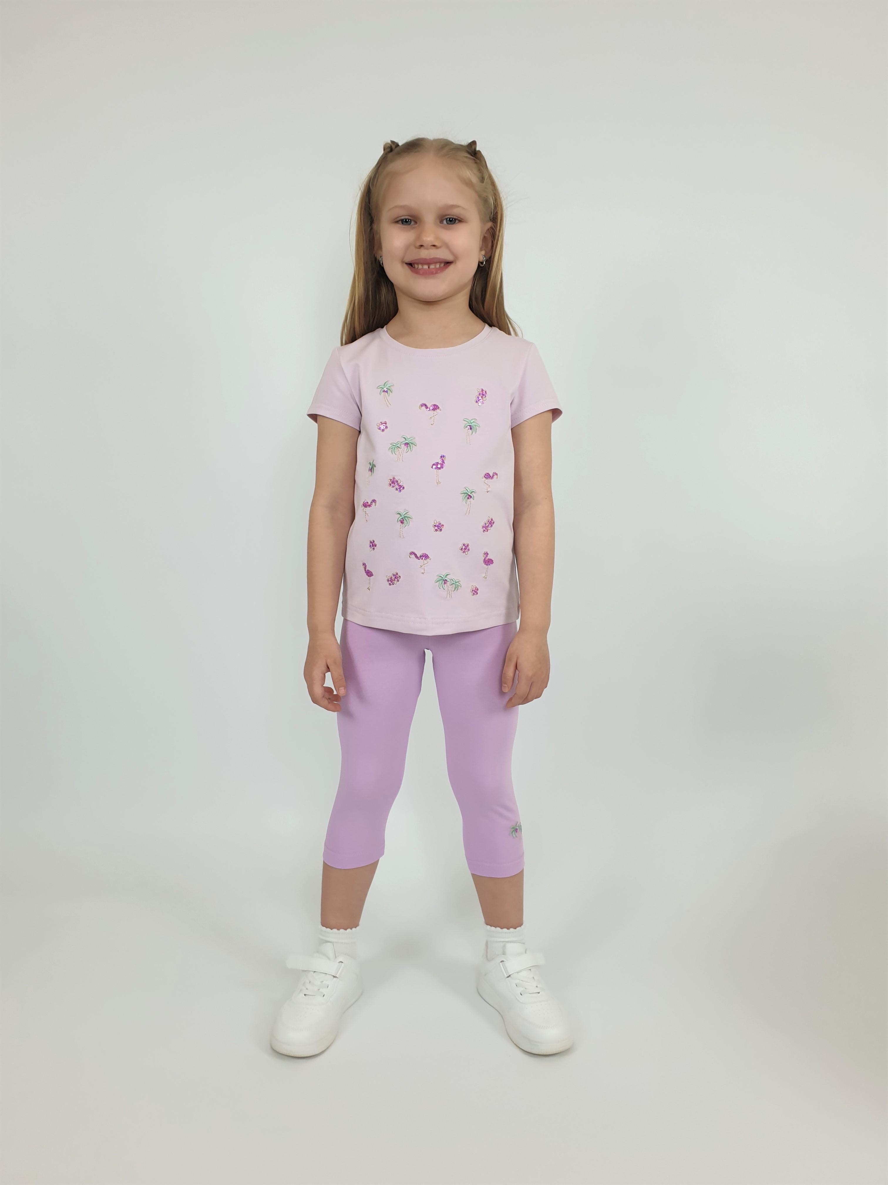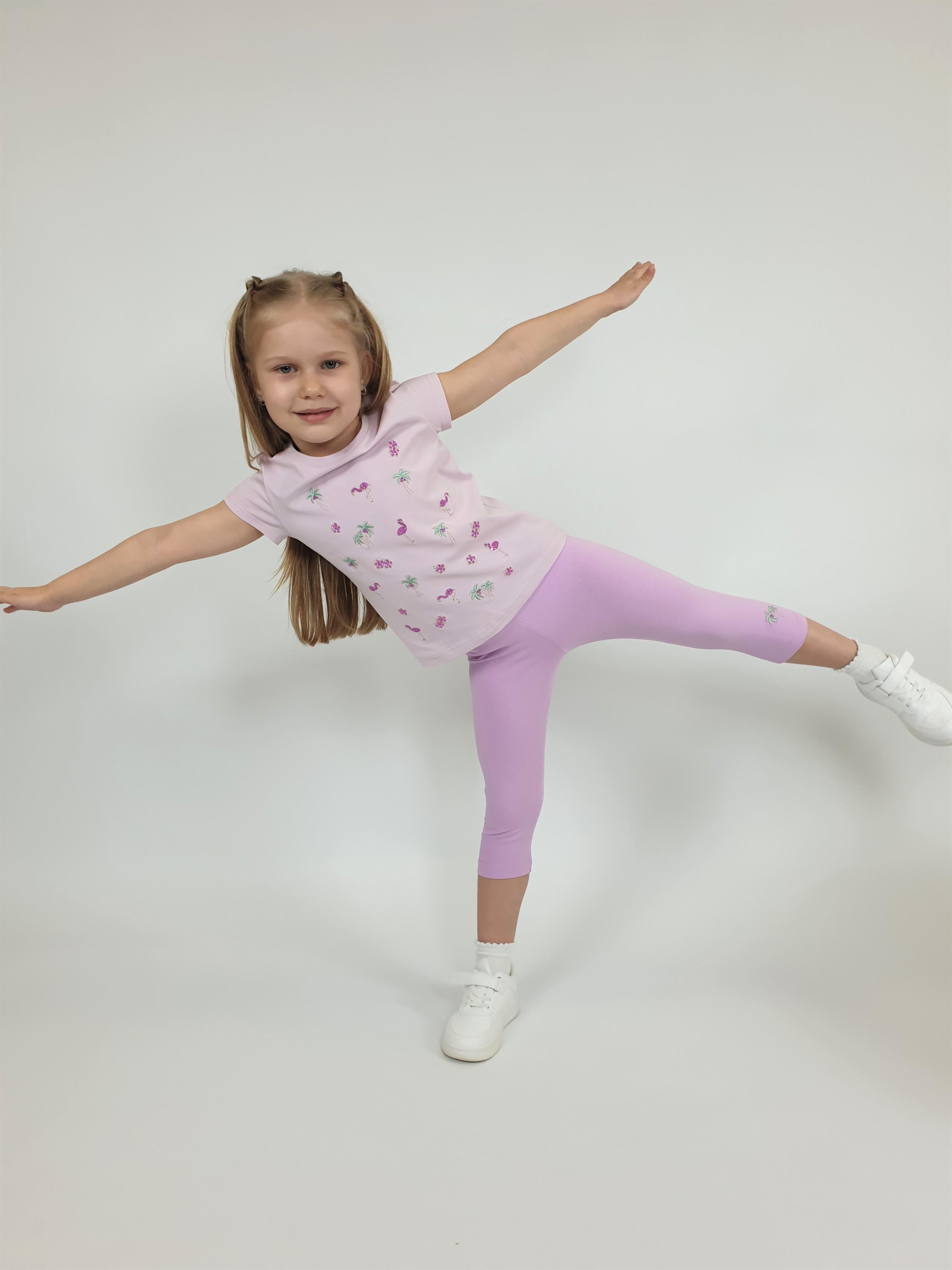 Кулирное полотно:95% х/б,5% лайкра. Фуфайка-полуприлегающий силуэт,вышивка(пайетки)на переде.Короткий втачной рукав.Низ рукава и фуфайки подшит.Горловина обработана планкой. Лосины-укороченные с вышивкой на левой стороне внизу,вверху на резинке.
