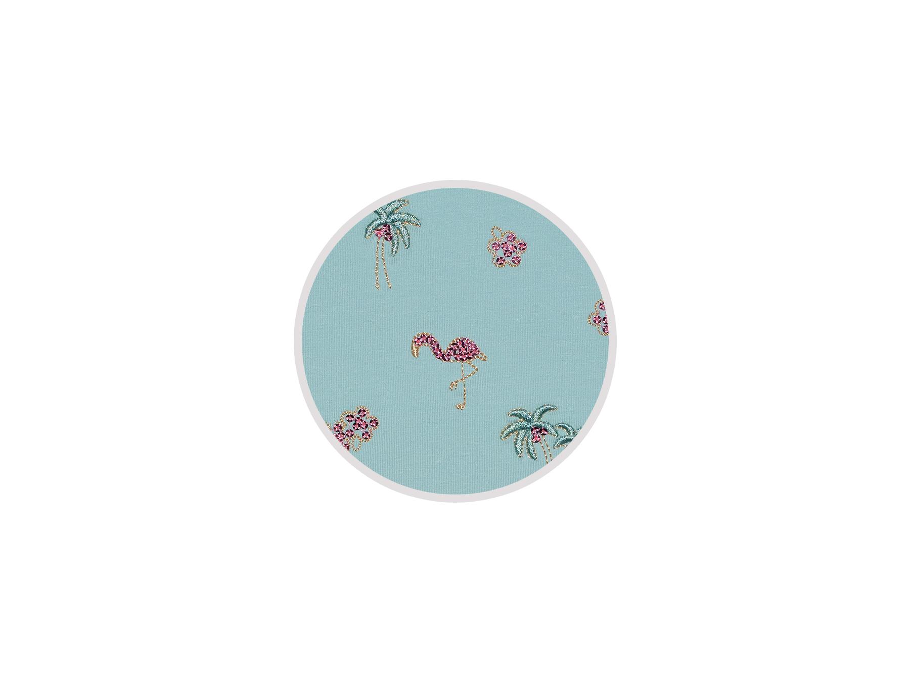 Кулирное полотно:95% х/б,5% лайкра. Фуфайка-полуприлегающий силуэт,вышивка(пайетки)на переде.Короткий втачной рукав.Низ рукава и фуфайки подшит.Горловина обработана планкой. Лосины-укороченные с вышивкой на левой стороне внизу,вверху на резинке.