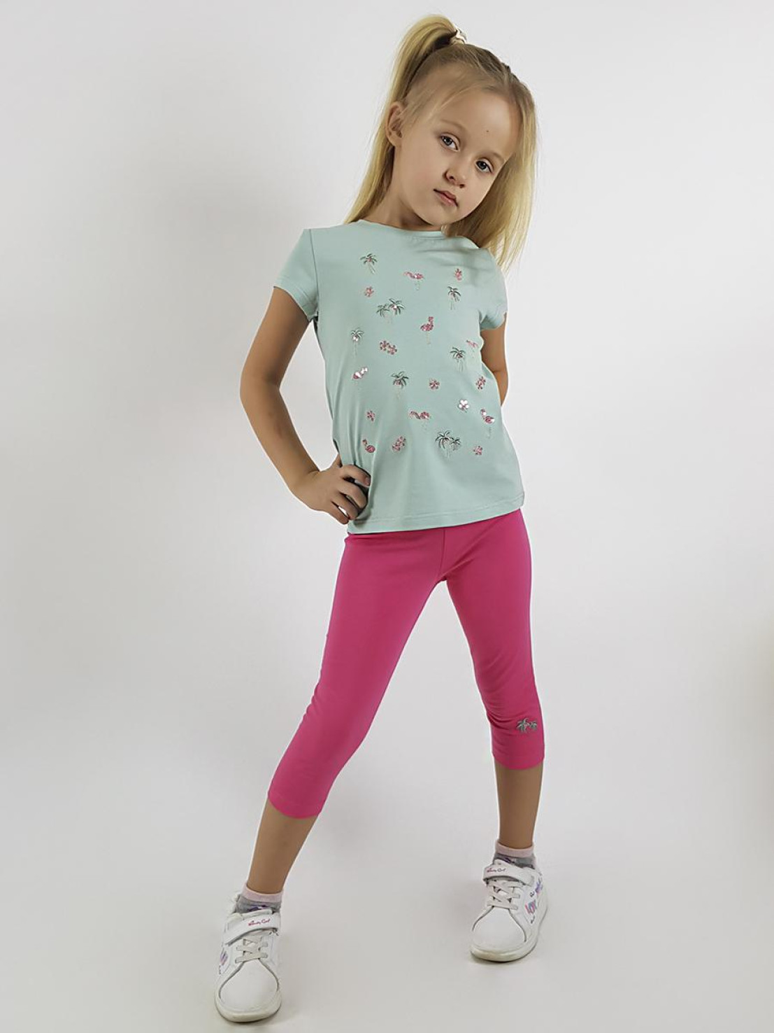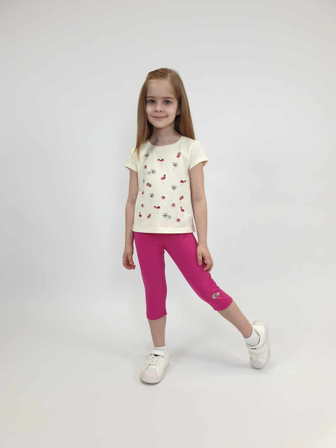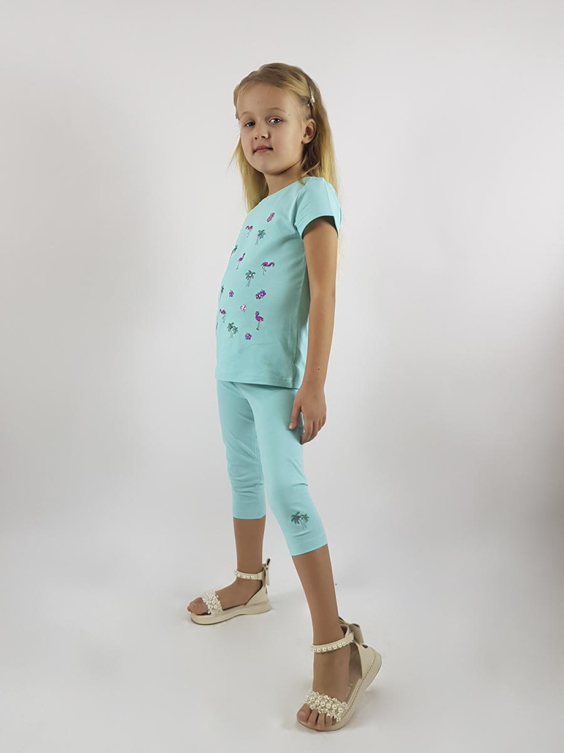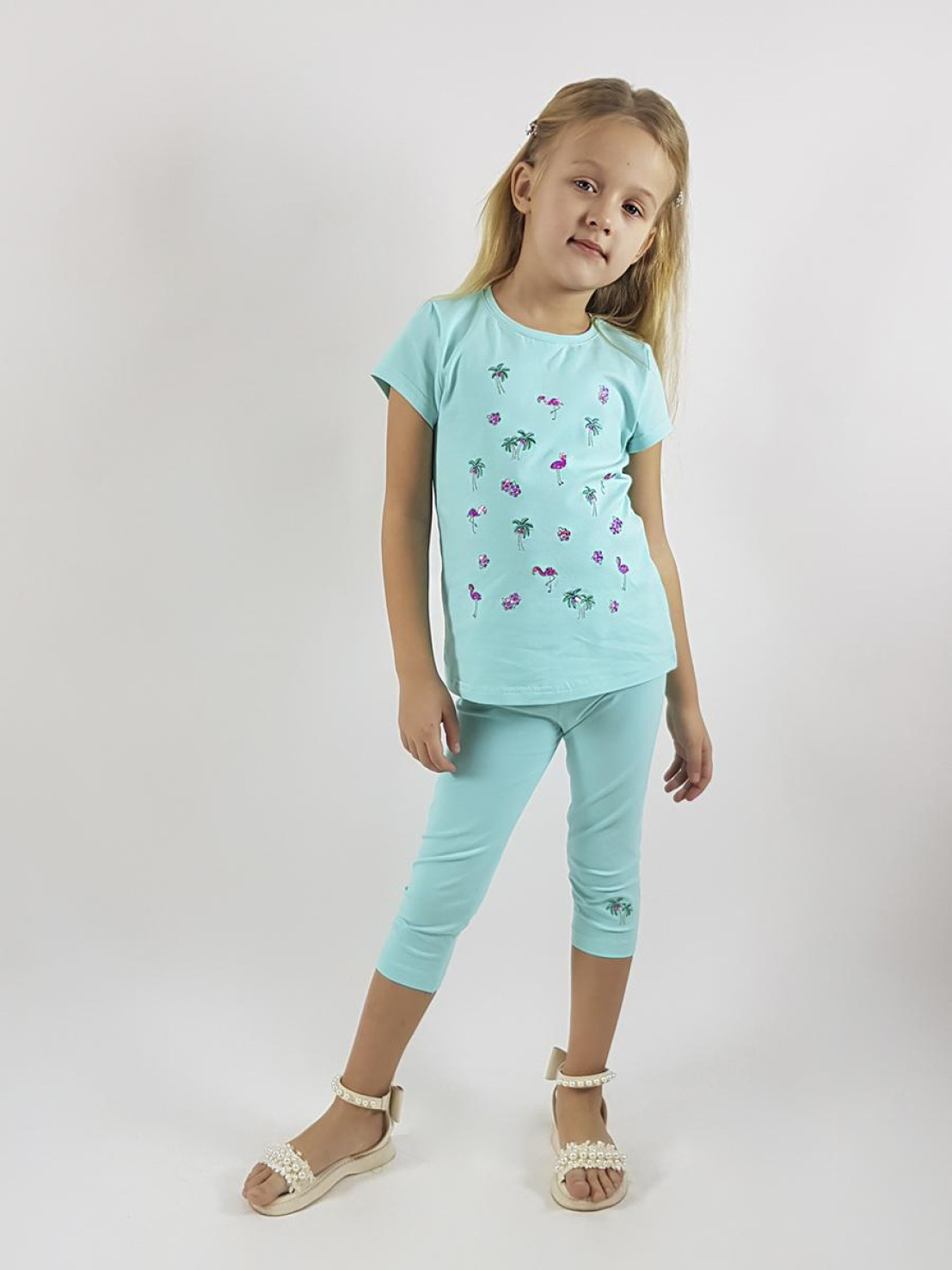 Кулирное полотно:95% х/б,5% лайкра. Фуфайка-полуприлегающий силуэт,вышивка(пайетки)на переде.Короткий втачной рукав.Низ рукава и фуфайки подшит.Горловина обработана планкой. Лосины-укороченные с вышивкой на левой стороне внизу,вверху на резинке.