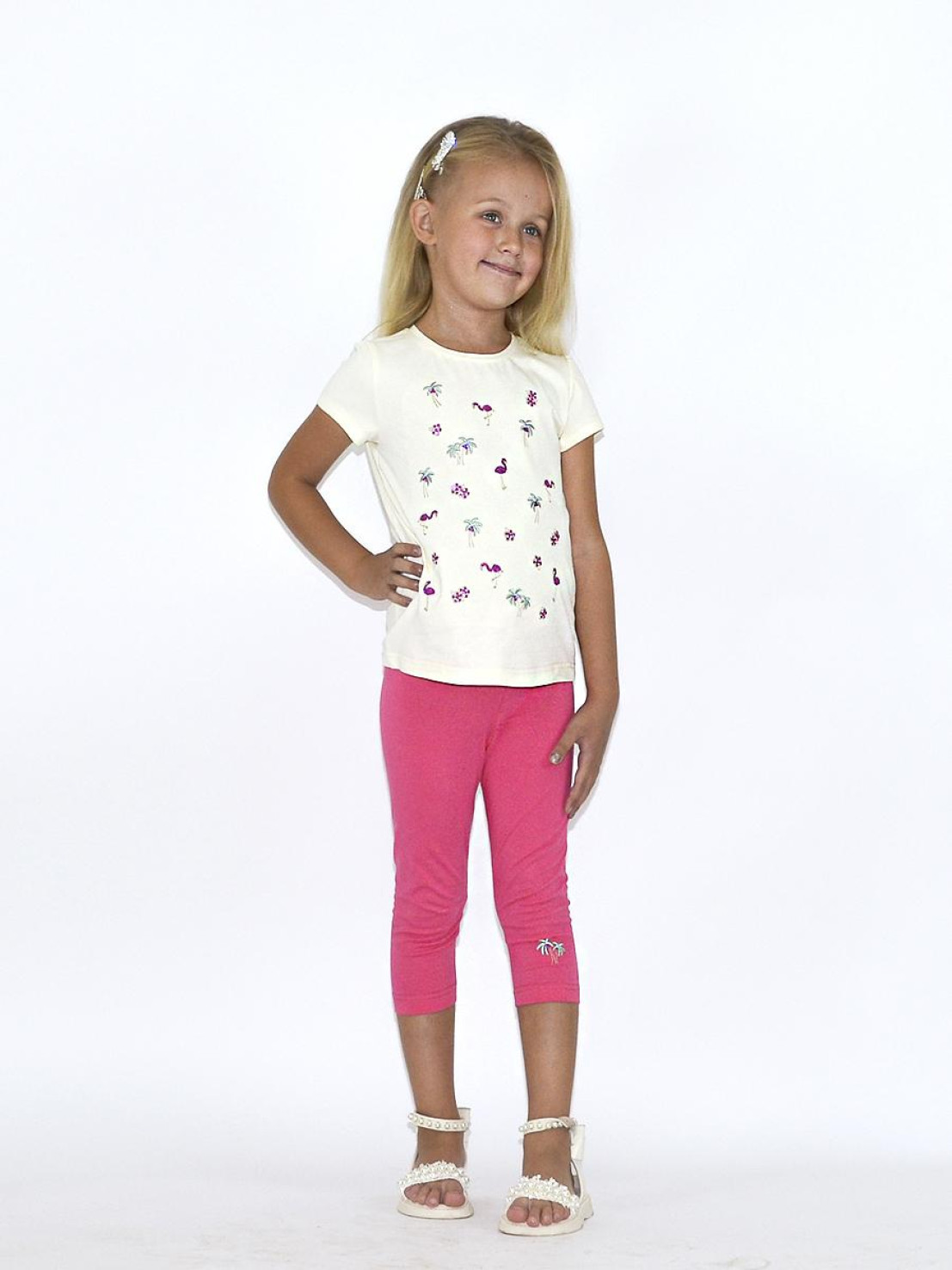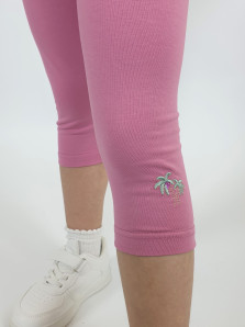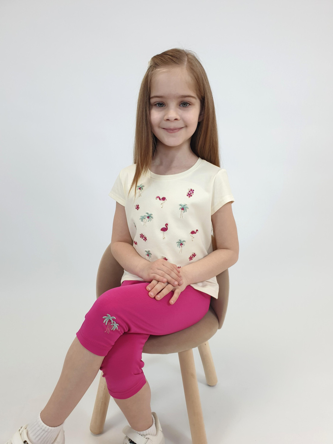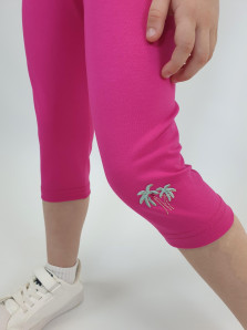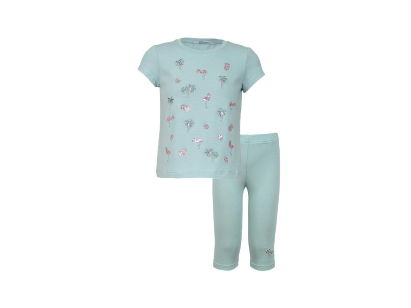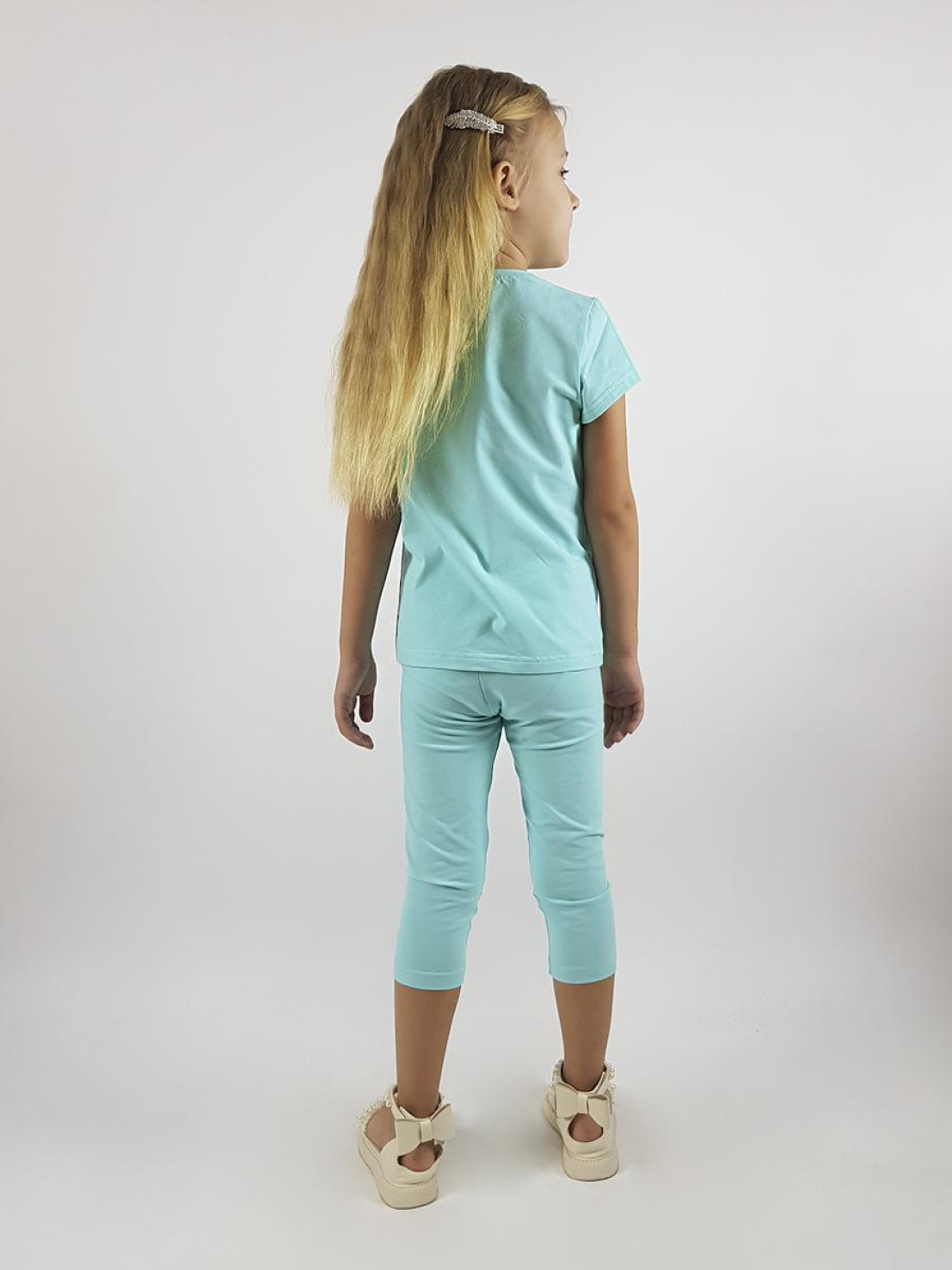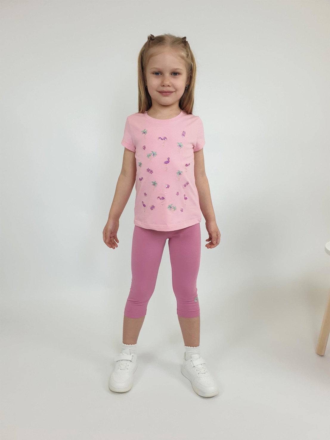 Кулирное полотно:95% х/б,5% лайкра. Фуфайка-полуприлегающий силуэт,вышивка(пайетки)на переде.Короткий втачной рукав.Низ рукава и фуфайки подшит.Горловина обработана планкой. Лосины-укороченные с вышивкой на левой стороне внизу,вверху на резинке.