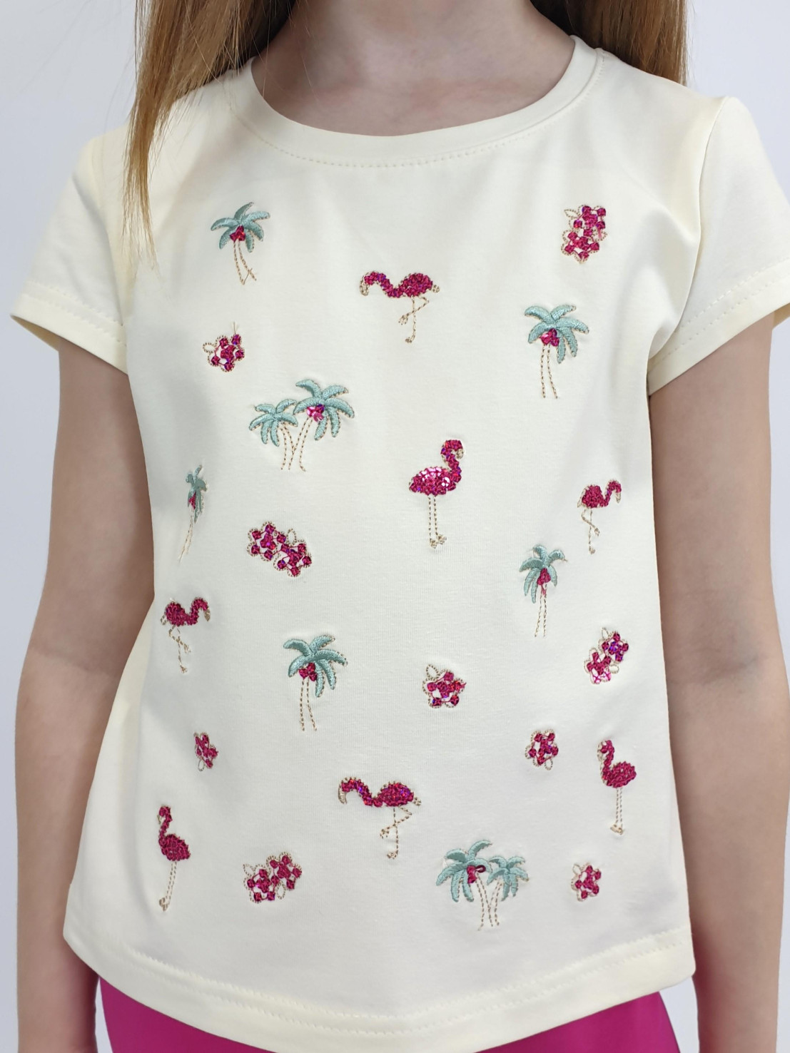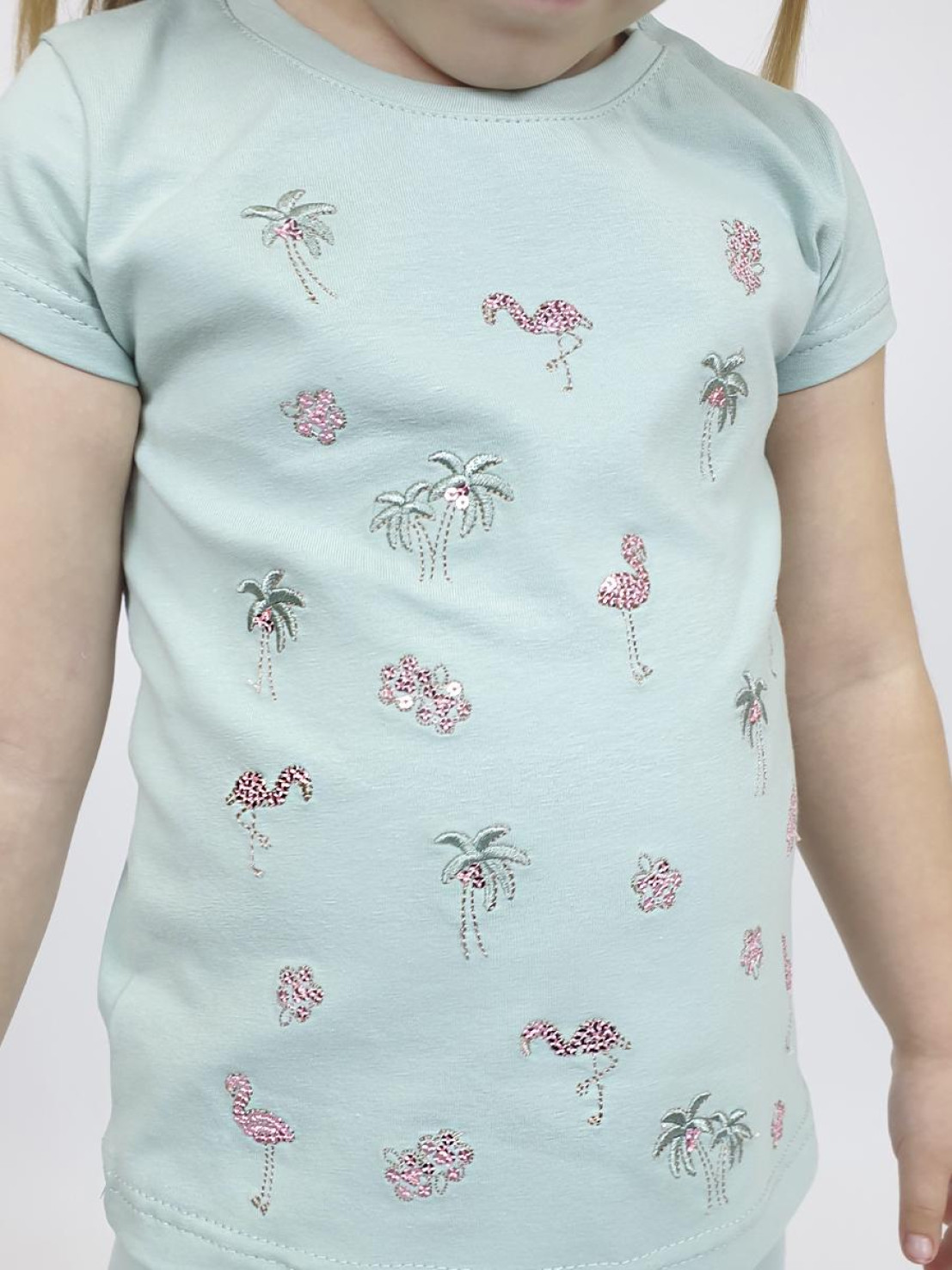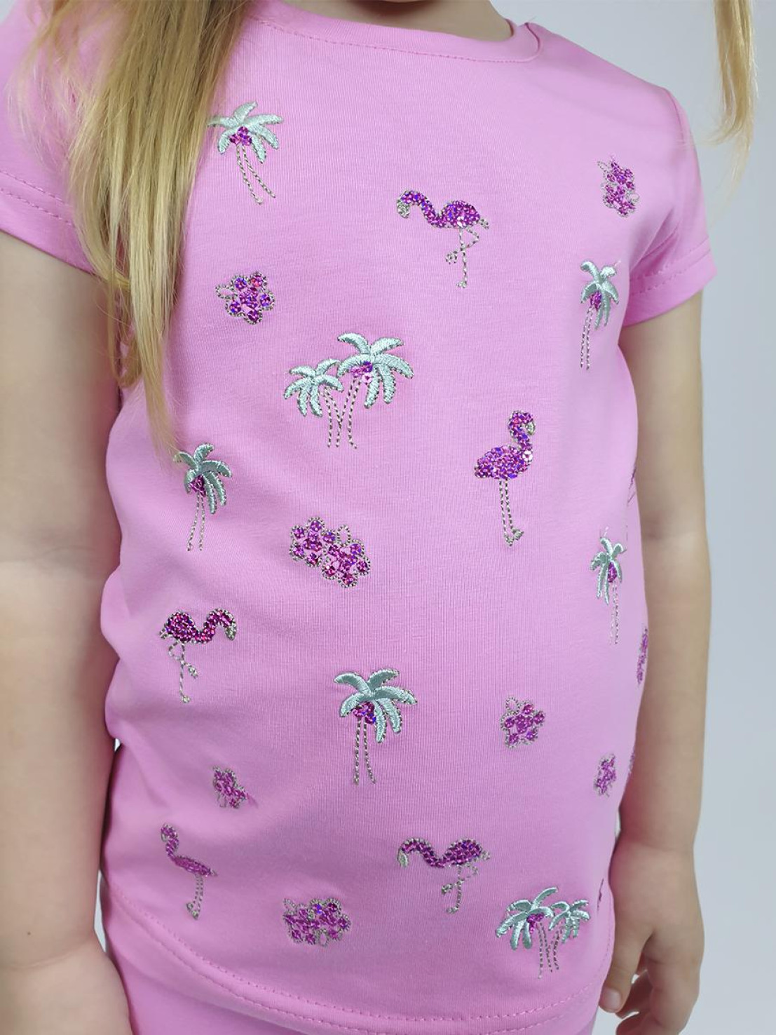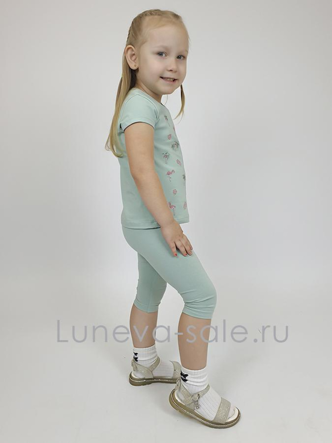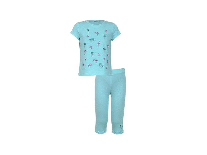 Кулирное полотно:95% х/б,5% лайкра. Фуфайка-полуприлегающий силуэт,вышивка(пайетки)на переде.Короткий втачной рукав.Низ рукава и фуфайки подшит.Горловина обработана планкой. Лосины-укороченные с вышивкой на левой стороне внизу,вверху на резинке.