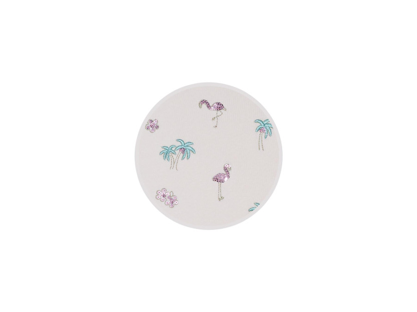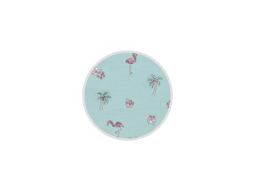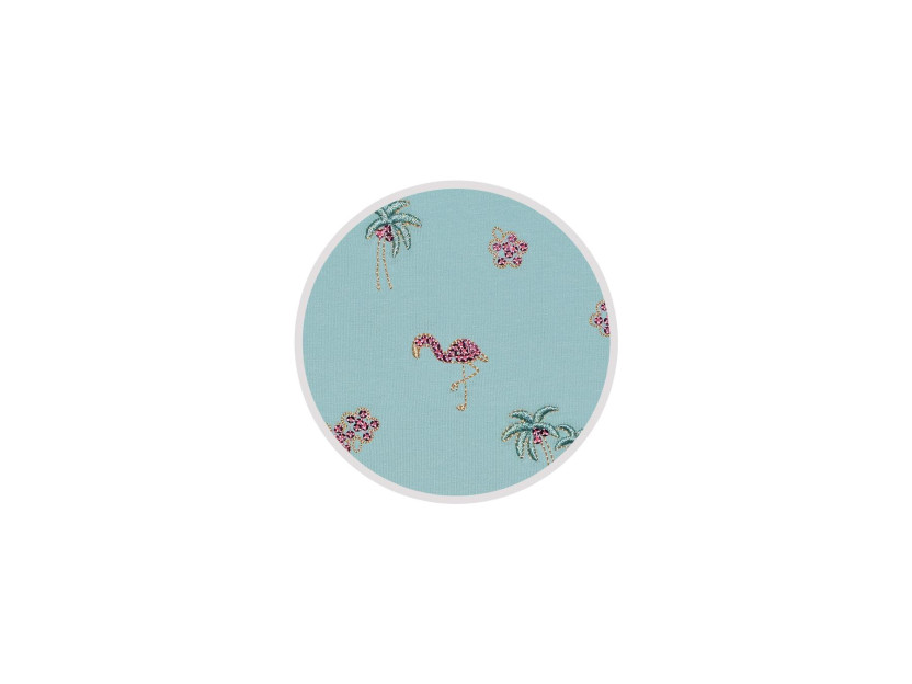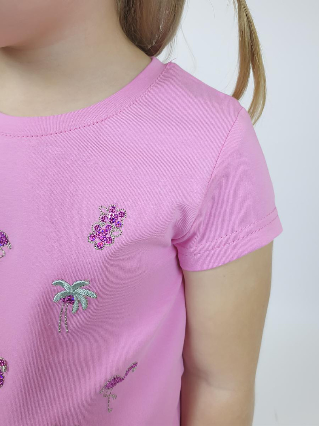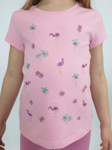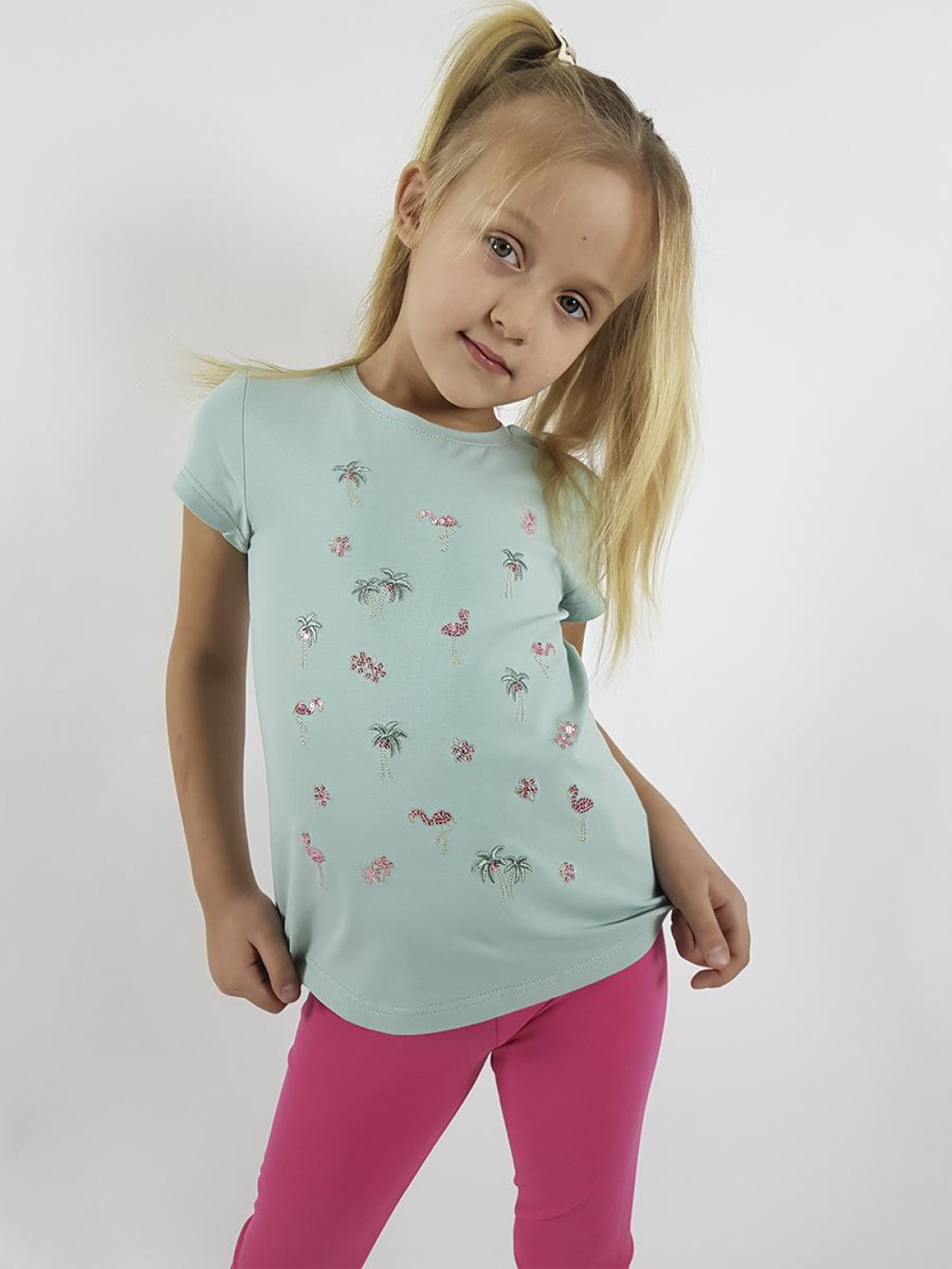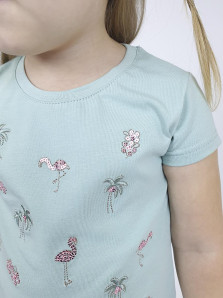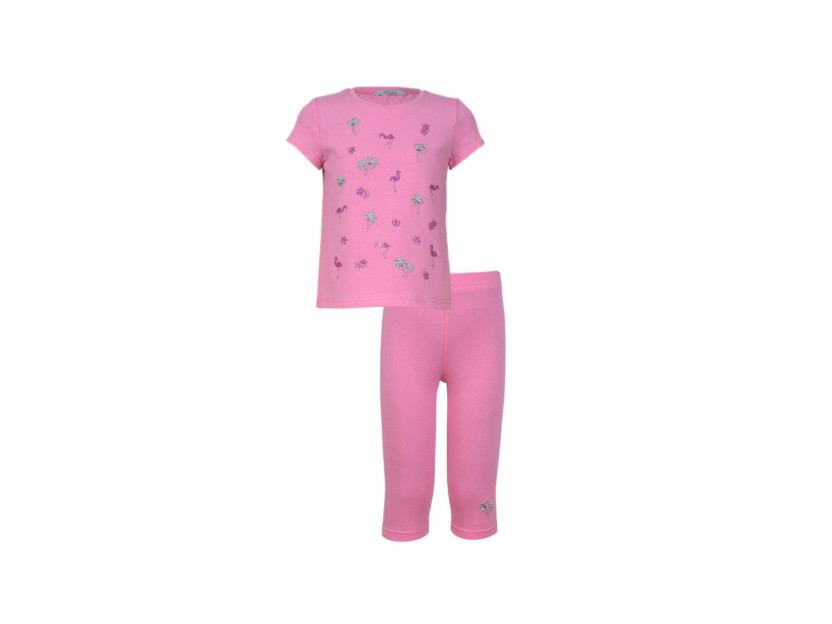 Кулирное полотно:95% х/б,5% лайкра. Фуфайка-полуприлегающий силуэт,вышивка(пайетки)на переде.Короткий втачной рукав.Низ рукава и фуфайки подшит.Горловина обработана планкой. Лосины-укороченные с вышивкой на левой стороне внизу,вверху на резинке.