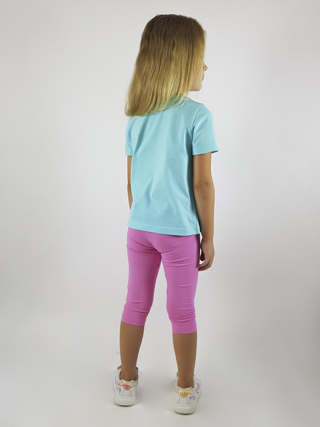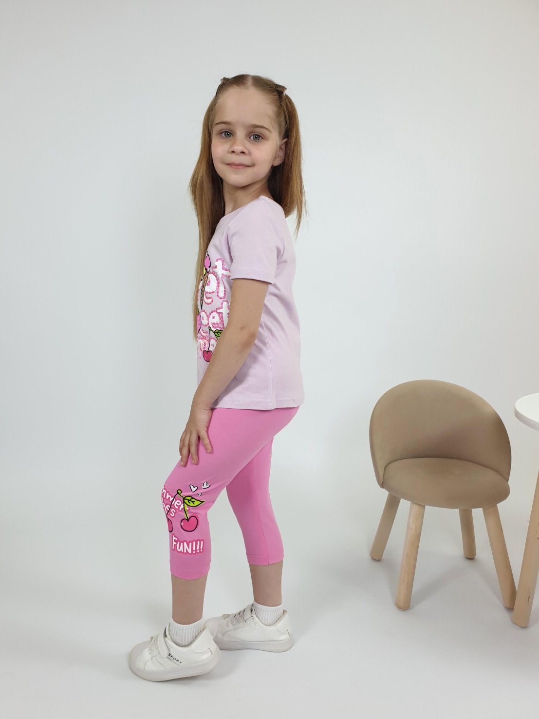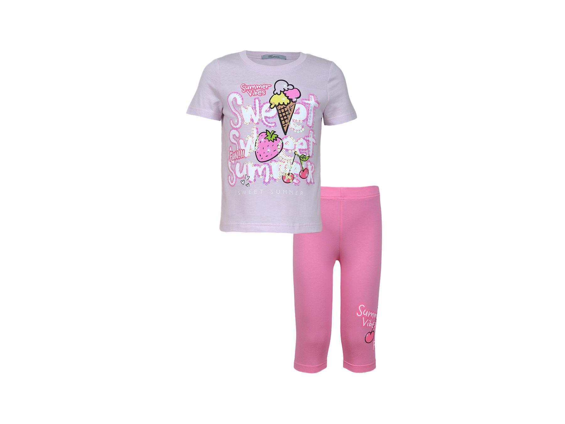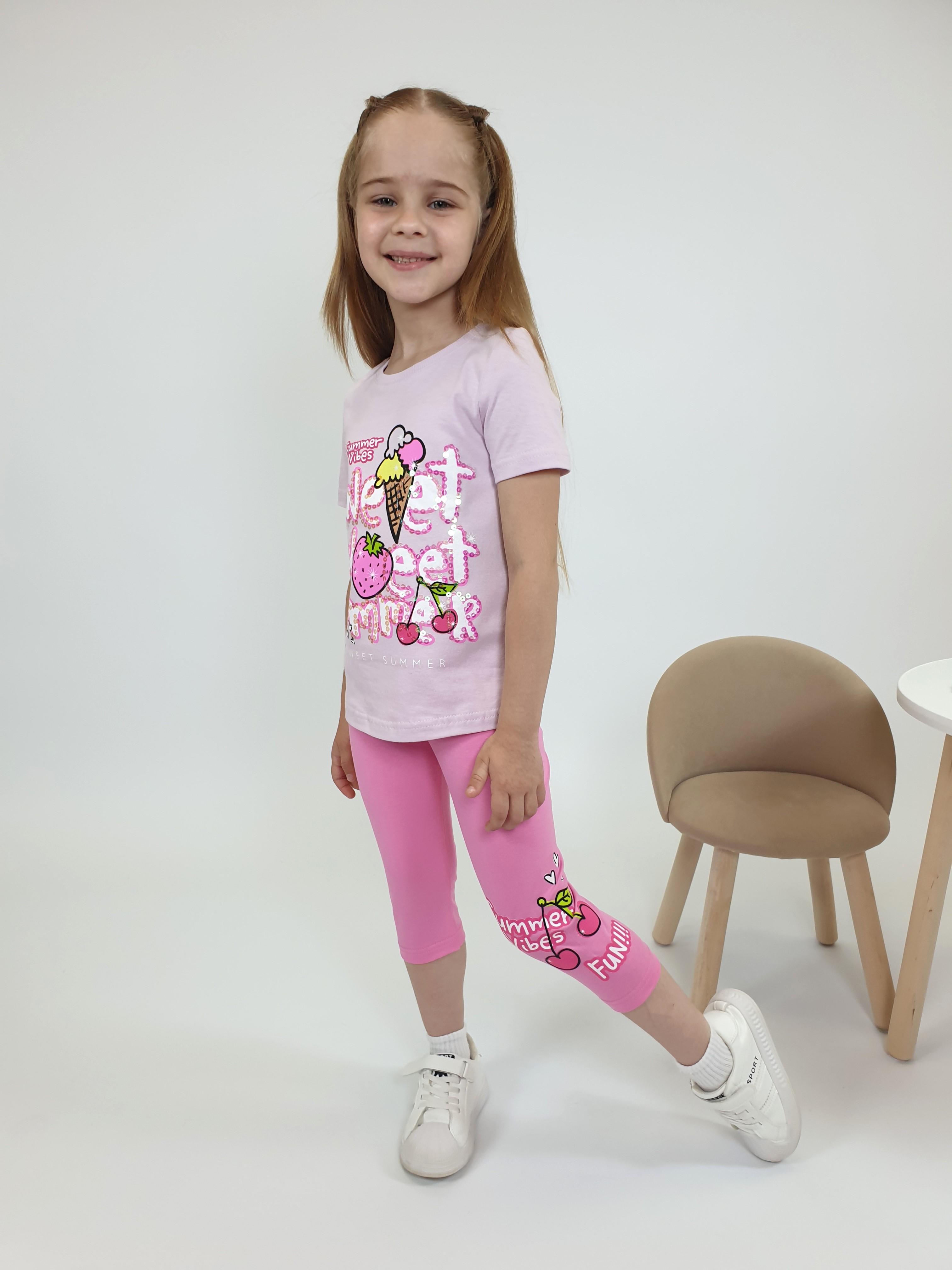Кулирное полотно:фуфайка 100% х/б.,лосины 95% х/б,5% лайкра. Фуфайка-прямой силуэт,печать и вышивка(пайетки)на переде,короткий втачной рукав.Низ рукава и фуфайки подшит.Горловина обработана ластиком. Лосины-укороченные с печатью на левой стороне,вверху на резинке.