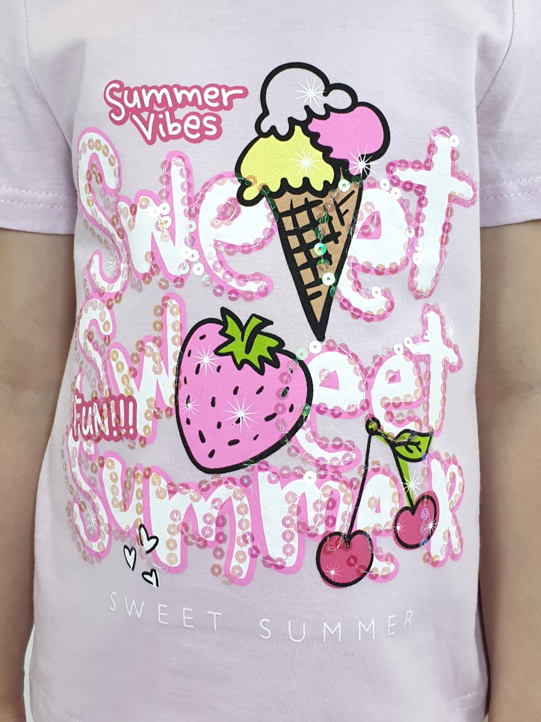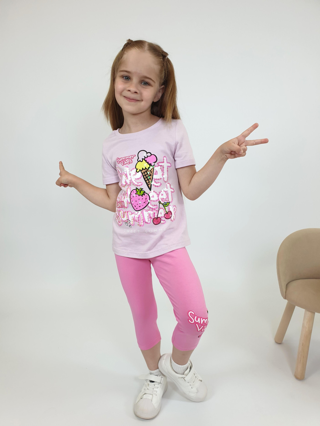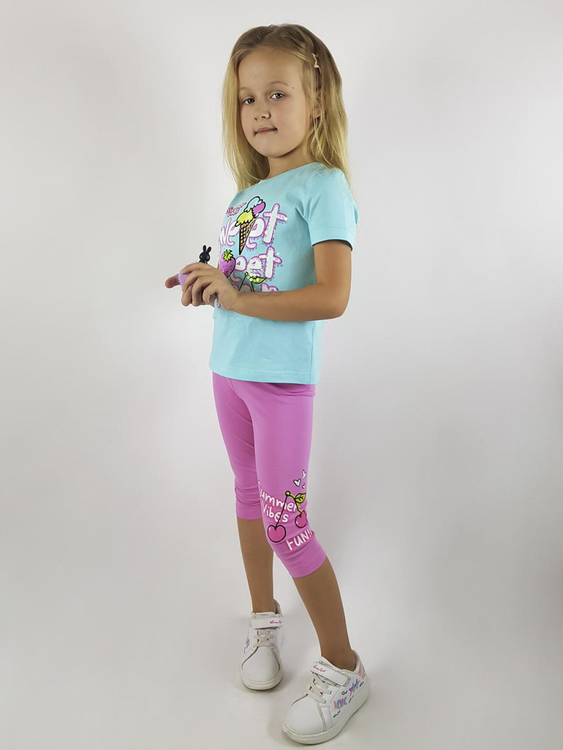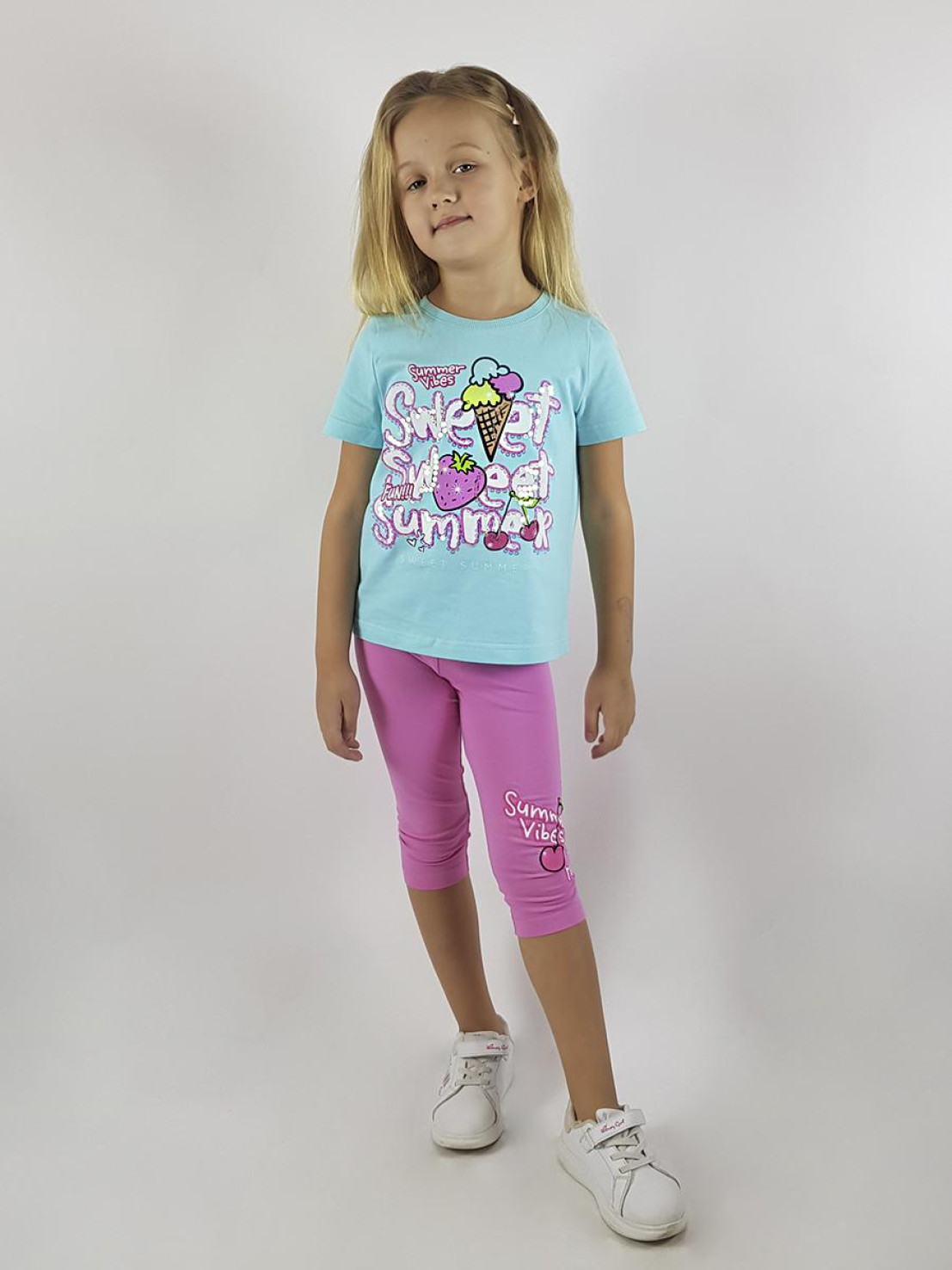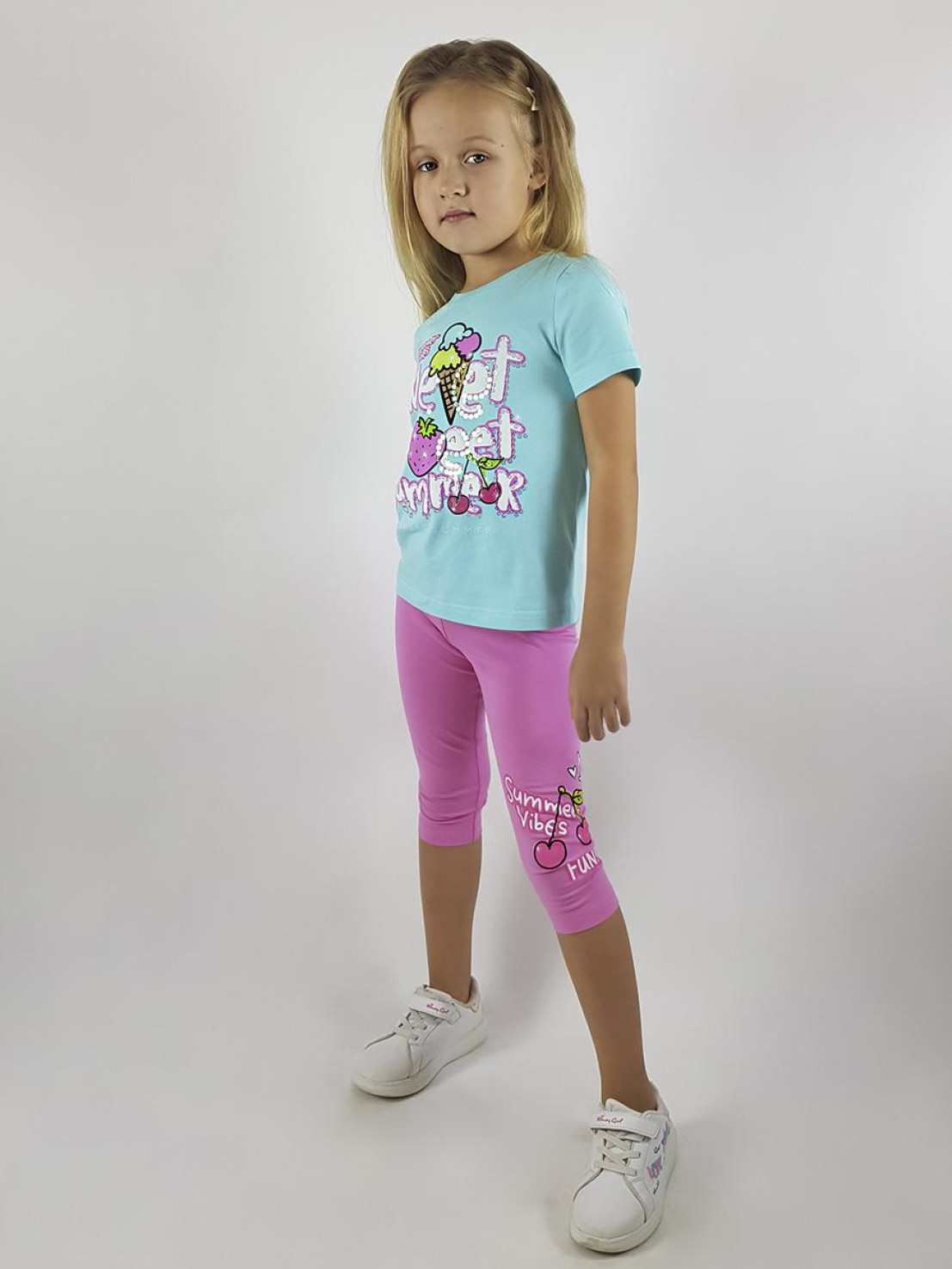 Кулирное полотно:фуфайка 100% х/б.,лосины 95% х/б,5% лайкра. Фуфайка-прямой силуэт,печать и вышивка(пайетки)на переде,короткий втачной рукав.Низ рукава и фуфайки подшит.Горловина обработана ластиком. Лосины-укороченные с печатью на левой стороне,вверху на резинке.