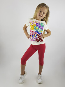 Кулирное полотно:фуфайка 100% х/б.,лосины 95% х/б,5% лайкра. Фуфайка-прямой силуэт,печать и вышивка(пайетки)на переде,короткий втачной рукав.Низ рукава и фуфайки подшит.Горловина обработана ластиком. Лосины-укороченные,вверху на резинке.