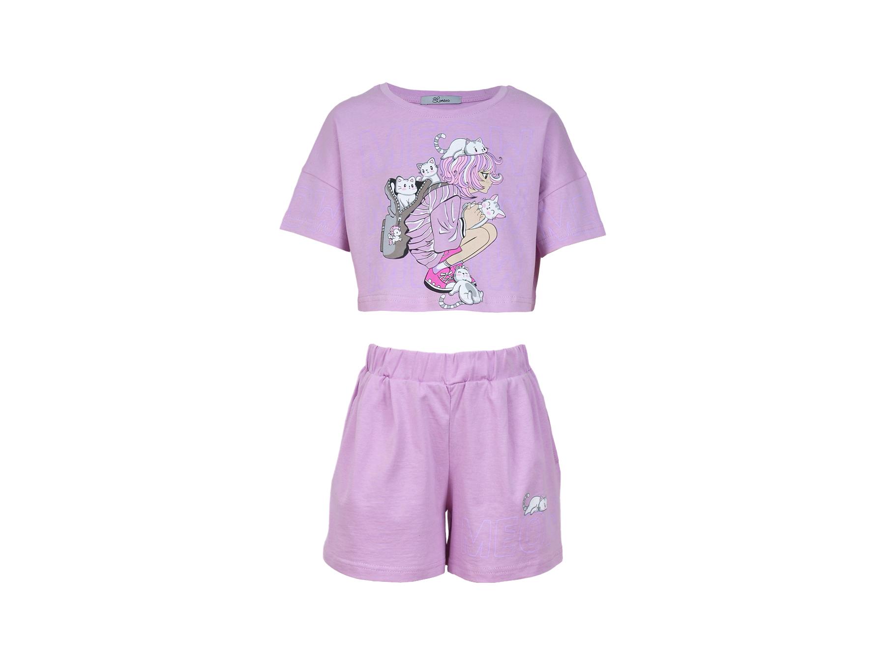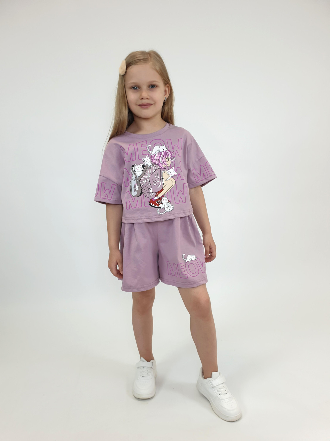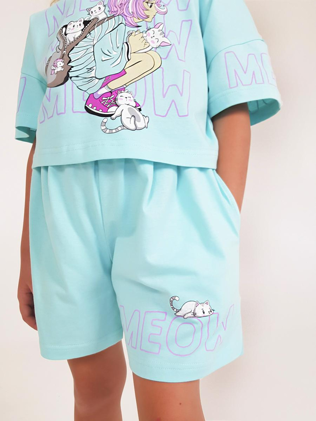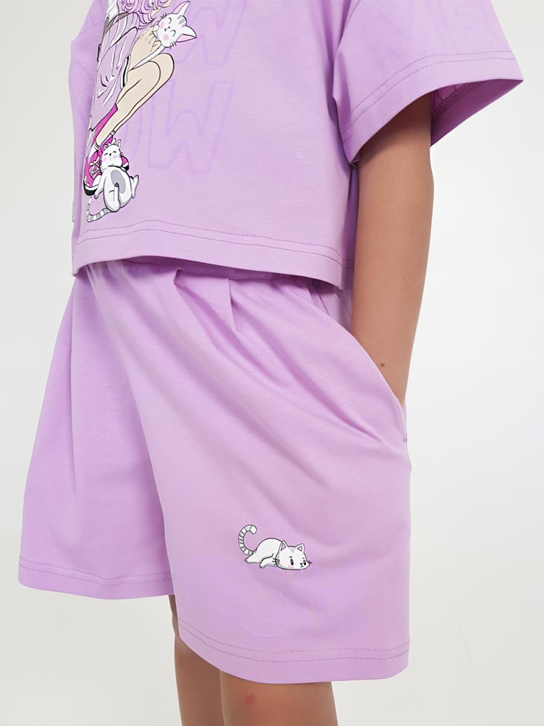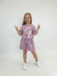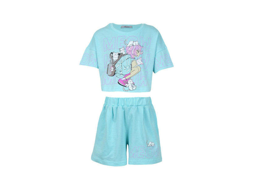 Кулирное полотно: 100% х/б. Фуфайка(оверсайз)-укороченная,спущенное плечо,короткий рукав с печатью.Печать на переде,горловина обработана планкой. Шорты-короткие,складки спереди,два боковых кармана,пояс на резинке.Печать на левой половинке внизу.
