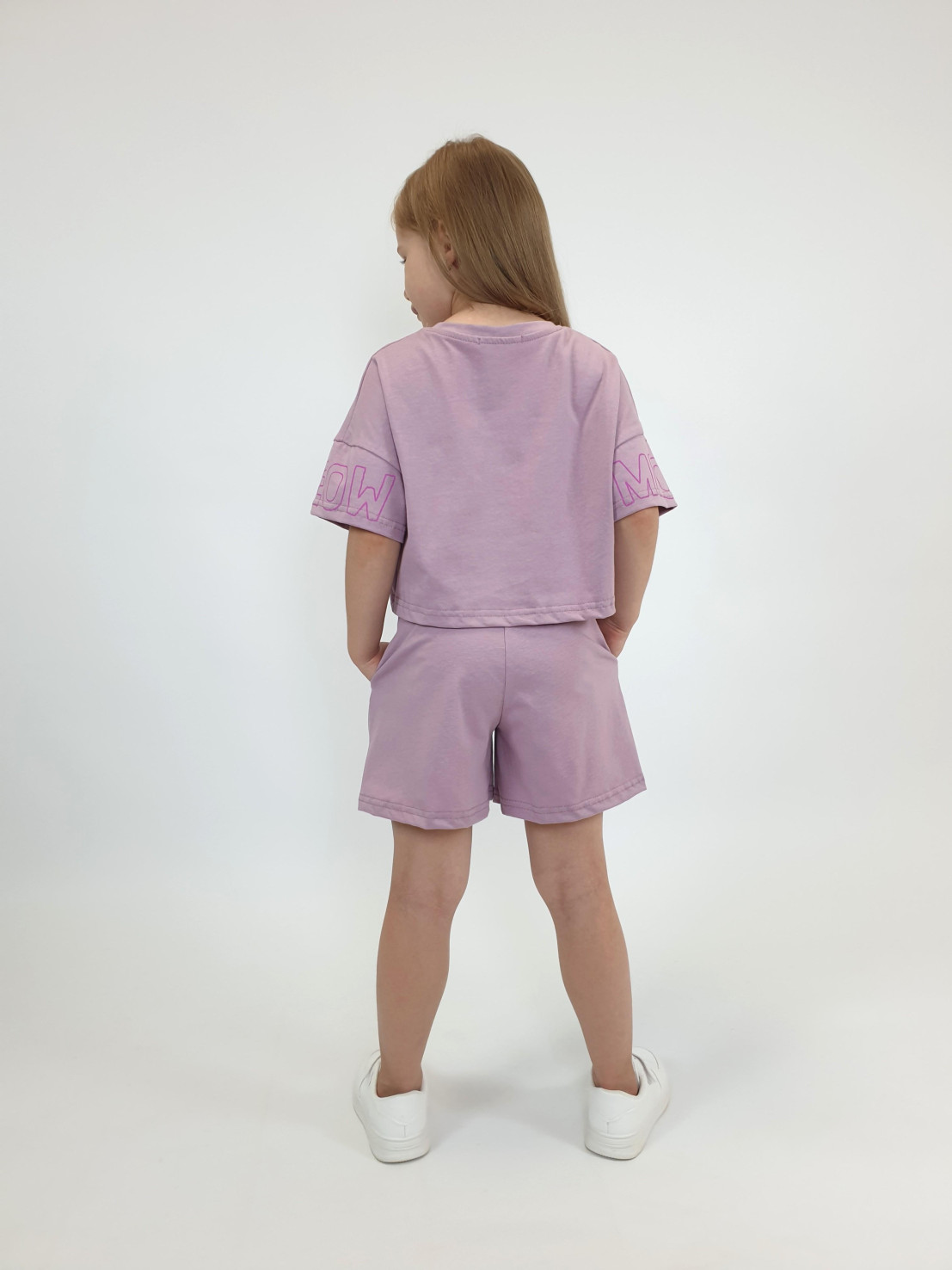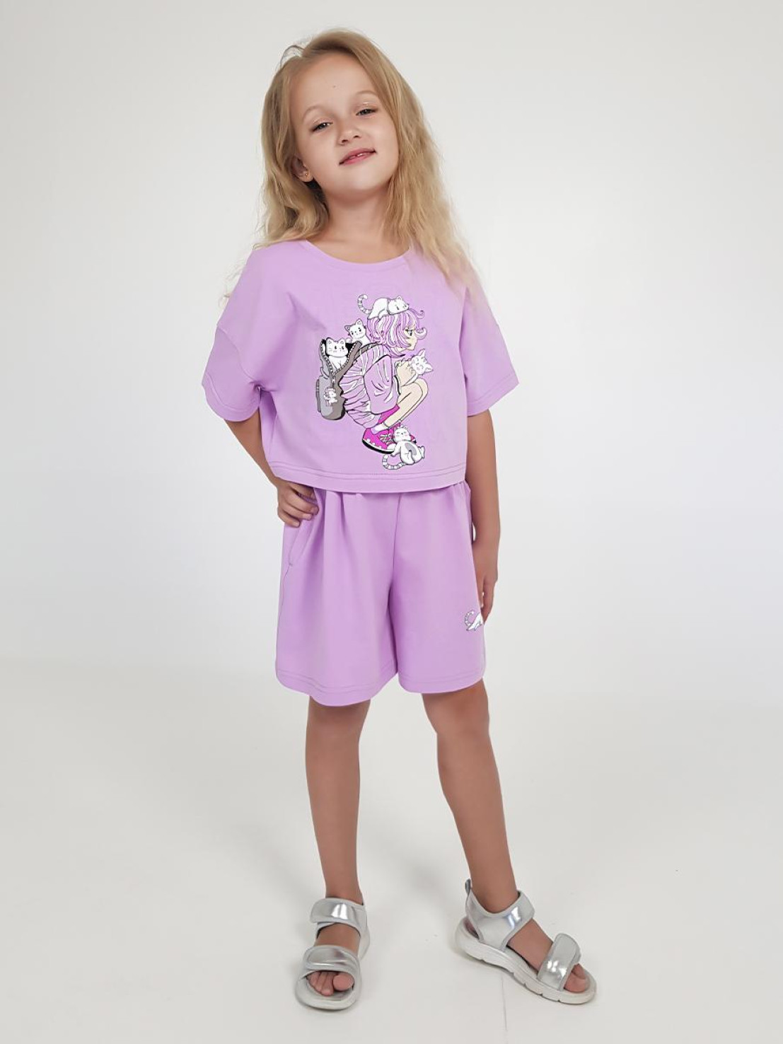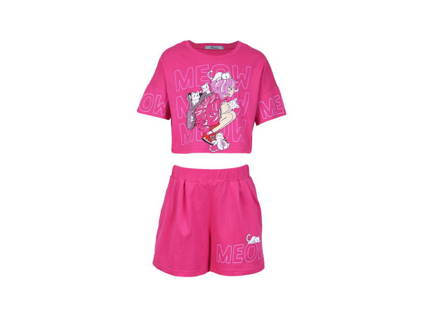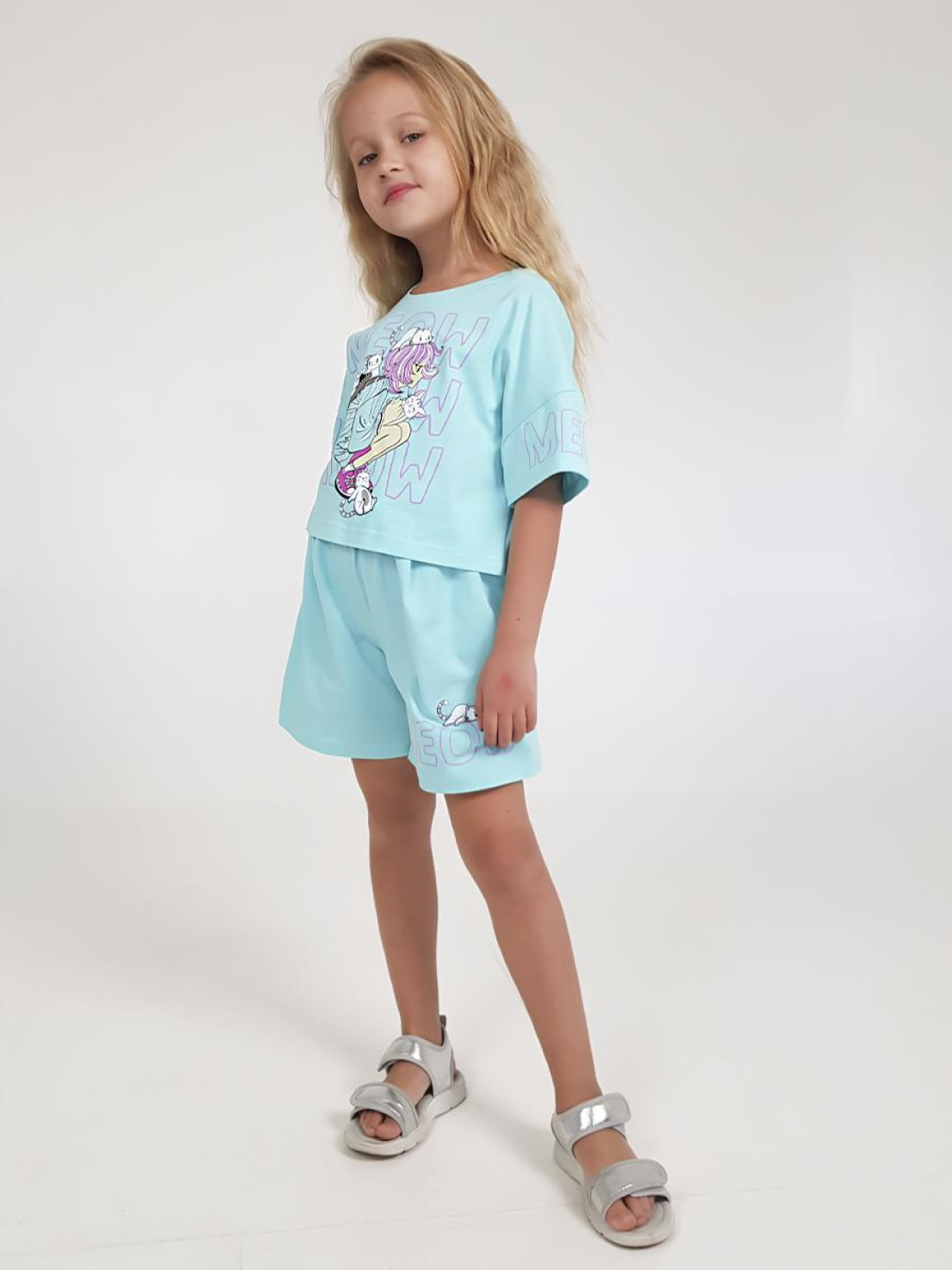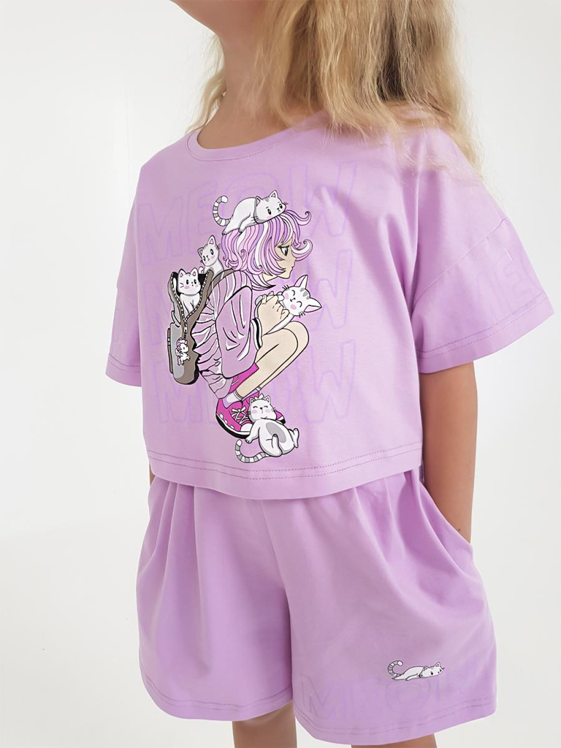 Кулирное полотно: 100% х/б. Фуфайка(оверсайз)-укороченная,спущенное плечо,короткий рукав с печатью.Печать на переде,горловина обработана планкой. Шорты-короткие,складки спереди,два боковых кармана,пояс на резинке.Печать на левой половинке внизу.