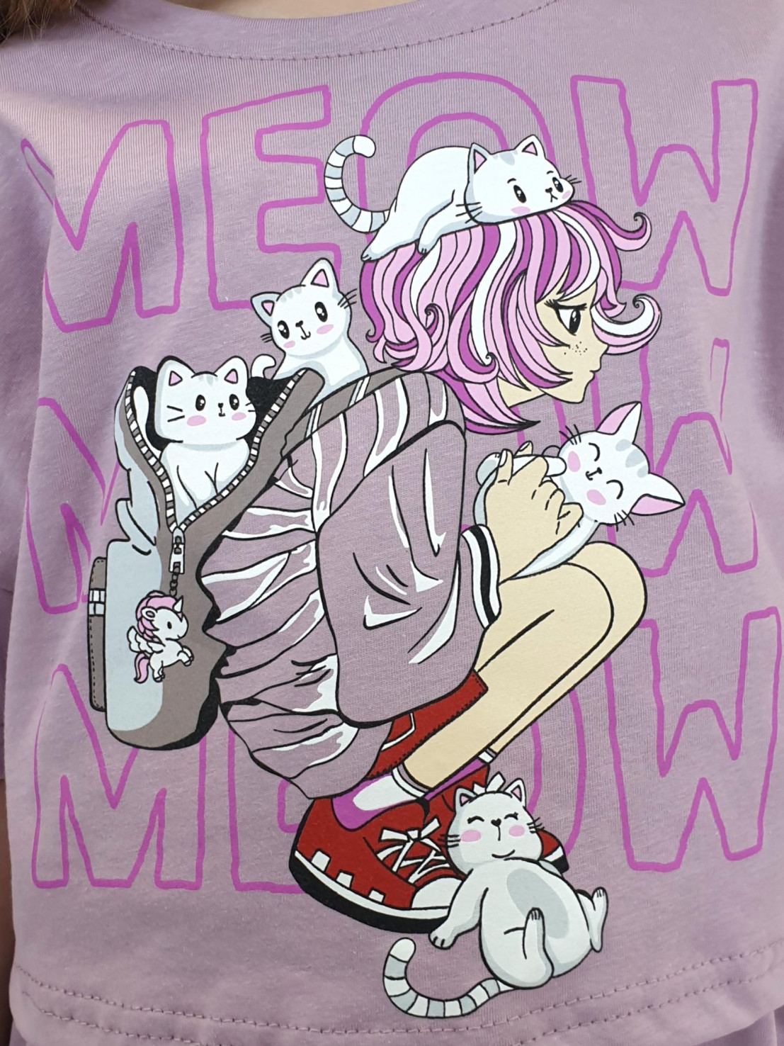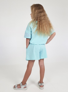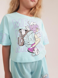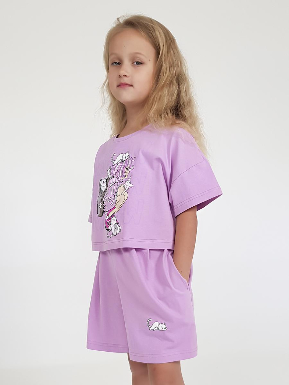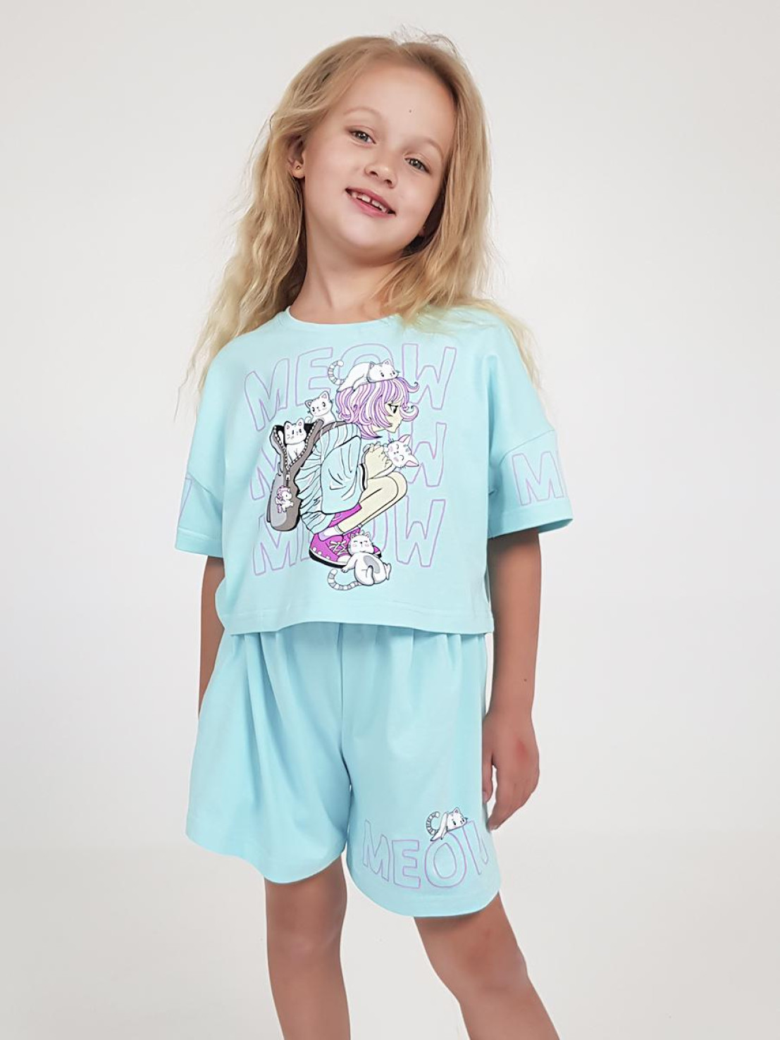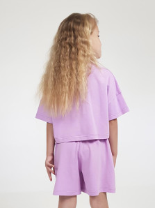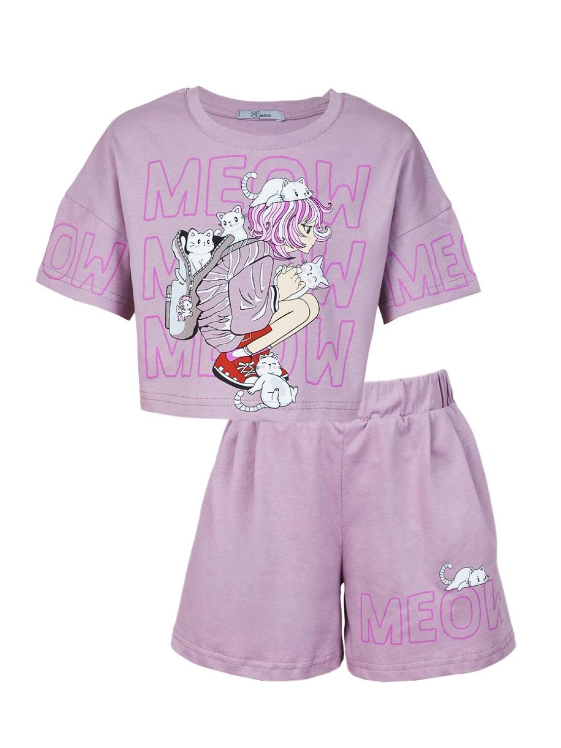 Кулирное полотно: 100% х/б. Фуфайка(оверсайз)-укороченная,спущенное плечо,короткий рукав с печатью.Печать на переде,горловина обработана планкой. Шорты-короткие,складки спереди,два боковых кармана,пояс на резинке.Печать на левой половинке внизу.
