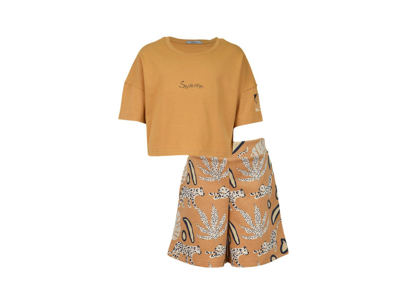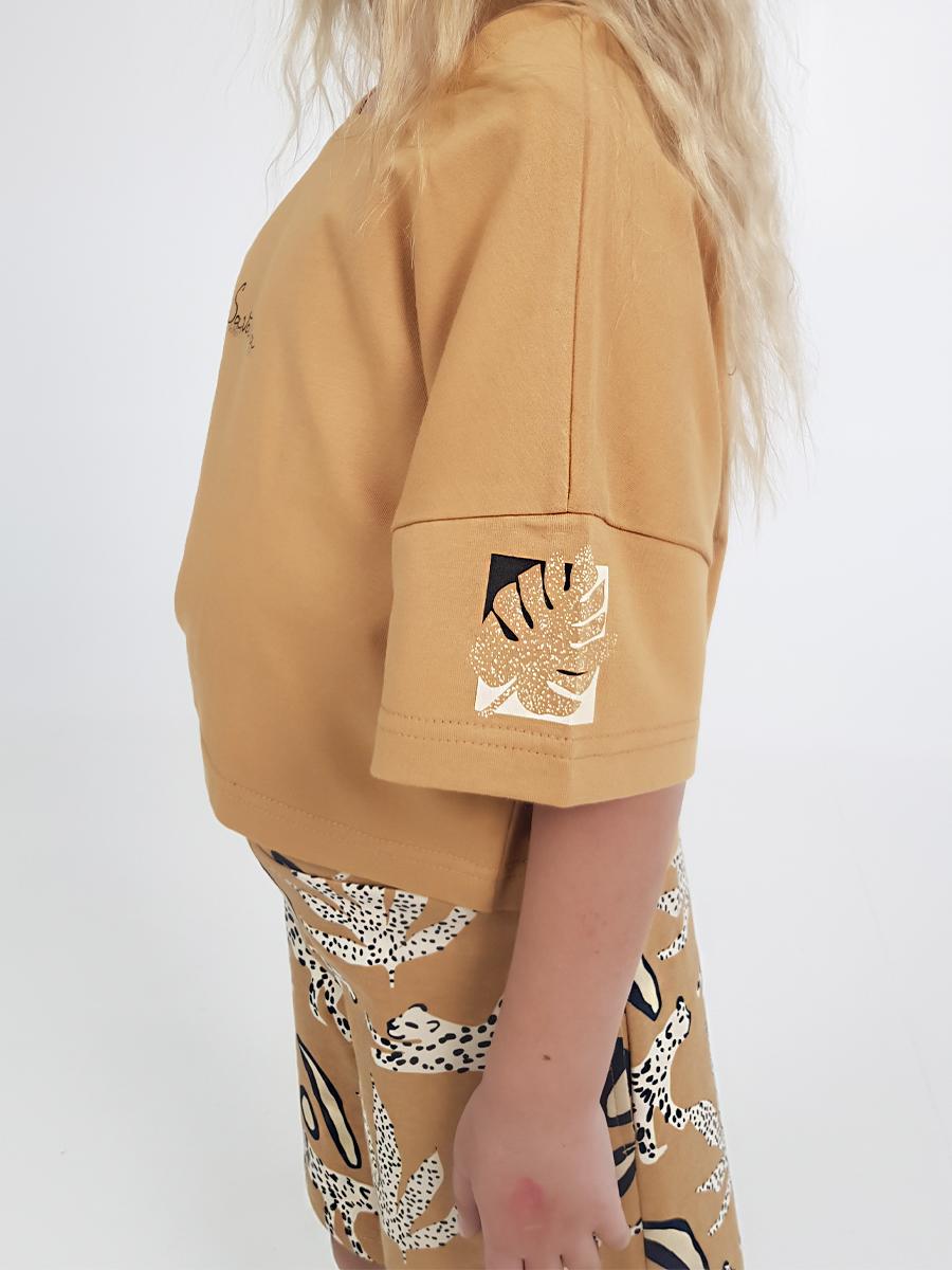 Кулирное полотно: 100% х/б.-фуфайка,футер двух-нитка:75% х/б,25% п/э-шорты. Фуфайка(оверсайз)-укороченная,спущенное плечо,короткий рукав. Печать-перед и левый рукав,горловина обработана планкой. Шорты-короткие,два боковых кармана,пояс на резинке сзади.