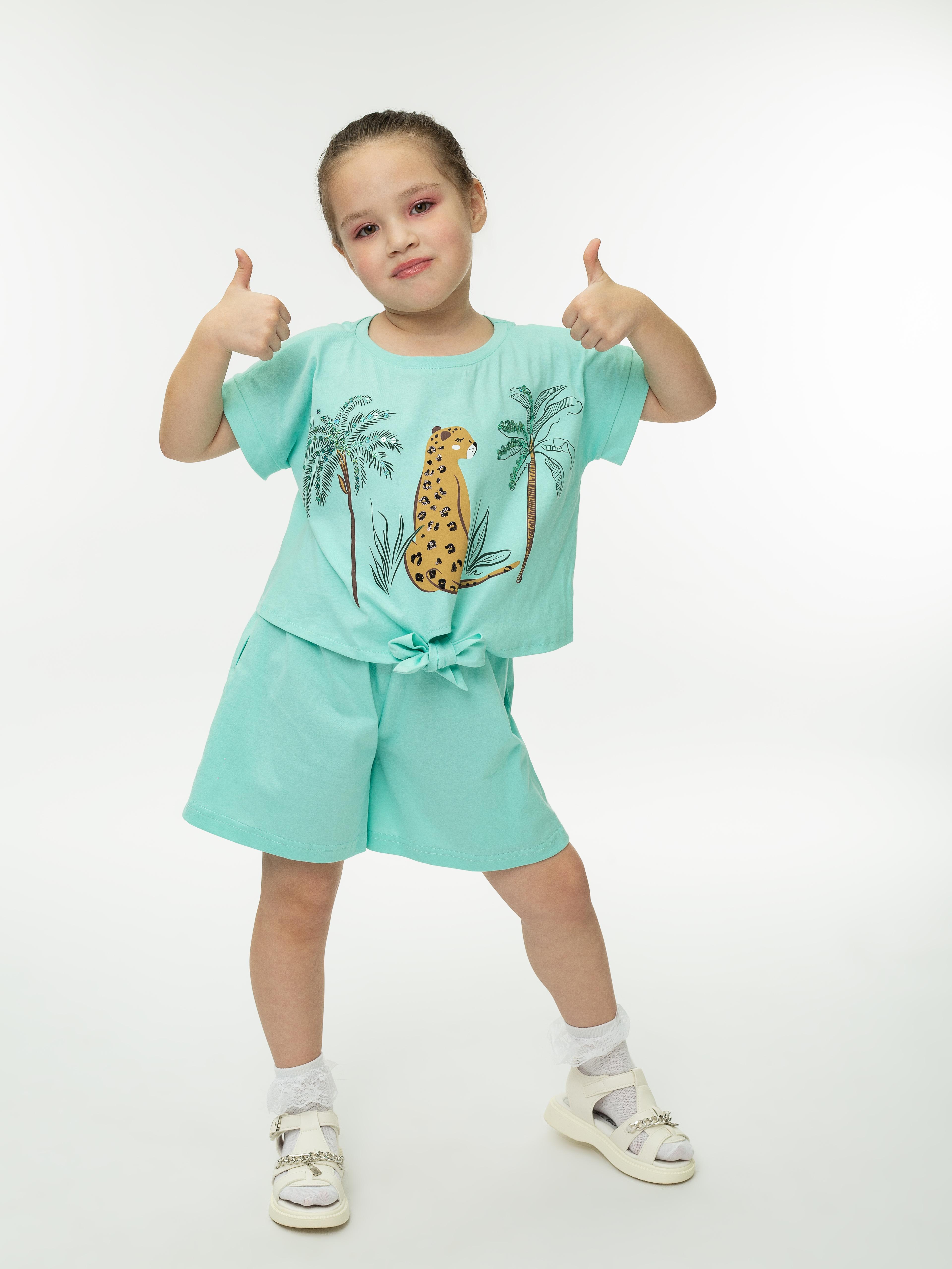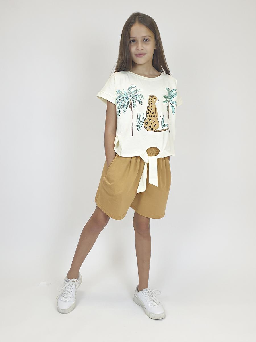 Кулирное полотно: 100% х/б. Фуфайка-прямого силуэта,спущенное плечо с притачной манжетой.Внизу,спереди завязана на "узел".Горловина обработана планкой.Перед с печатью и вышивкой(пайетки). Шорты-короткие,складки спереди,два боковых кармана,пояс на резинке.