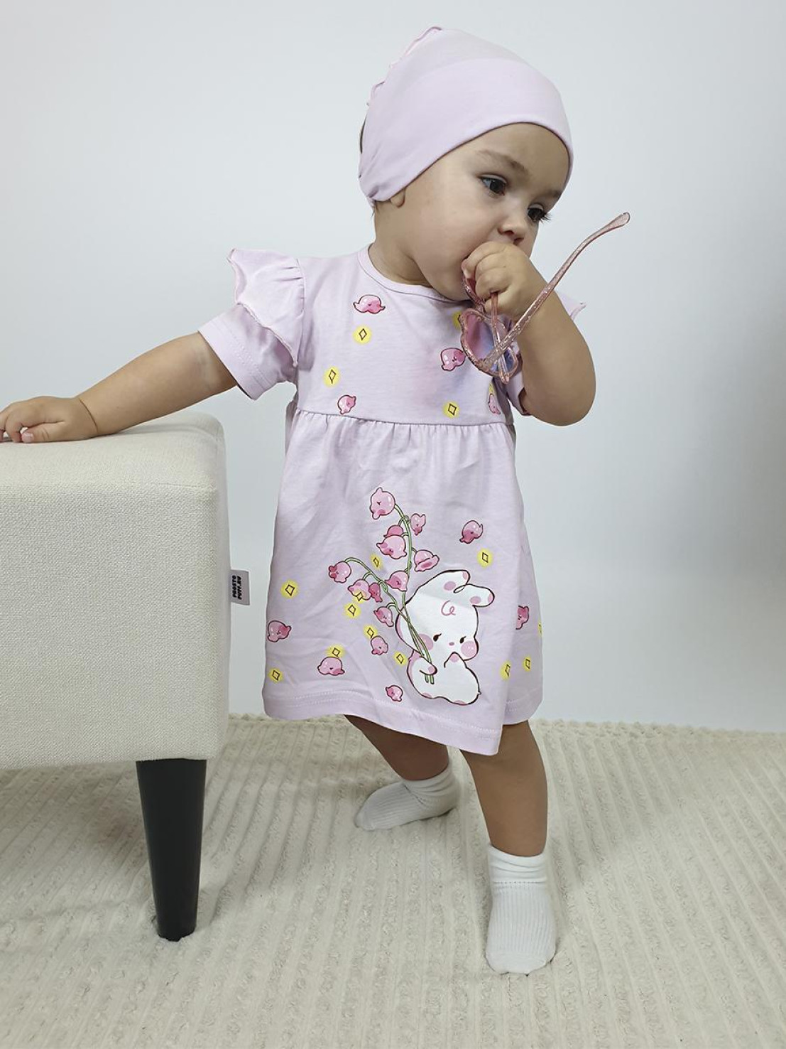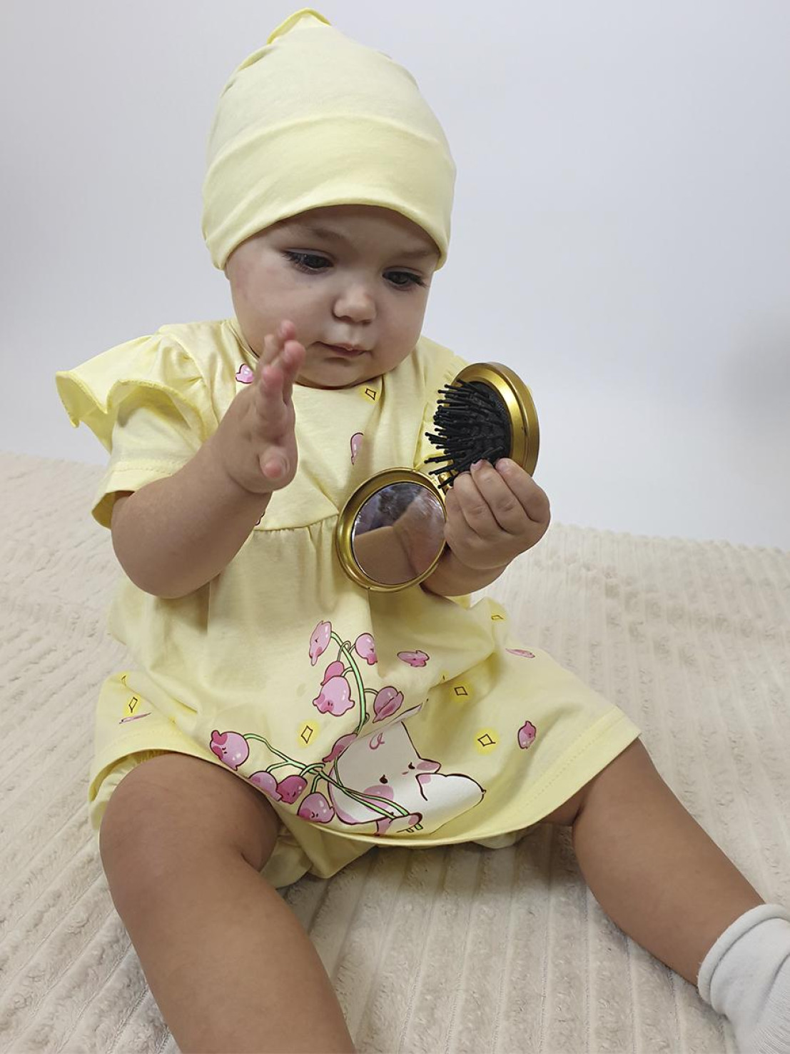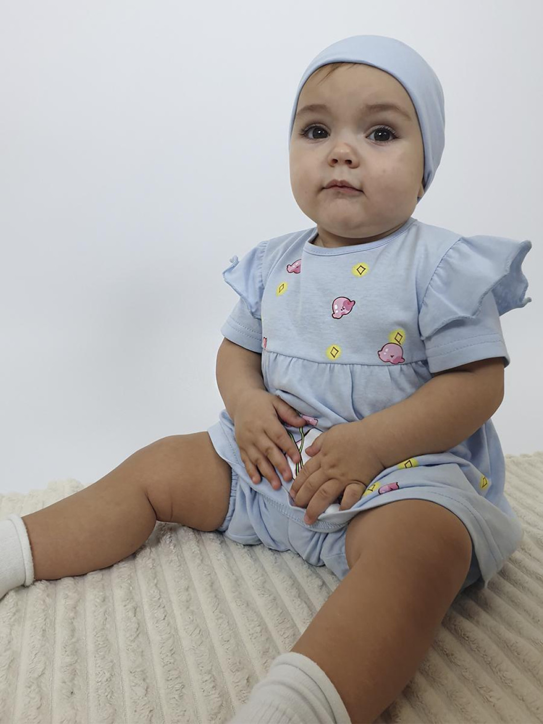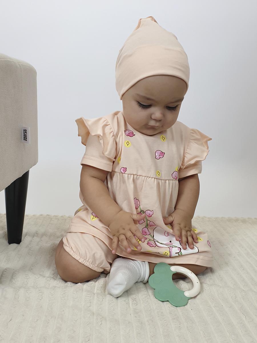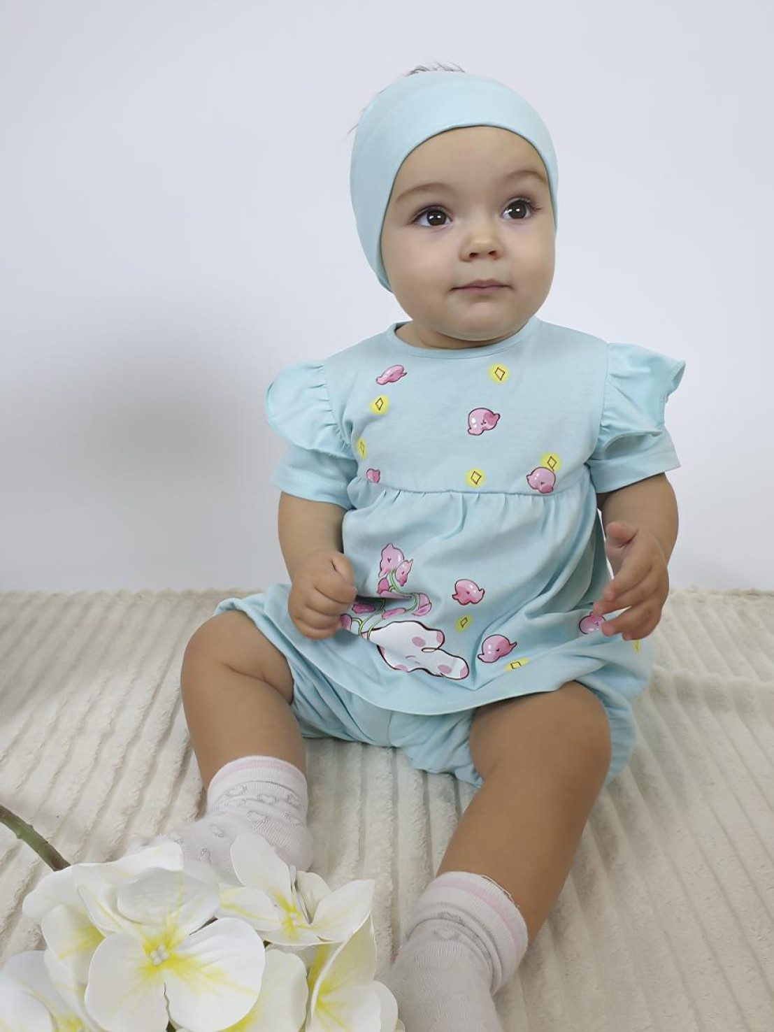 Кулирное полотно:100% х/б. Платье силуэт трапеция,отрезная кокетка,юбка со сборкой.Печать на переде кокетки и юбки.Рукав короткий с рюшей по окату.Застежка на пуговицы по спинке.Горловина окантована. Трусы вверху на резинке,по ножкам собраны на резинку и подшиты. Отделочный элемент-косынка,на резинке.