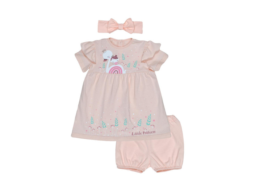 Комплект для девочки (платье,трусики,повязка с бантом) выполнен из качественного, мягкого кулирного полотна (100% хлопок).Платье силуэт – трапеция, застёгивается по спинке на пуговицы, что существенно облегчает переодевание ребенка. Модель с коротким рукавом и рюшей, декорирована оригинальным принтом. Трусики на резинке . Стильная повязка с бантом для полного образа маленькой модницы.