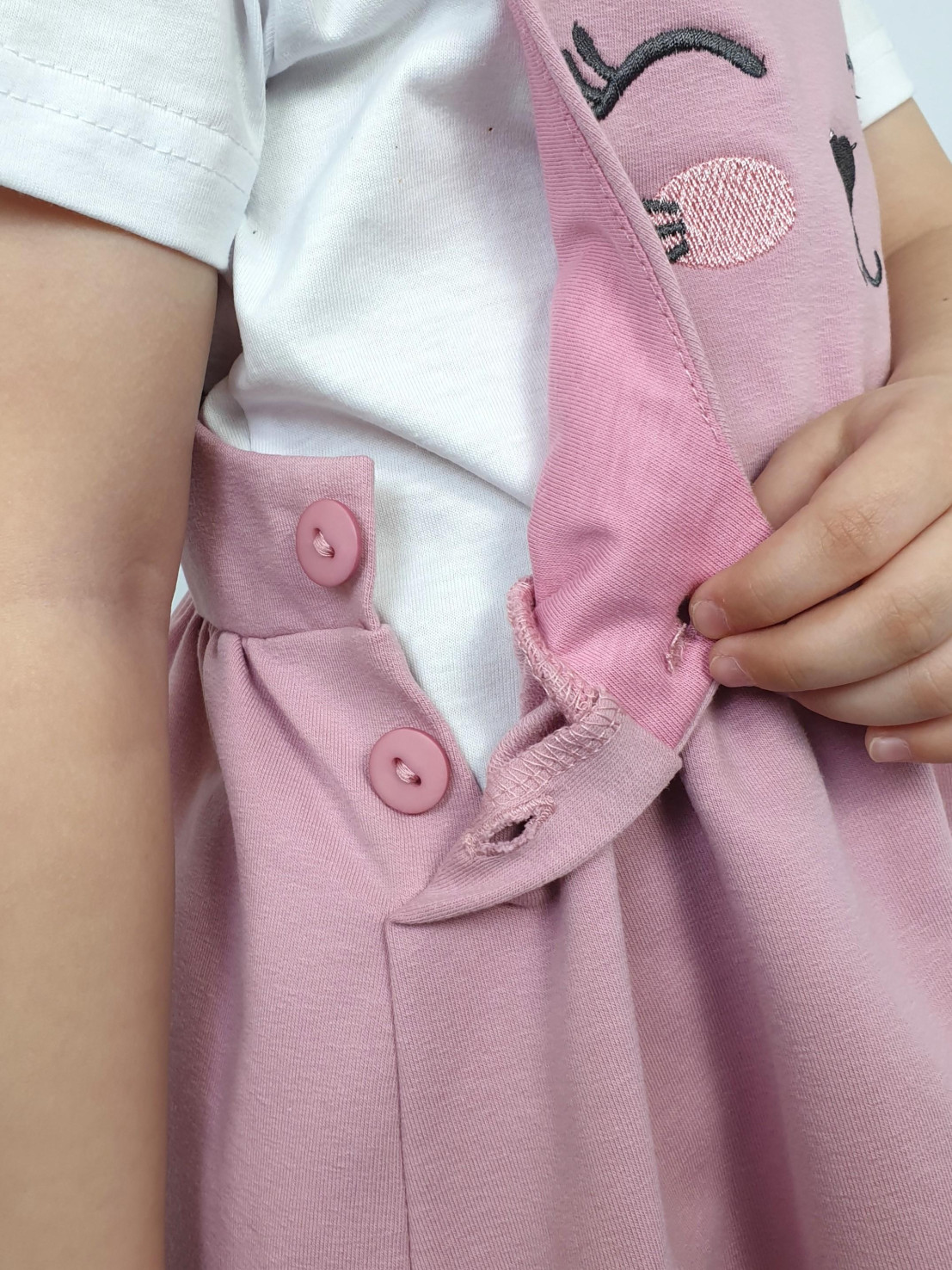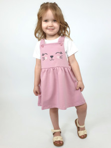 Футер двух- нитка:сарафан 75% х/б,25% п/э. Кулирное полотно:фуфайка 100% х/б. Сарафан-отрезная кокетка с вышивкой по переду.Кокетка переда и спинки на подкладке.Застежка по боковым швам на пуговицы.Юбка со сборкой.Лямки пристегиваются на пуговицы к кокетке,отделочный элемент "ушки" на переде. Фуфайка-прямая,короткий рукав.Горловина обработана ластиком.