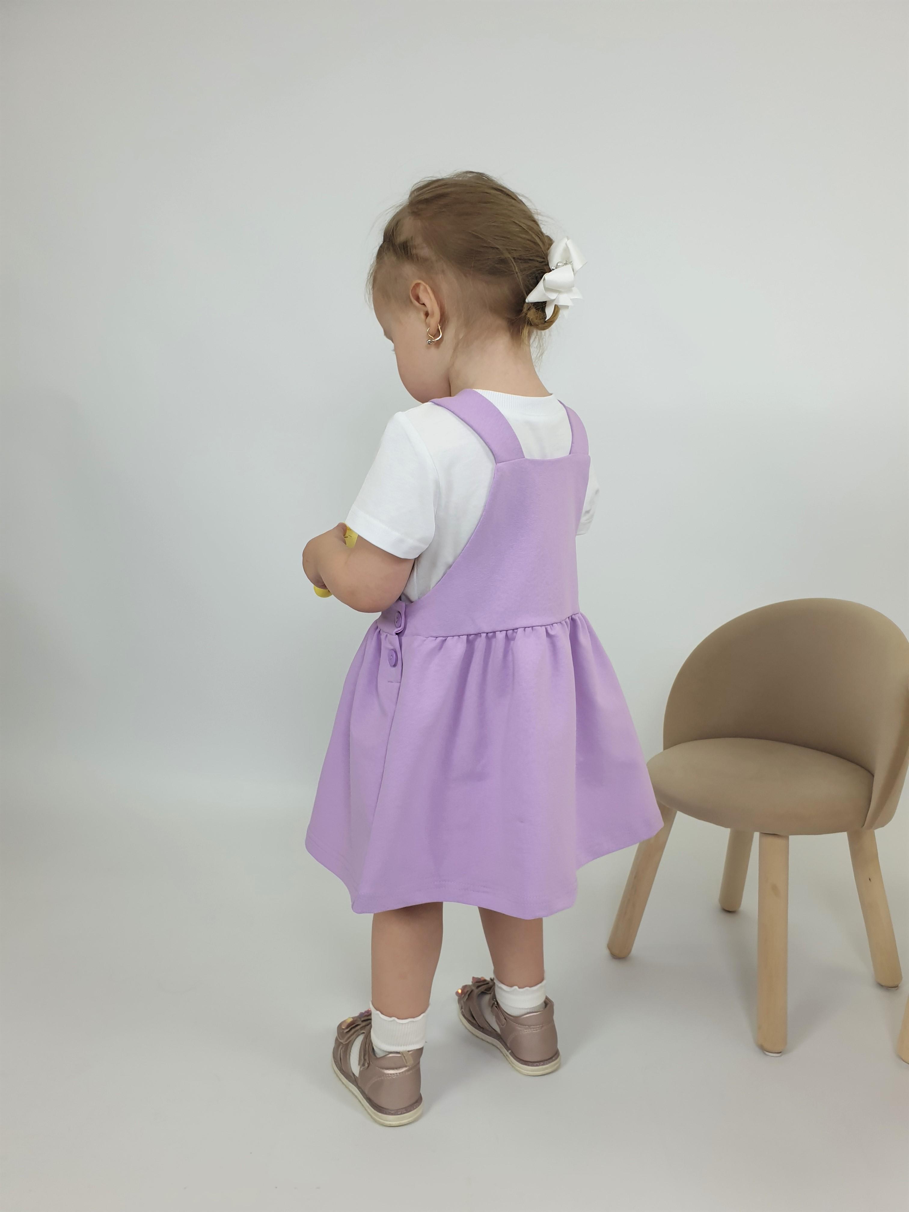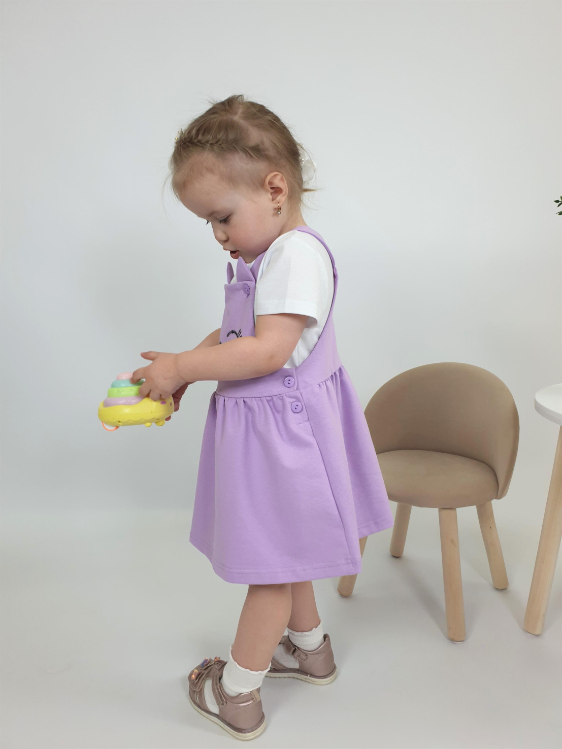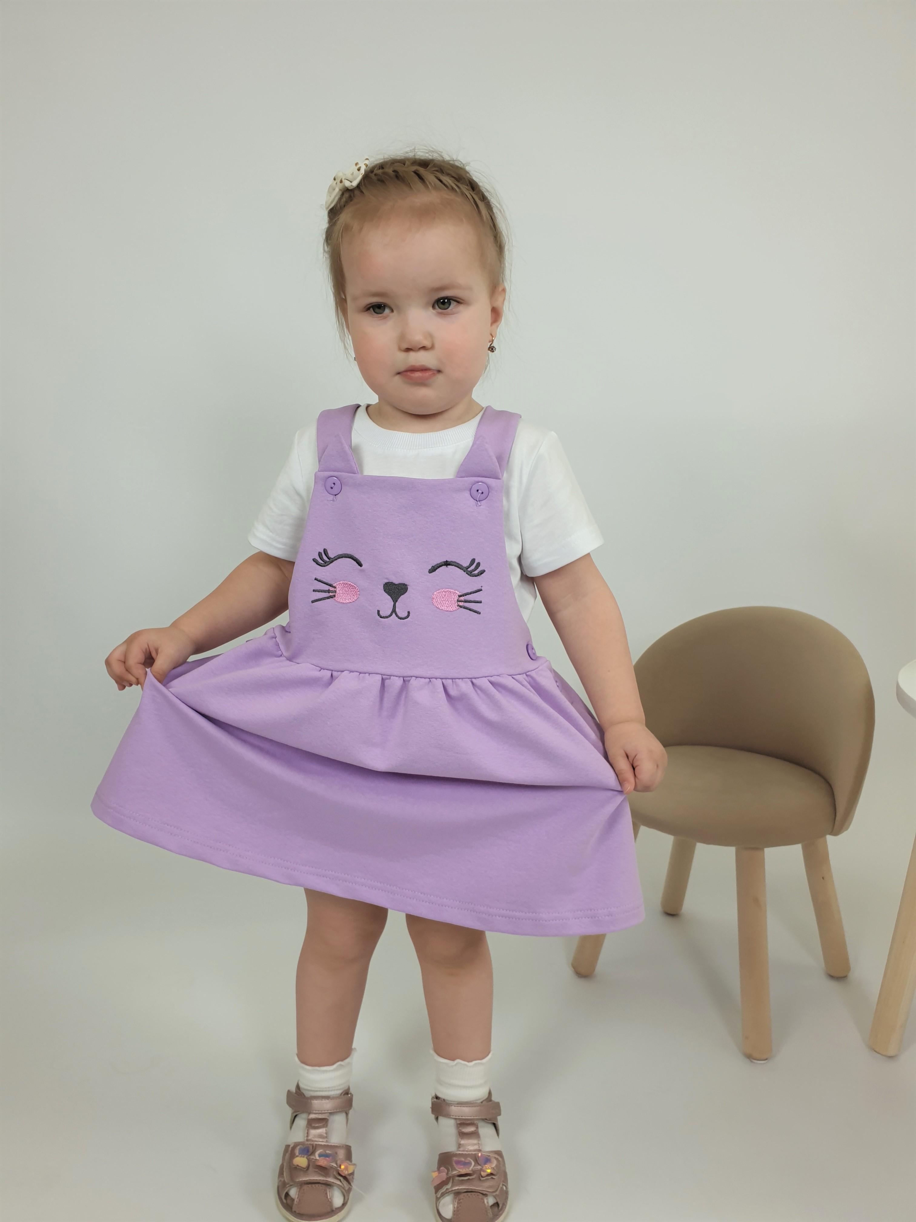 Футер двух- нитка:сарафан 75% х/б,25% п/э. Кулирное полотно:фуфайка 100% х/б. Сарафан-отрезная кокетка с вышивкой по переду.Кокетка переда и спинки на подкладке.Застежка по боковым швам на пуговицы.Юбка со сборкой.Лямки пристегиваются на пуговицы к кокетке,отделочный элемент "ушки" на переде. Фуфайка-прямая,короткий рукав.Горловина обработана ластиком.