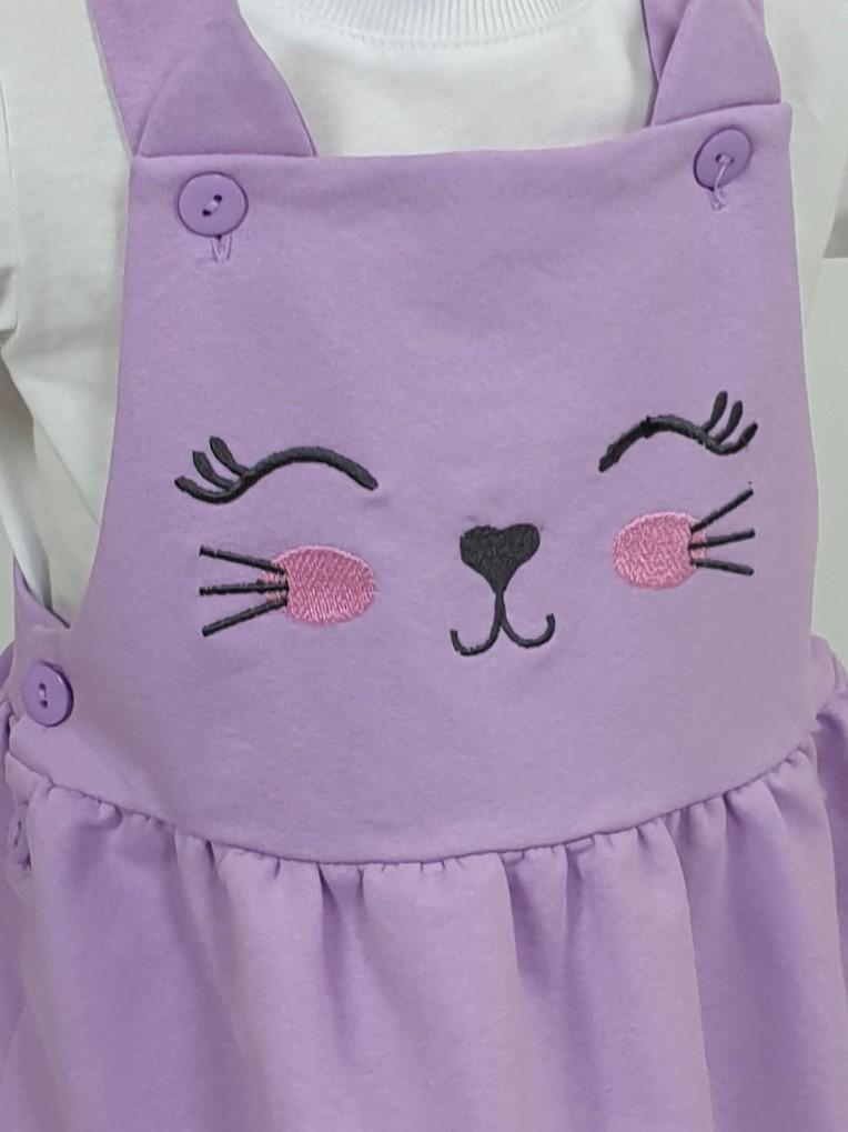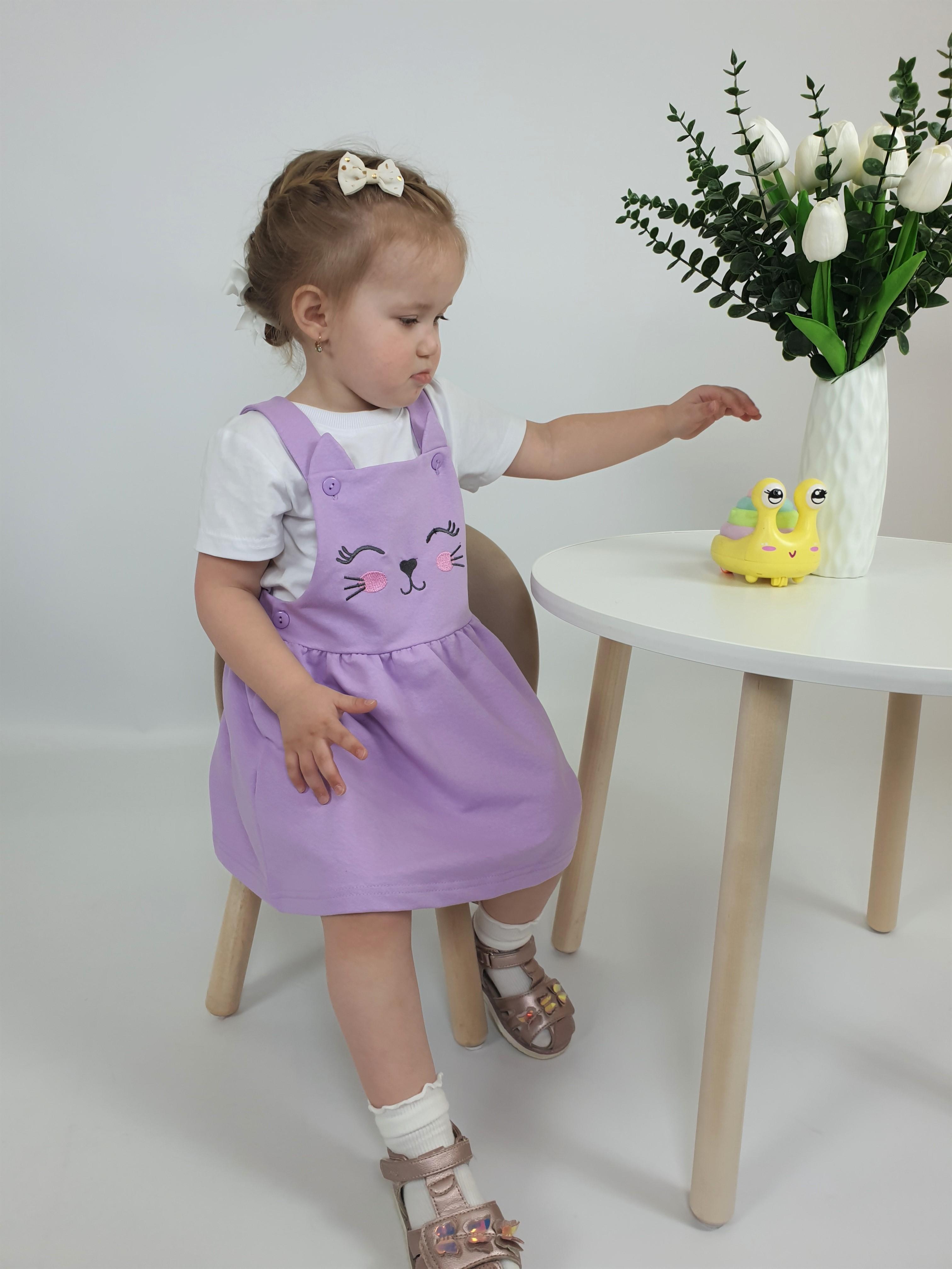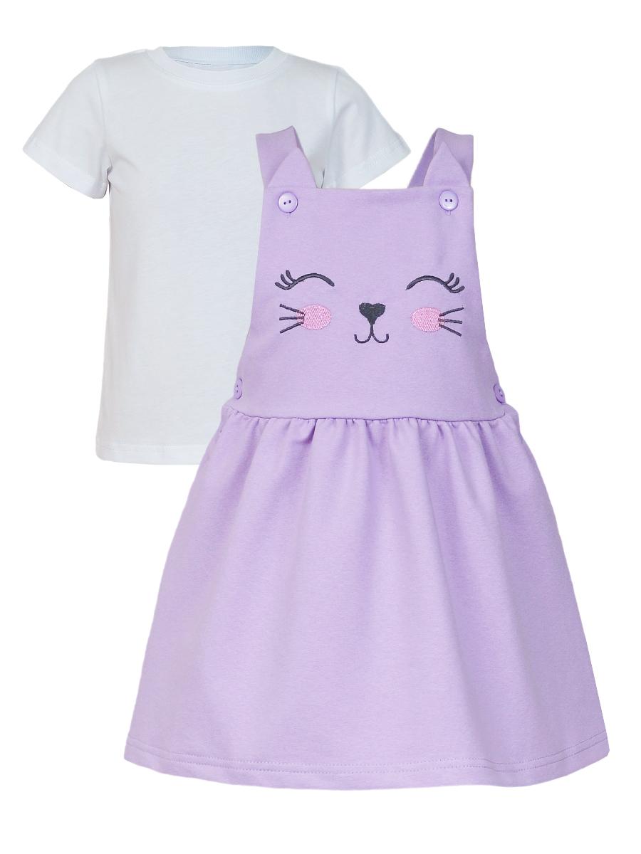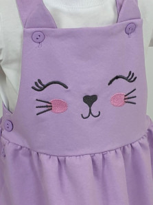 Футер двух- нитка:сарафан 75% х/б,25% п/э. Кулирное полотно:фуфайка 100% х/б. Сарафан-отрезная кокетка с вышивкой по переду.Кокетка переда и спинки на подкладке.Застежка по боковым швам на пуговицы.Юбка со сборкой.Лямки пристегиваются на пуговицы к кокетке,отделочный элемент "ушки" на переде. Фуфайка-прямая,короткий рукав.Горловина обработана ластиком.