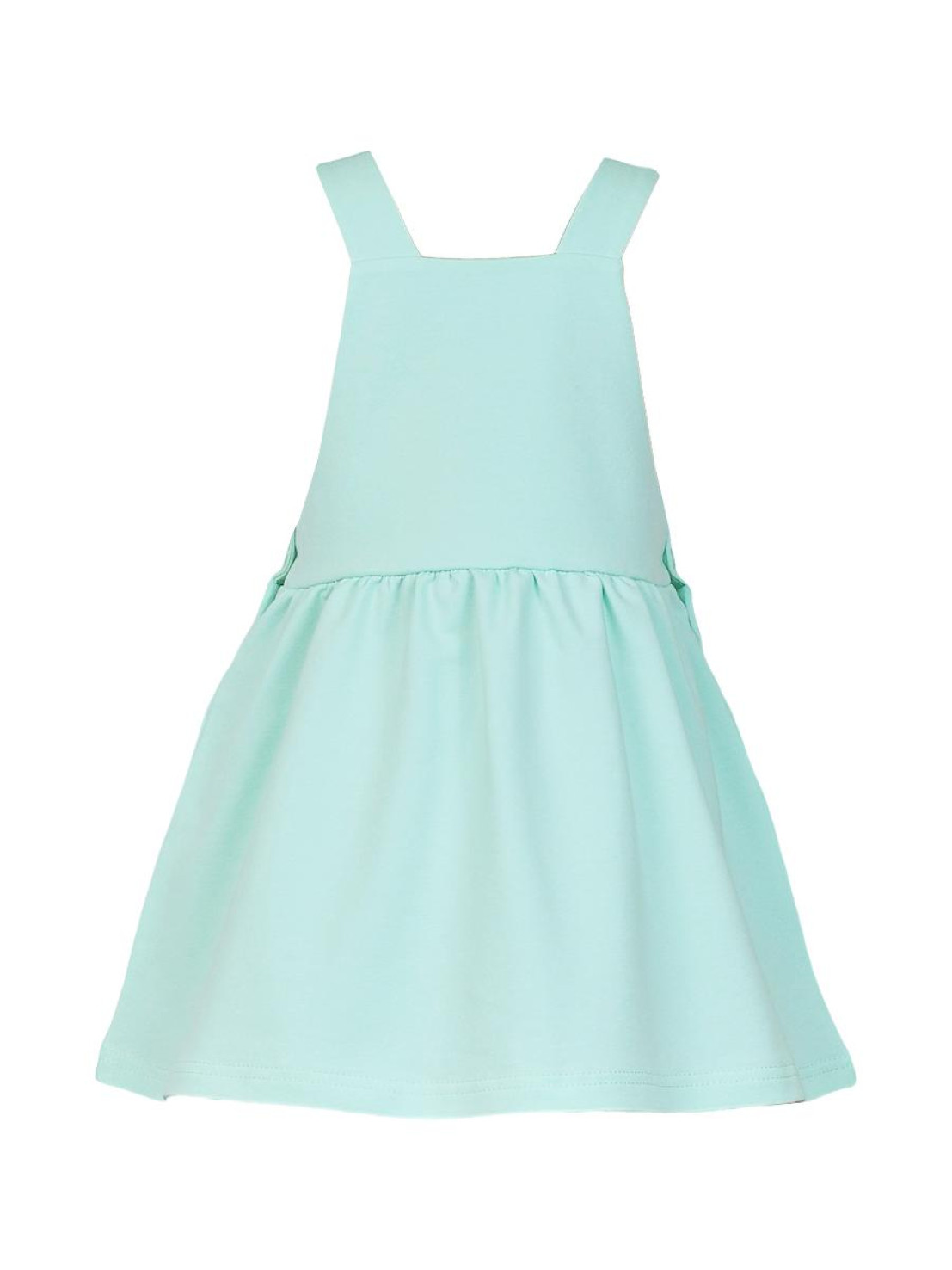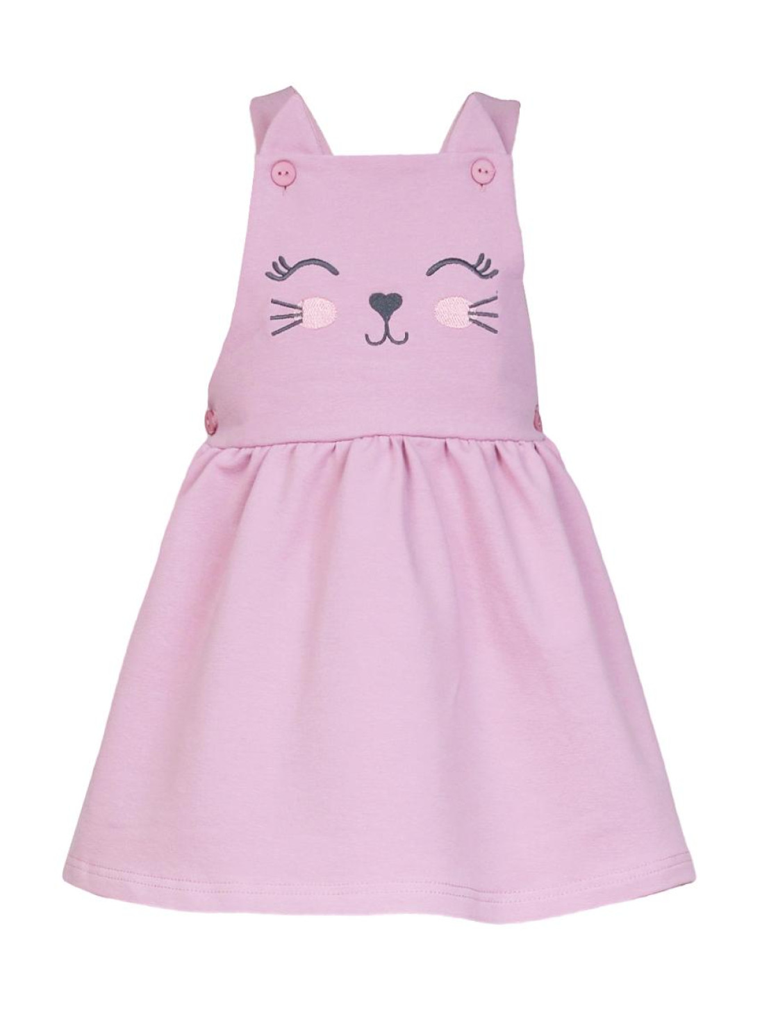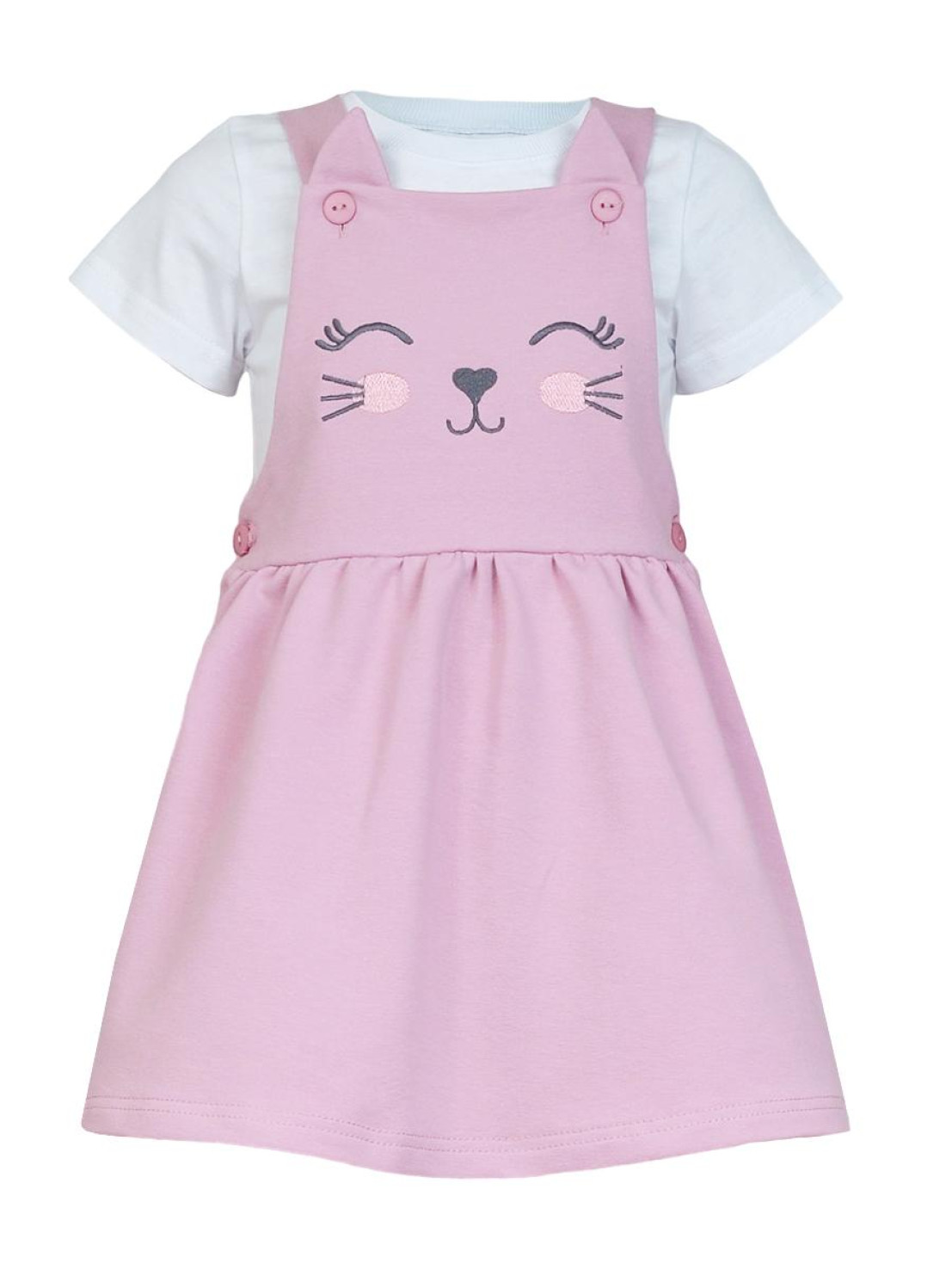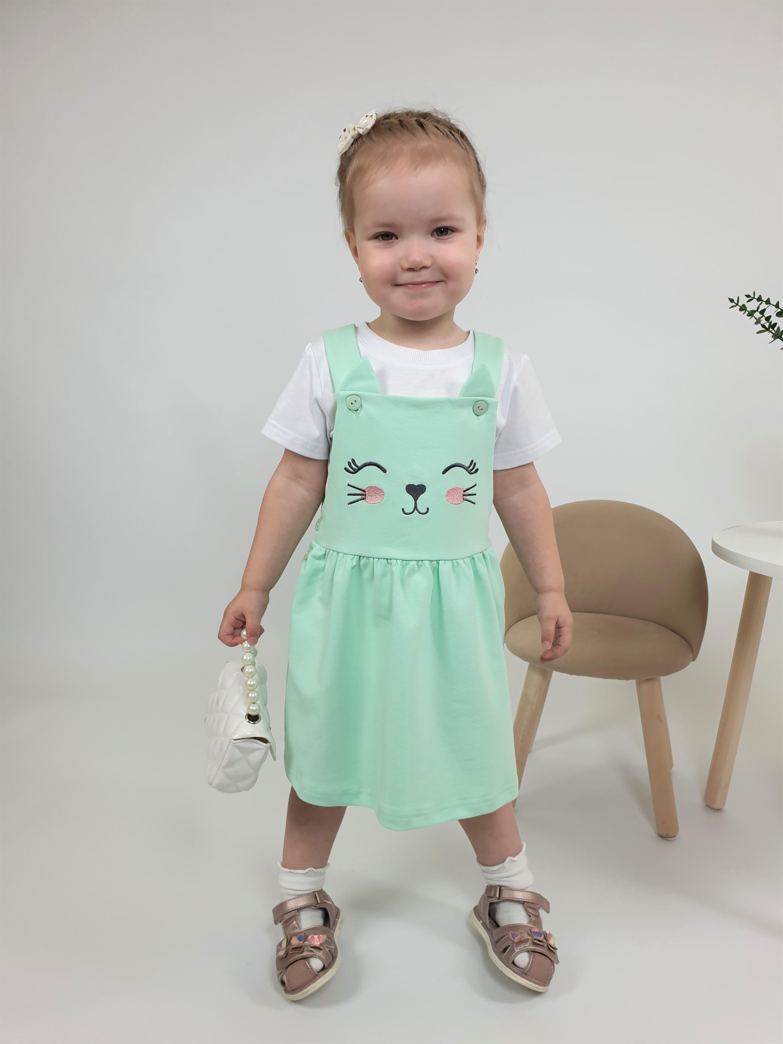 Футер двух- нитка:сарафан 75% х/б,25% п/э. Кулирное полотно:фуфайка 100% х/б. Сарафан-отрезная кокетка с вышивкой по переду.Кокетка переда и спинки на подкладке.Застежка по боковым швам на пуговицы.Юбка со сборкой.Лямки пристегиваются на пуговицы к кокетке,отделочный элемент "ушки" на переде. Фуфайка-прямая,короткий рукав.Горловина обработана ластиком.
