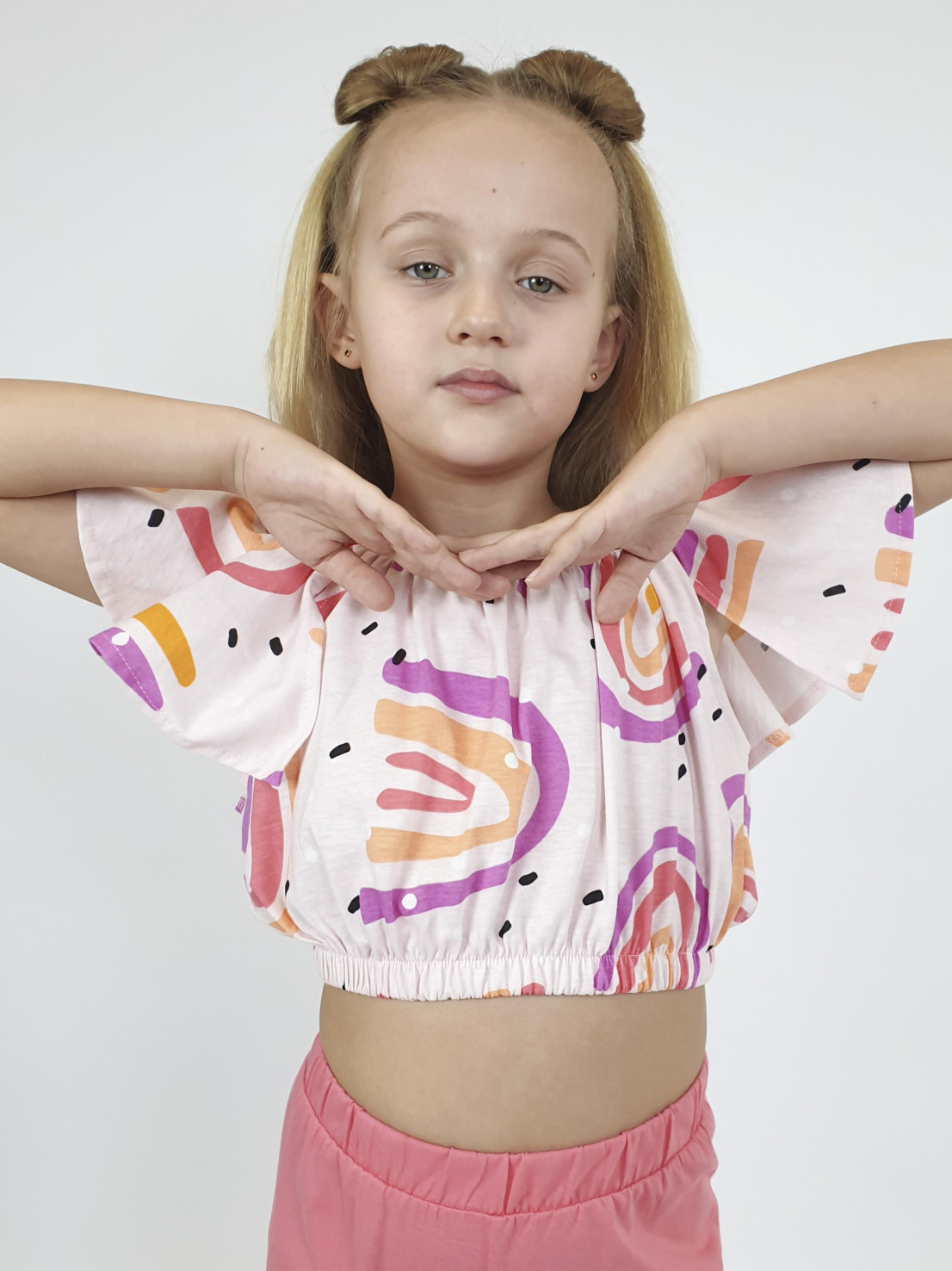 Комплект для девочки. Кулирное полотно: 100% х/б. Топ-короткий с крылышками по пройме,на резинке по горловине и внизу. Брюки-укороченные,прямые на поясе с резинкой.