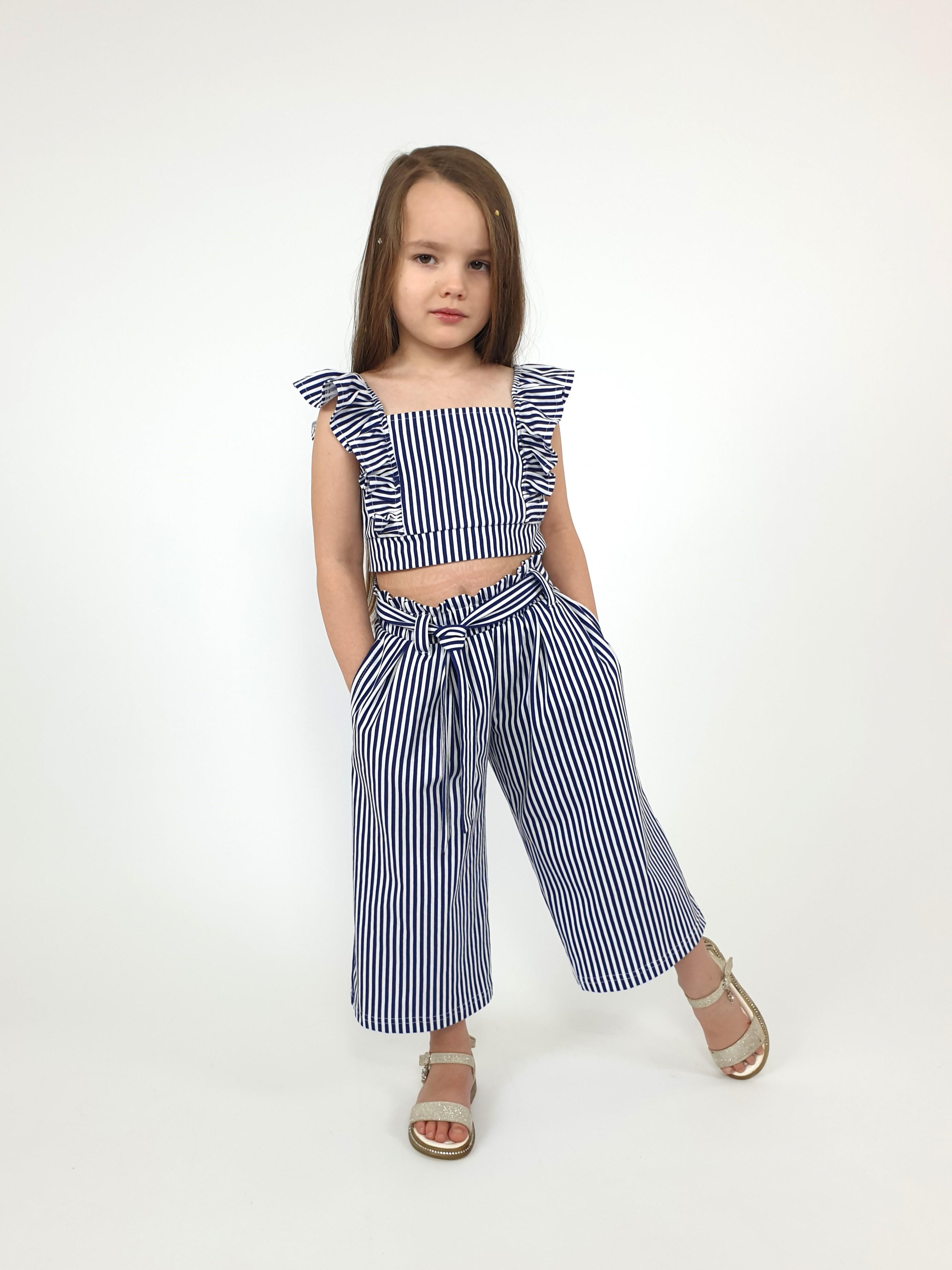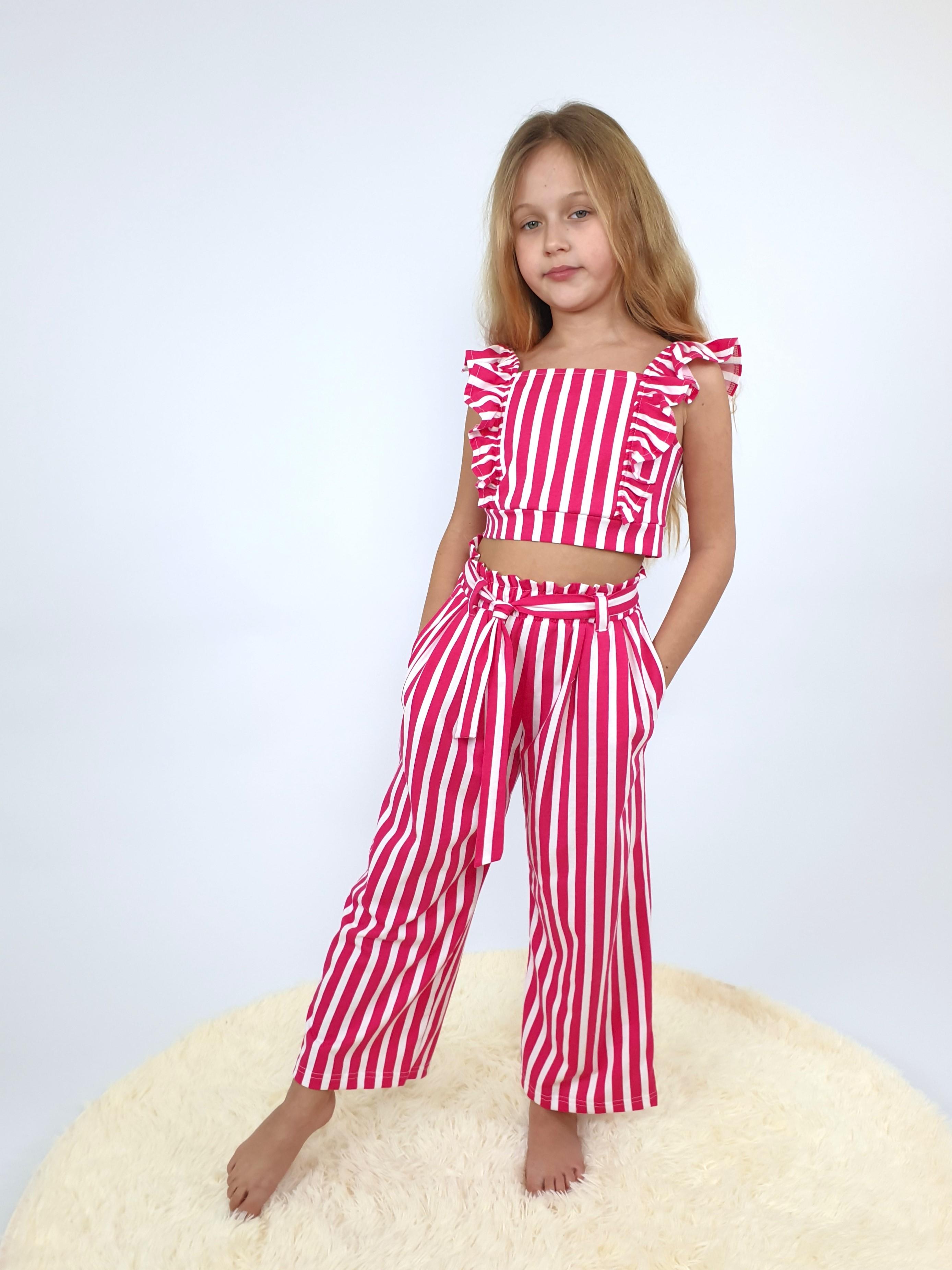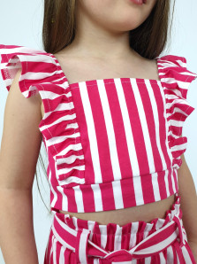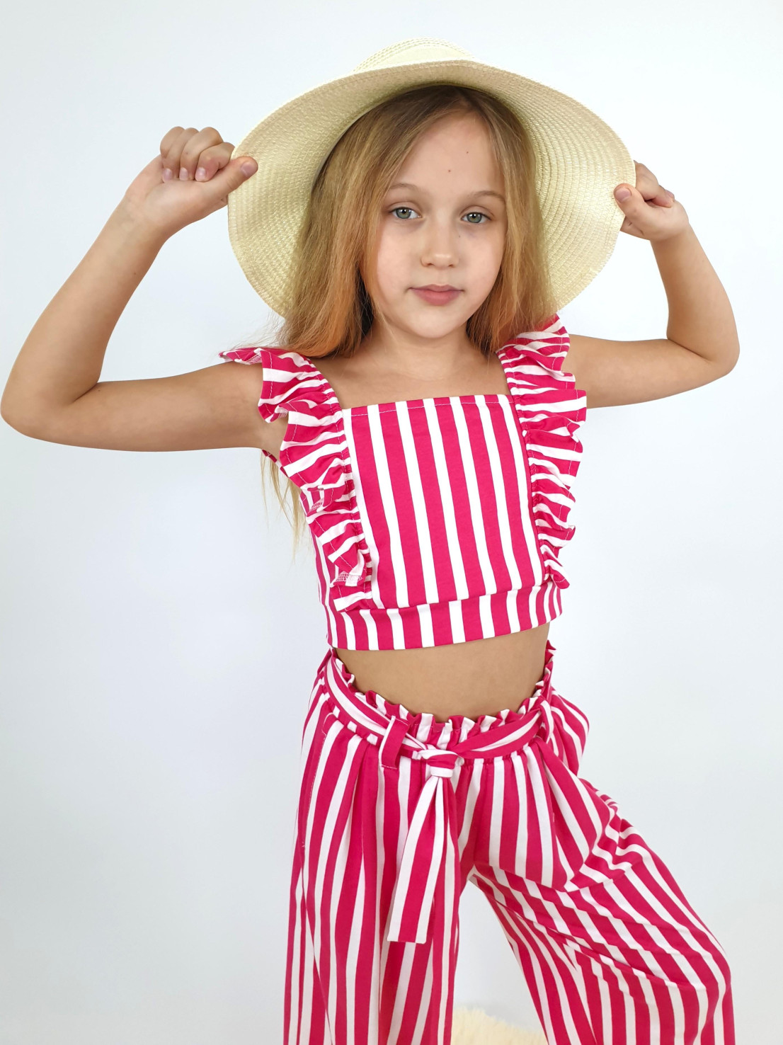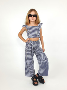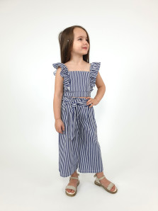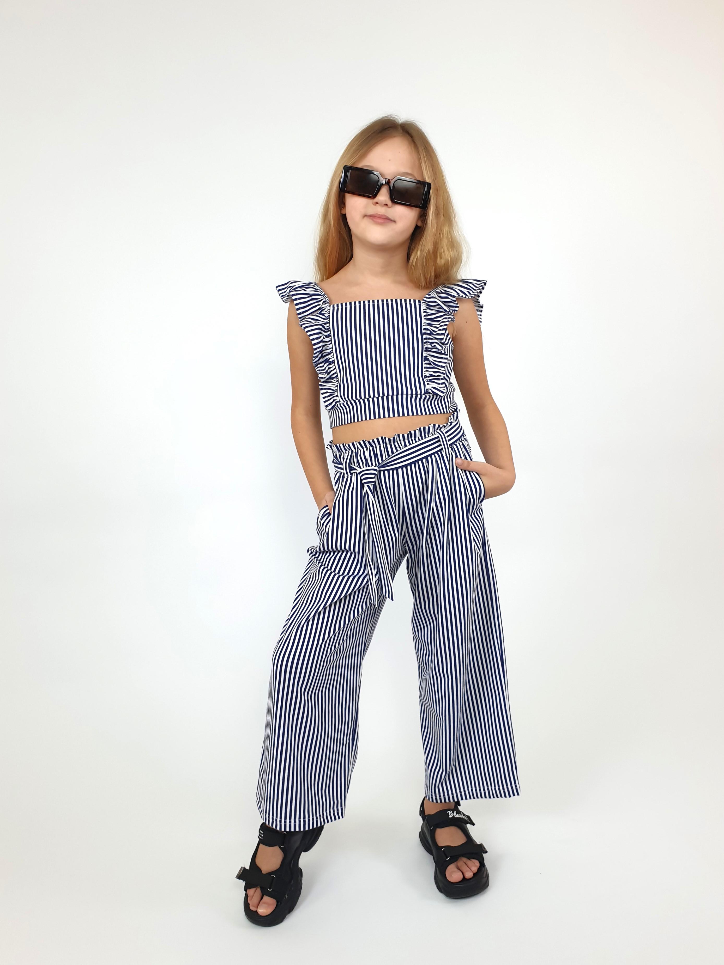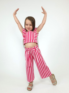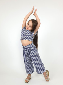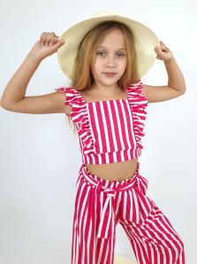 Комплект для девочки.Кулирное полотно: 100% х/б. Топ-на брителях с рюшками,притачной пояс,застежка по спинке на пуговицы. Брюки-прямые,укороченные,мягкие встречные складки на переде.Притачной пояс с резинкой,два кармана в боковом шве.Отделочный завязывающийся пояс,фиксирован шлевками.