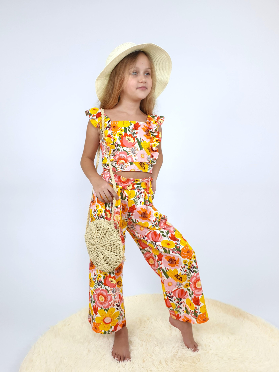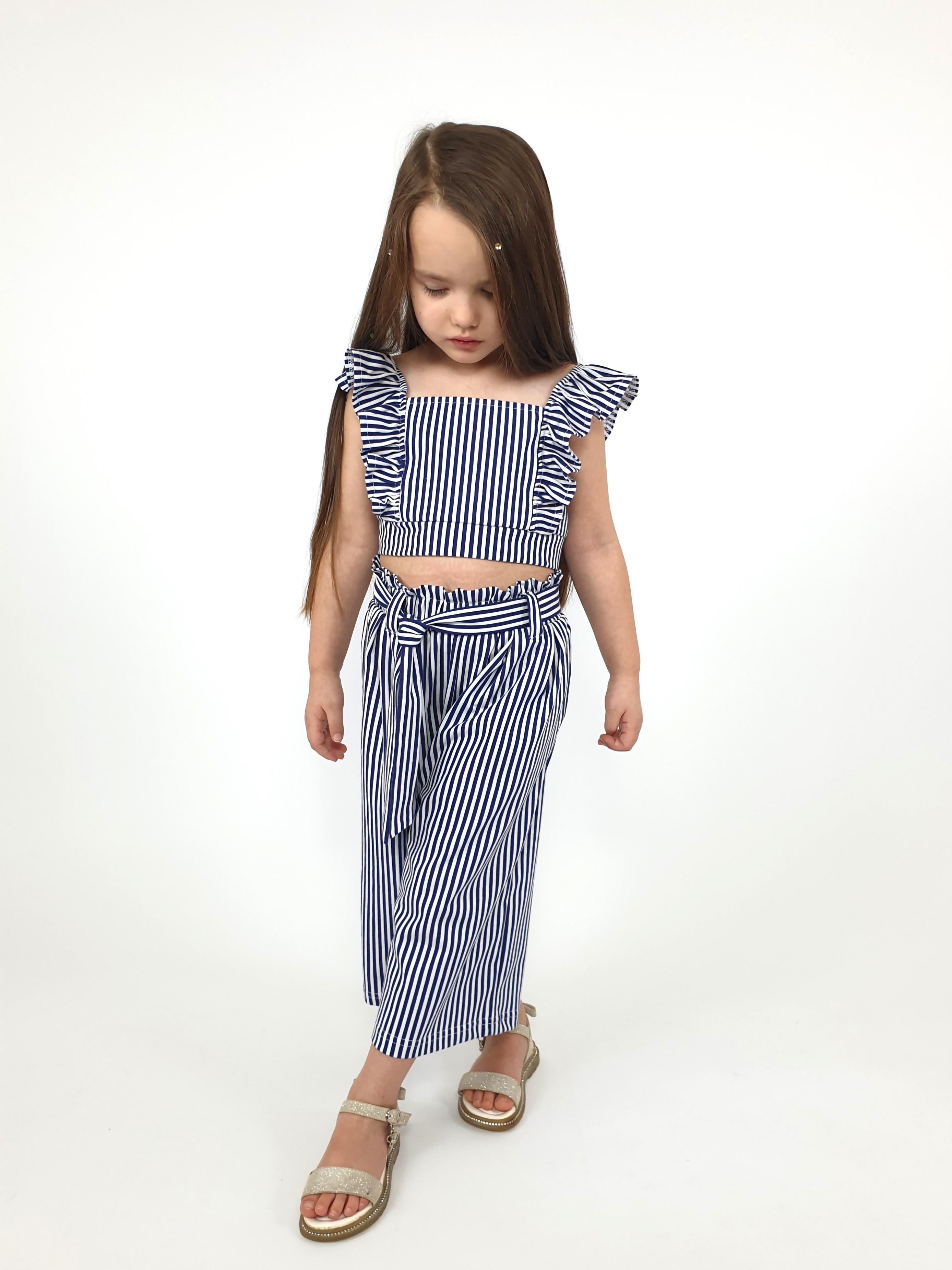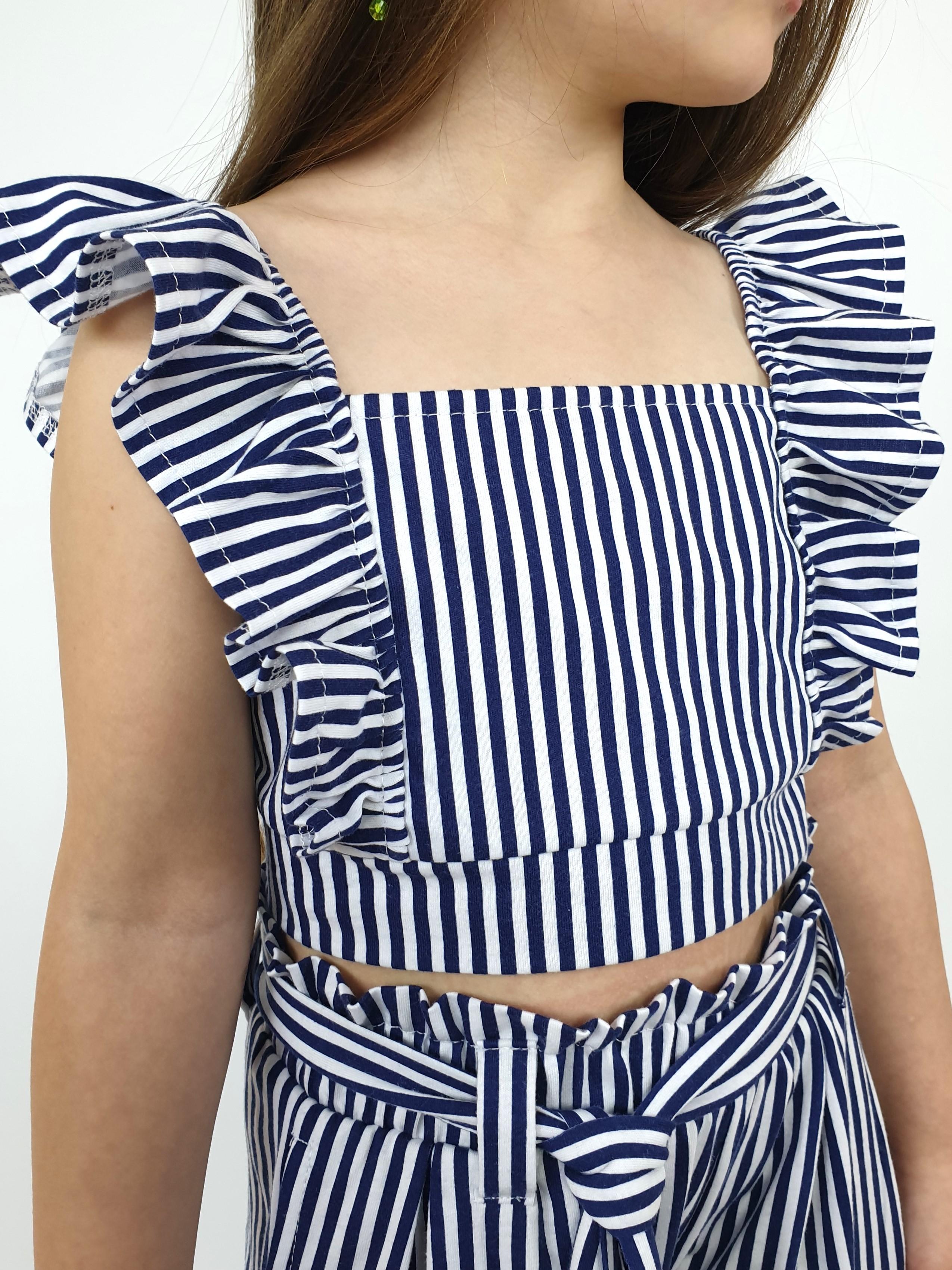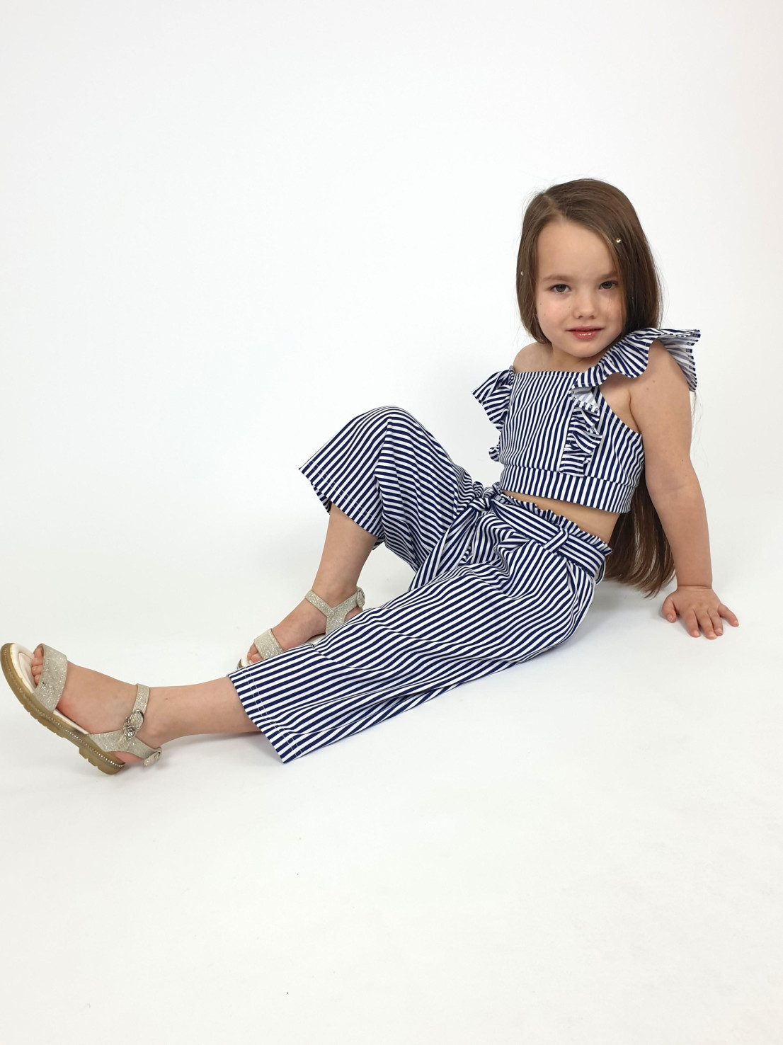 Комплект для девочки.Кулирное полотно: 100% х/б. Топ-на брителях с рюшками,притачной пояс,застежка по спинке на пуговицы. Брюки-прямые,укороченные,мягкие встречные складки на переде.Притачной пояс с резинкой,два кармана в боковом шве.Отделочный завязывающийся пояс,фиксирован шлевками.