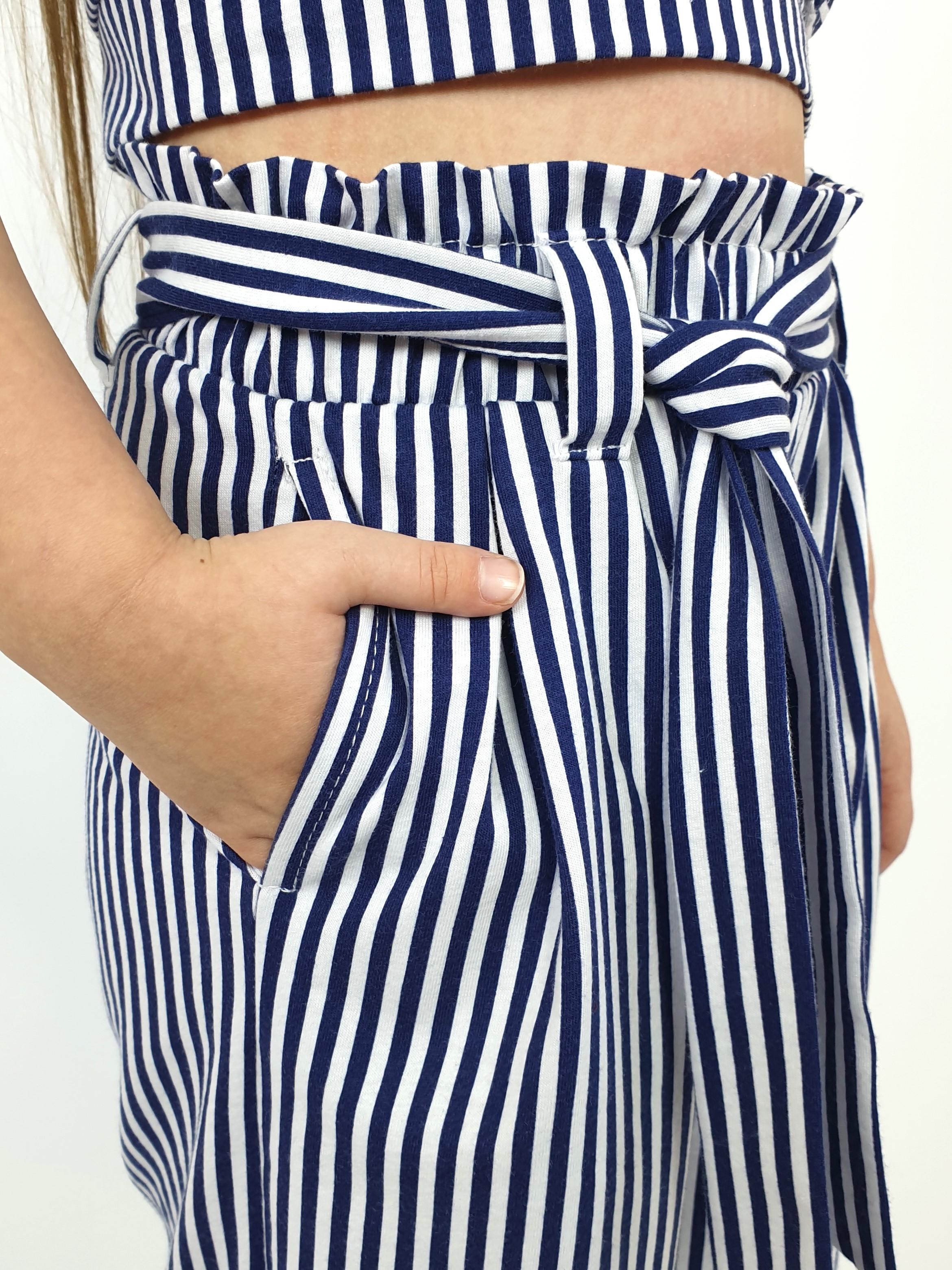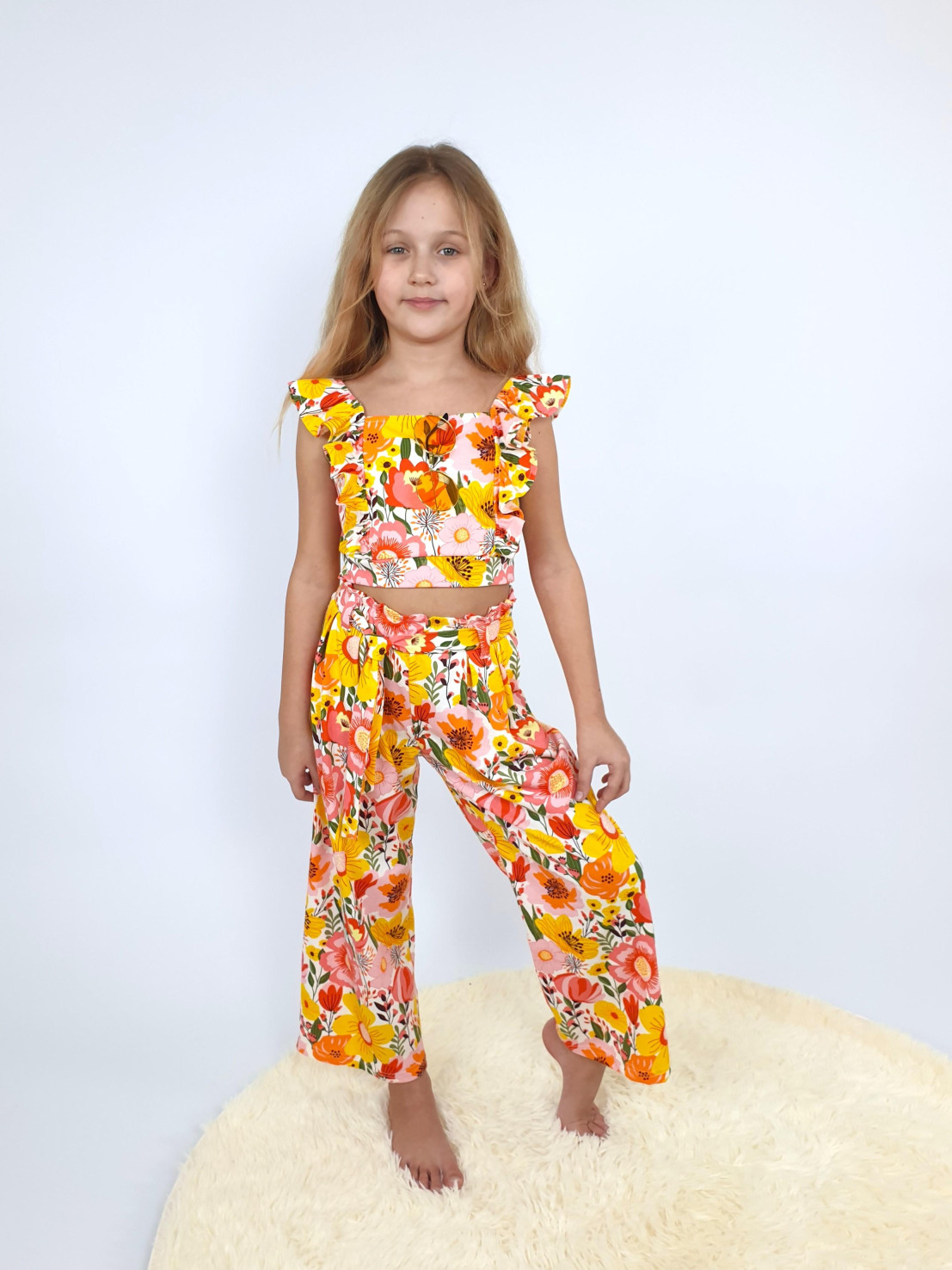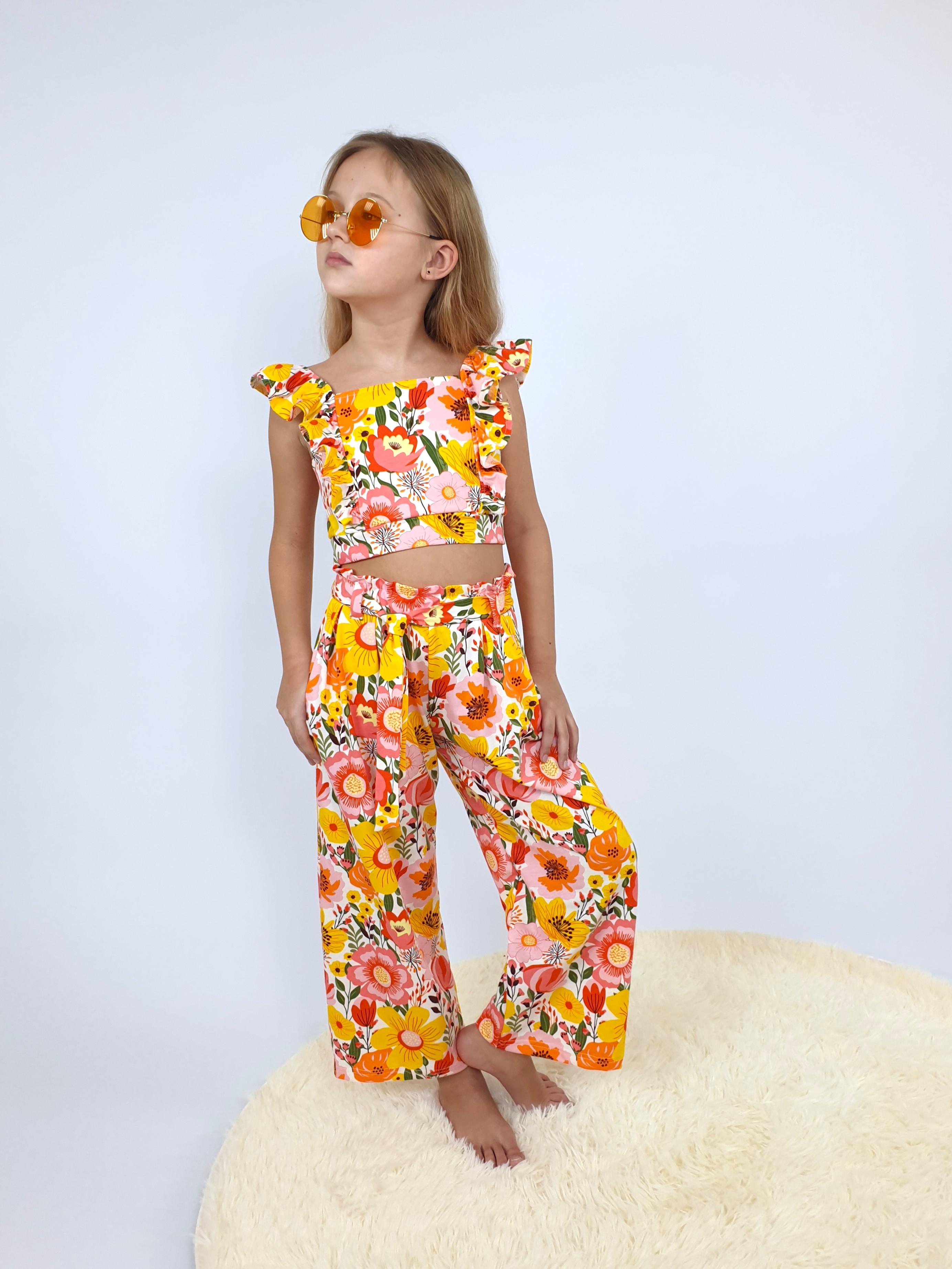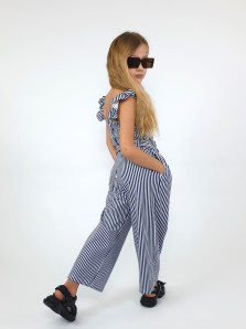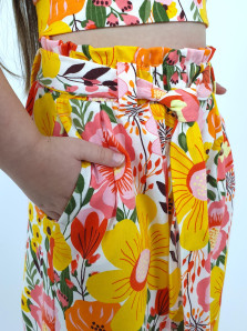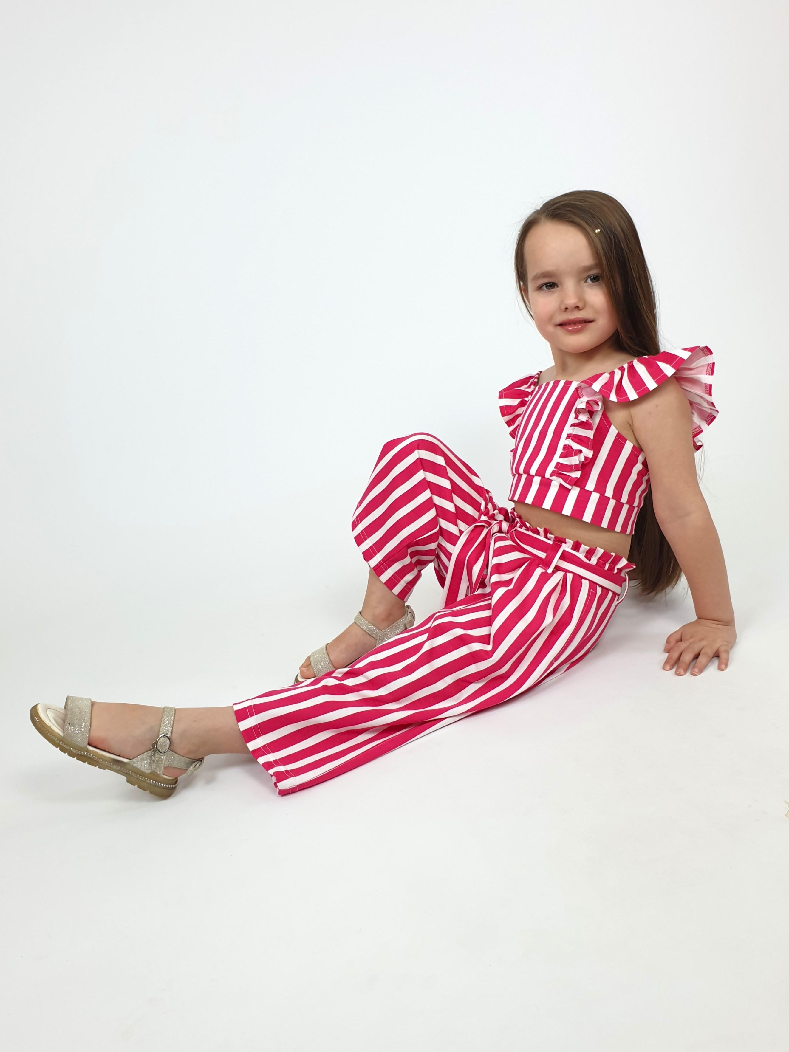 Комплект для девочки.Кулирное полотно: 100% х/б. Топ-на брителях с рюшками,притачной пояс,застежка по спинке на пуговицы. Брюки-прямые,укороченные,мягкие встречные складки на переде.Притачной пояс с резинкой,два кармана в боковом шве.Отделочный завязывающийся пояс,фиксирован шлевками.