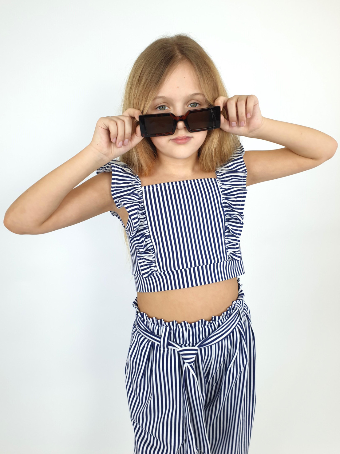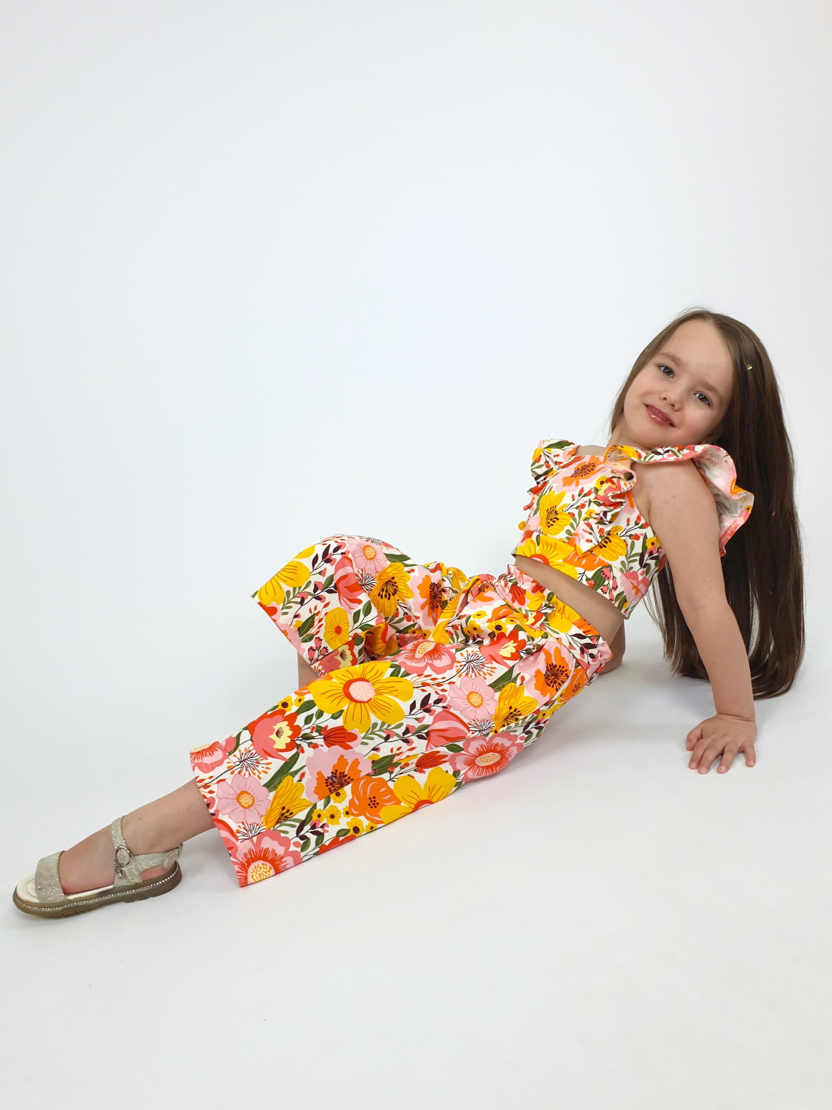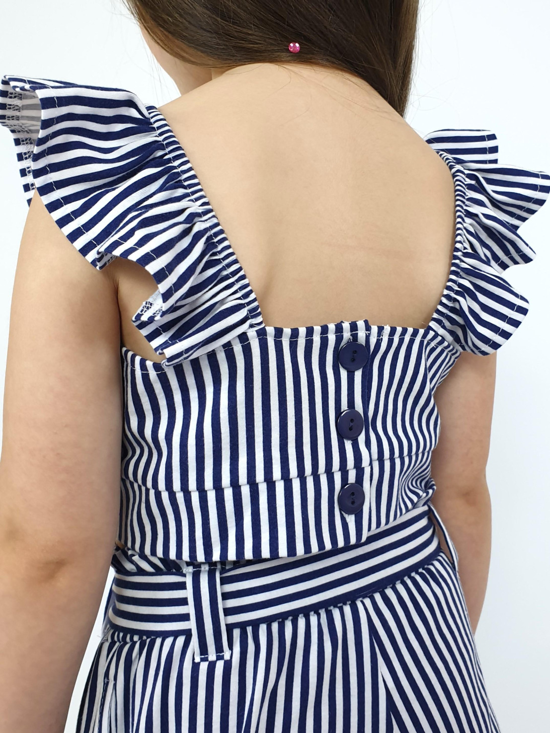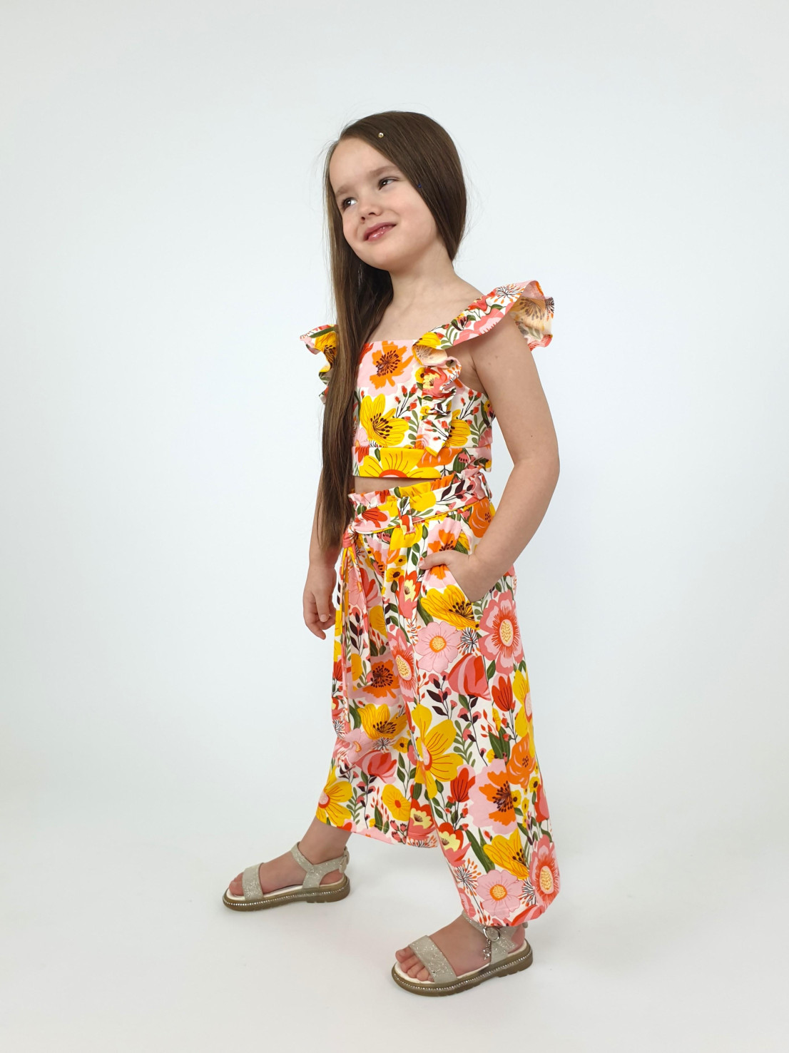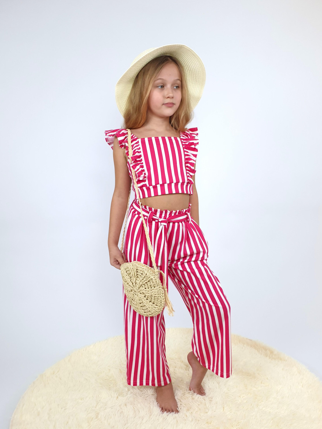 Комплект для девочки.Кулирное полотно: 100% х/б. Топ-на брителях с рюшками,притачной пояс,застежка по спинке на пуговицы. Брюки-прямые,укороченные,мягкие встречные складки на переде.Притачной пояс с резинкой,два кармана в боковом шве.Отделочный завязывающийся пояс,фиксирован шлевками.