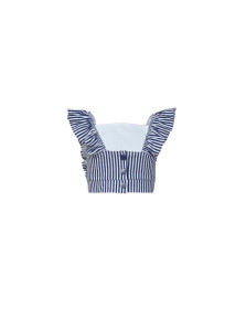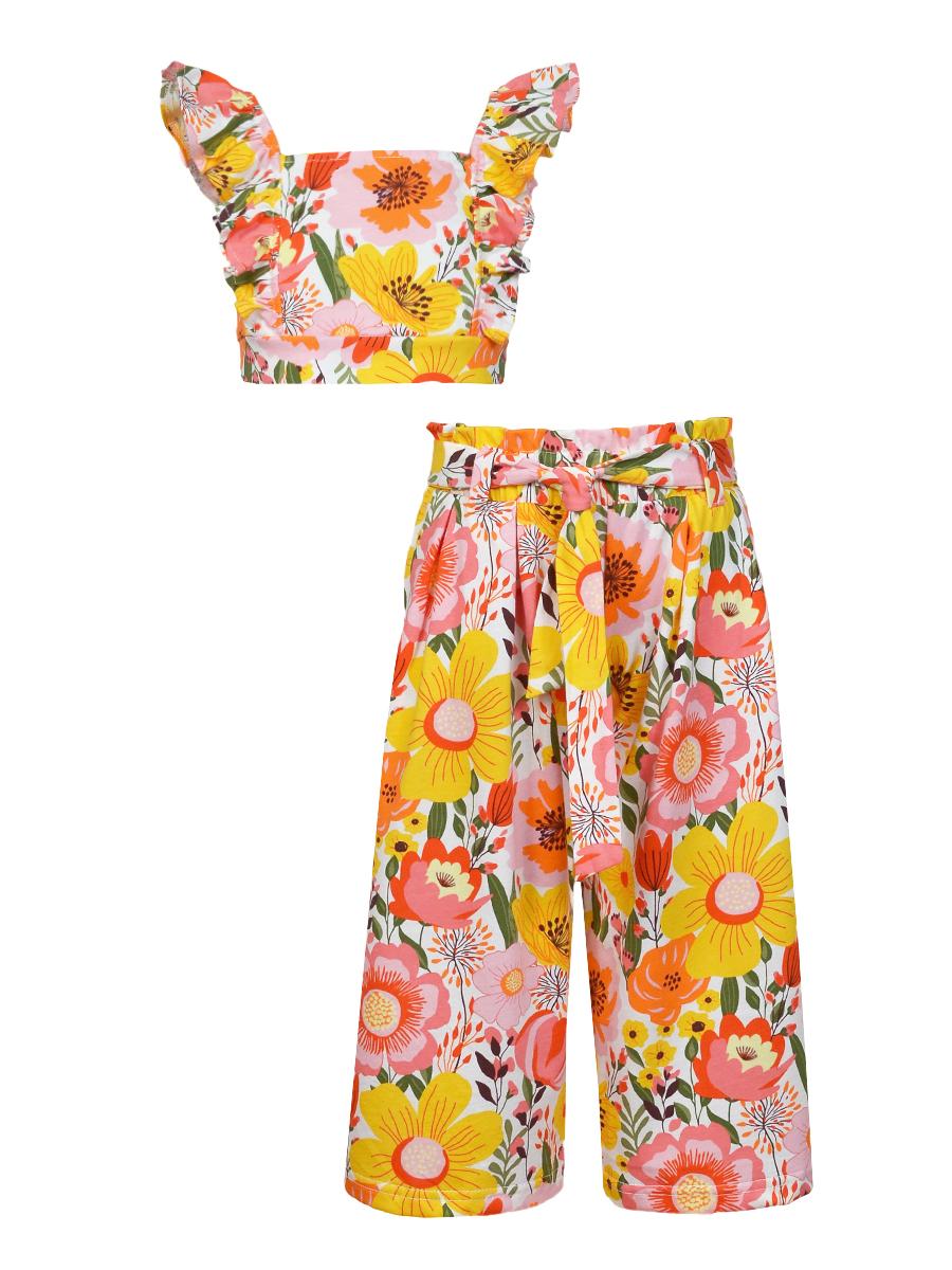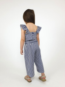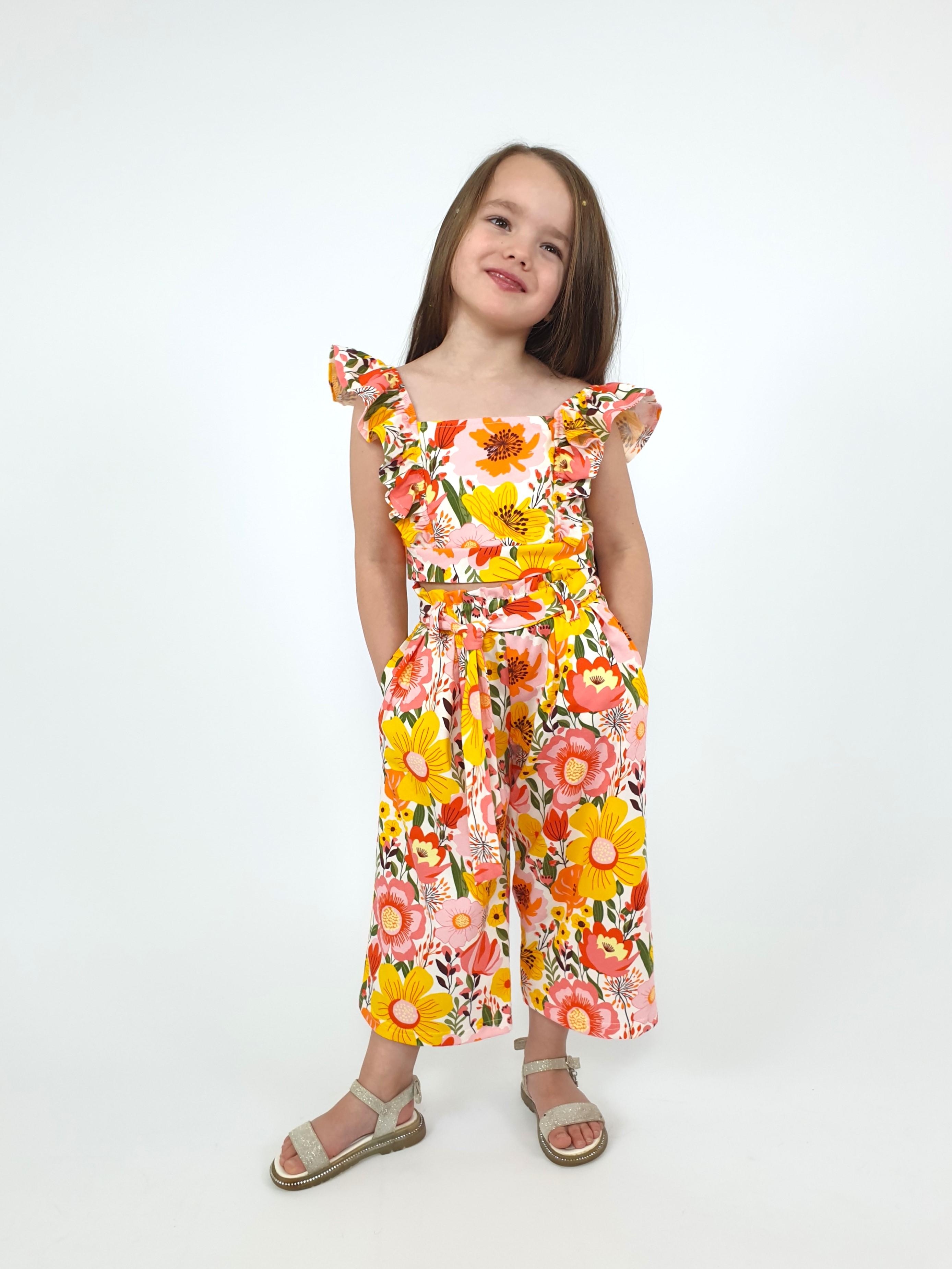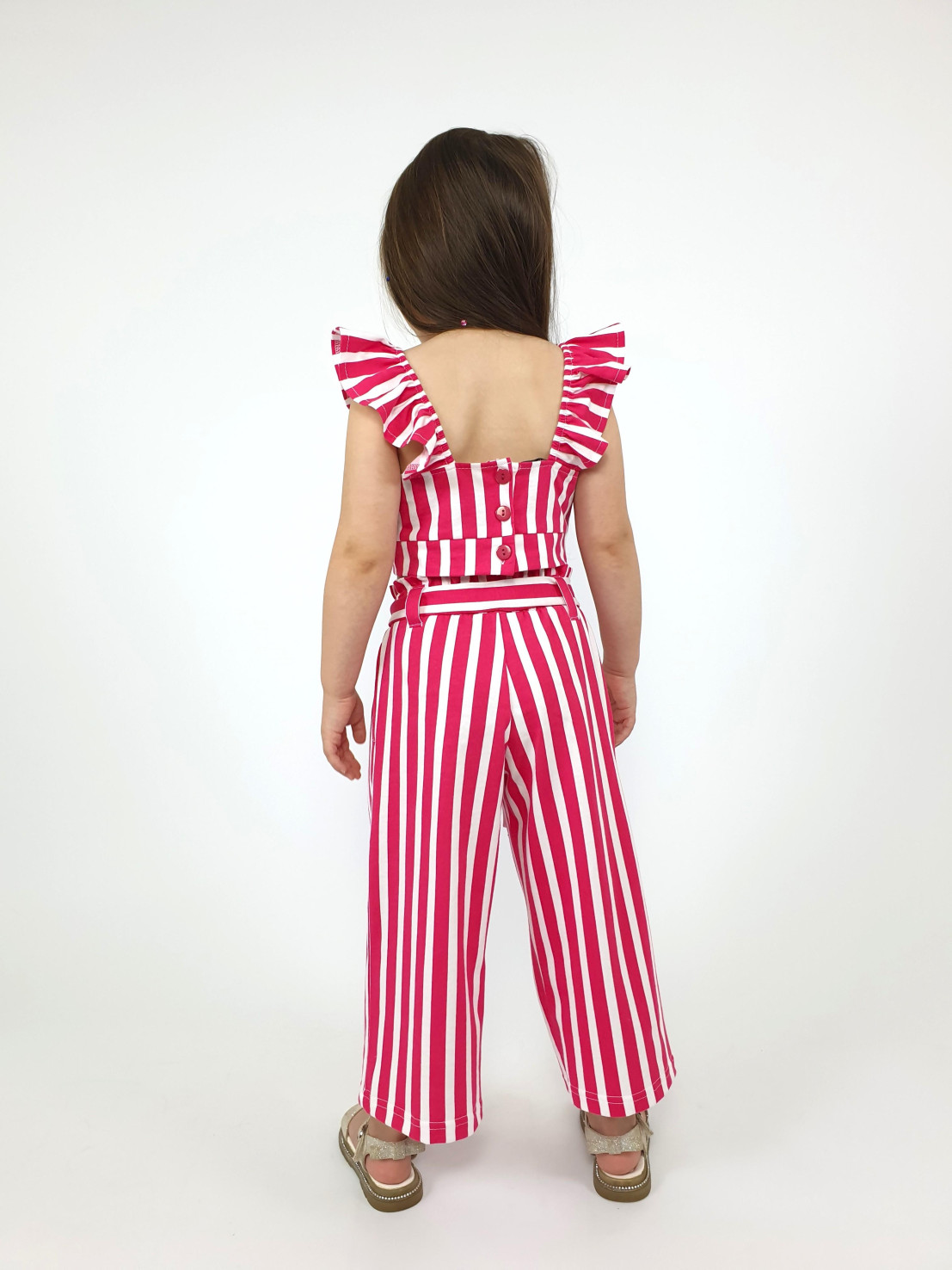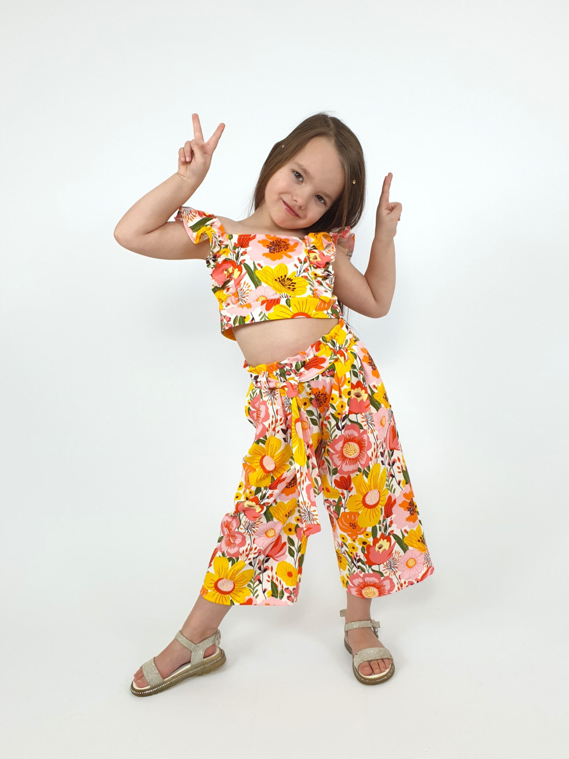 Комплект для девочки.Кулирное полотно: 100% х/б. Топ-на брителях с рюшками,притачной пояс,застежка по спинке на пуговицы. Брюки-прямые,укороченные,мягкие встречные складки на переде.Притачной пояс с резинкой,два кармана в боковом шве.Отделочный завязывающийся пояс,фиксирован шлевками.