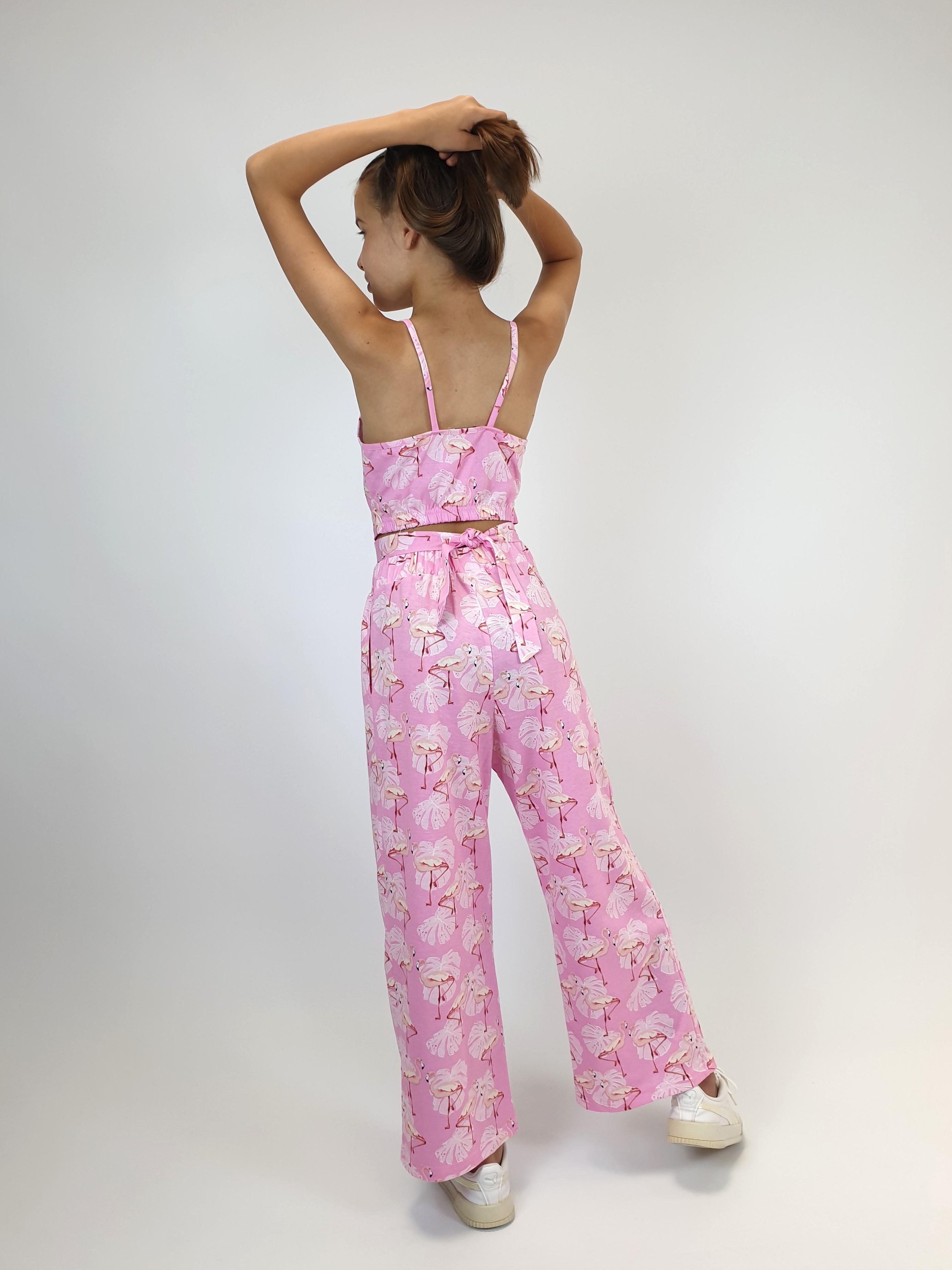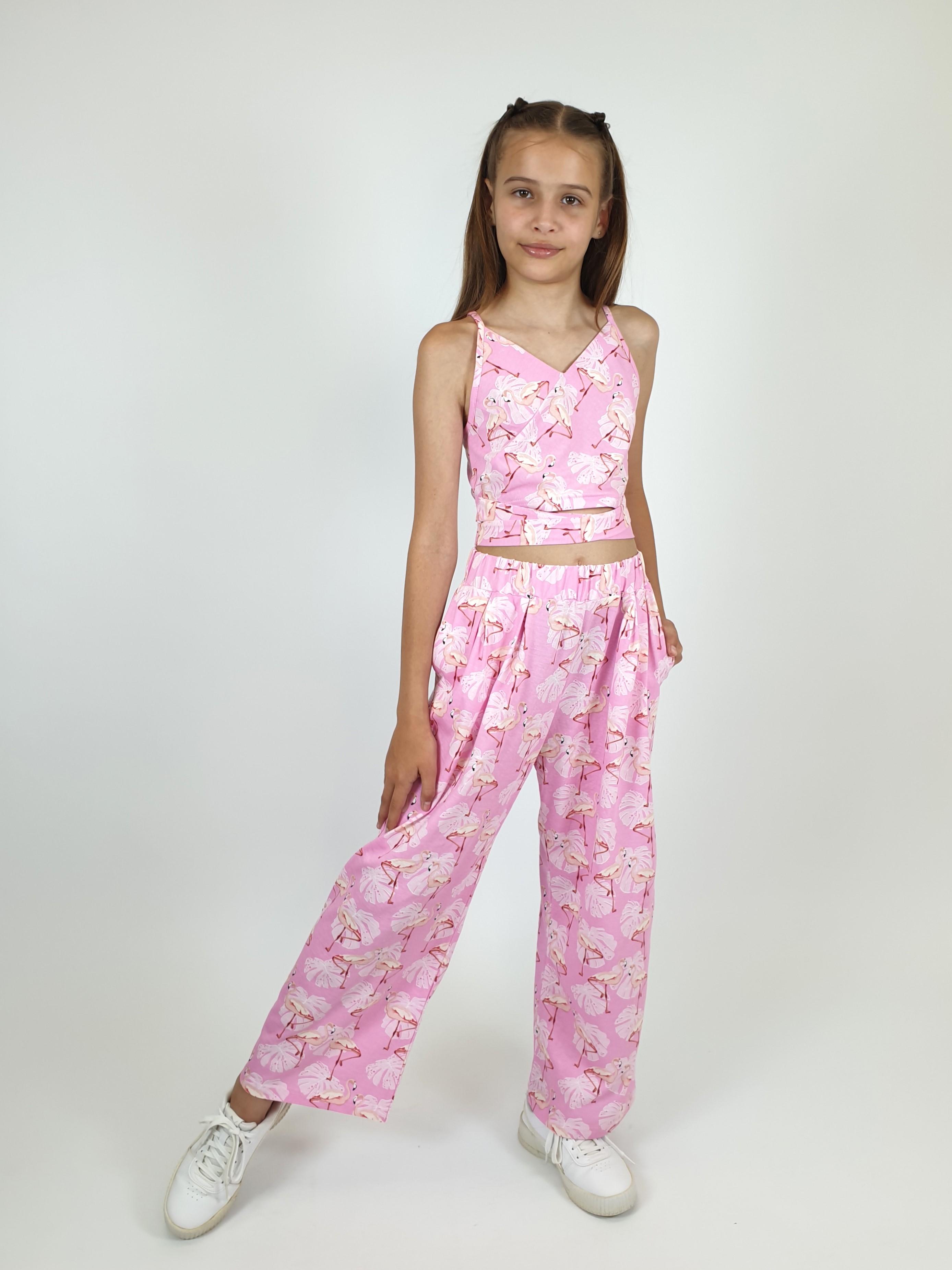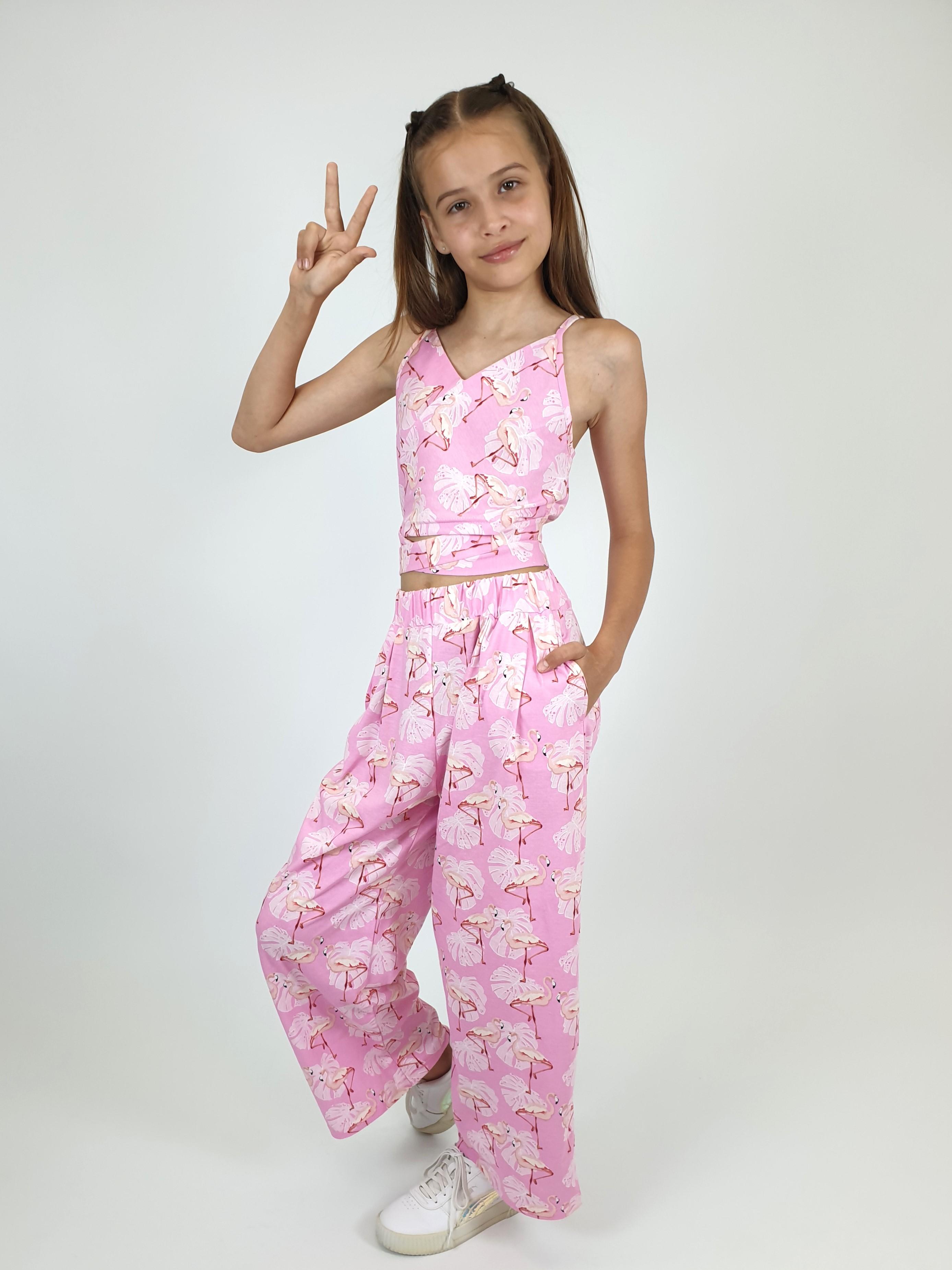 Комплект для девочки. Кулирное полотно: 100% х/б. Топ-на бретелях,имитация на "запах"по переду.На спинке внизу вставлена резинка.Длинный пояс из боковых швов. Брюки-прямые,длинные,мягкие встречные складки на переде.Притачной пояс с резинкой,два кармана в боковом шве.