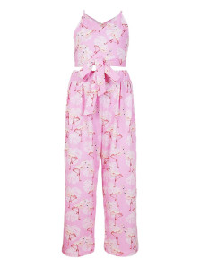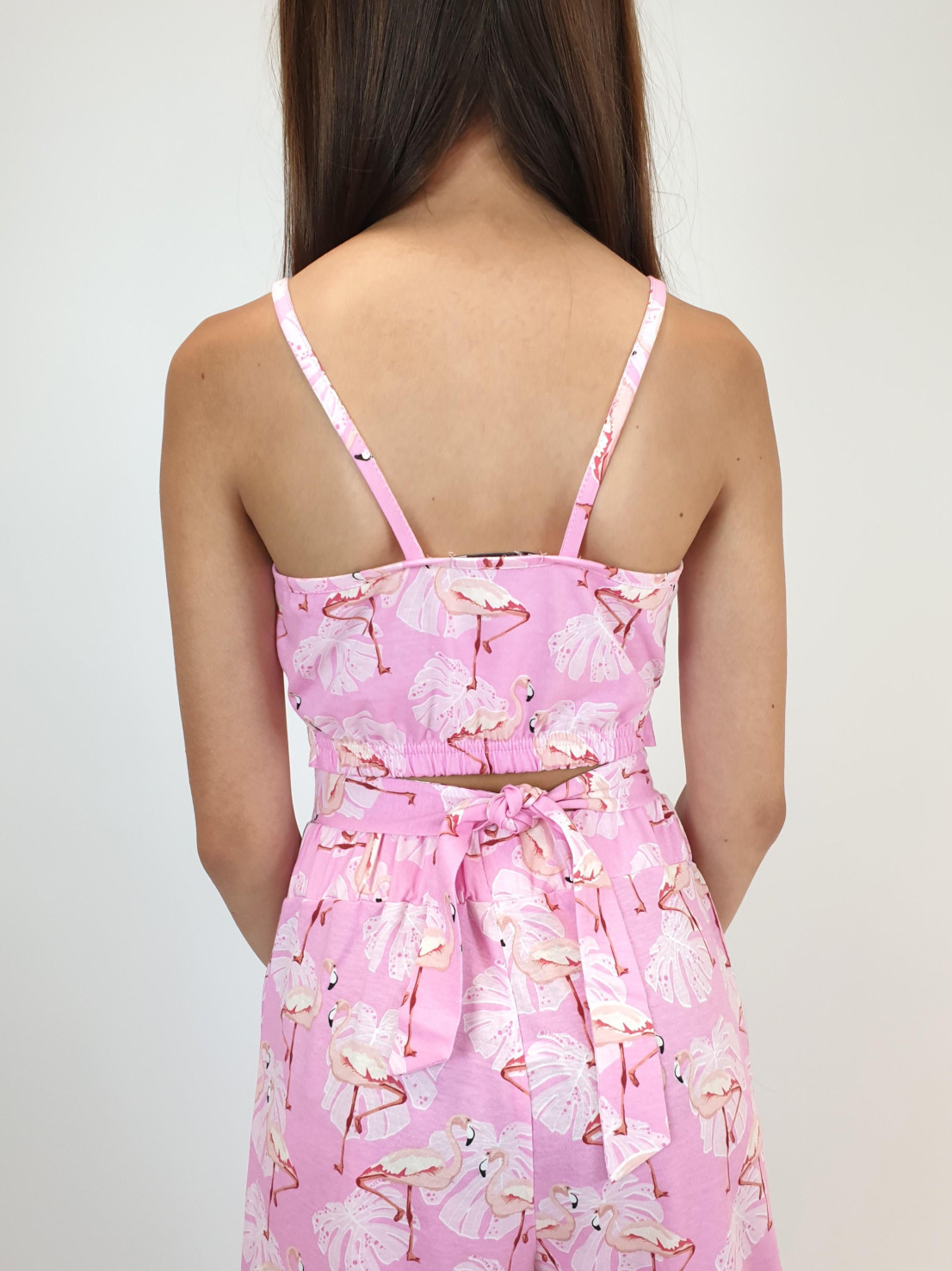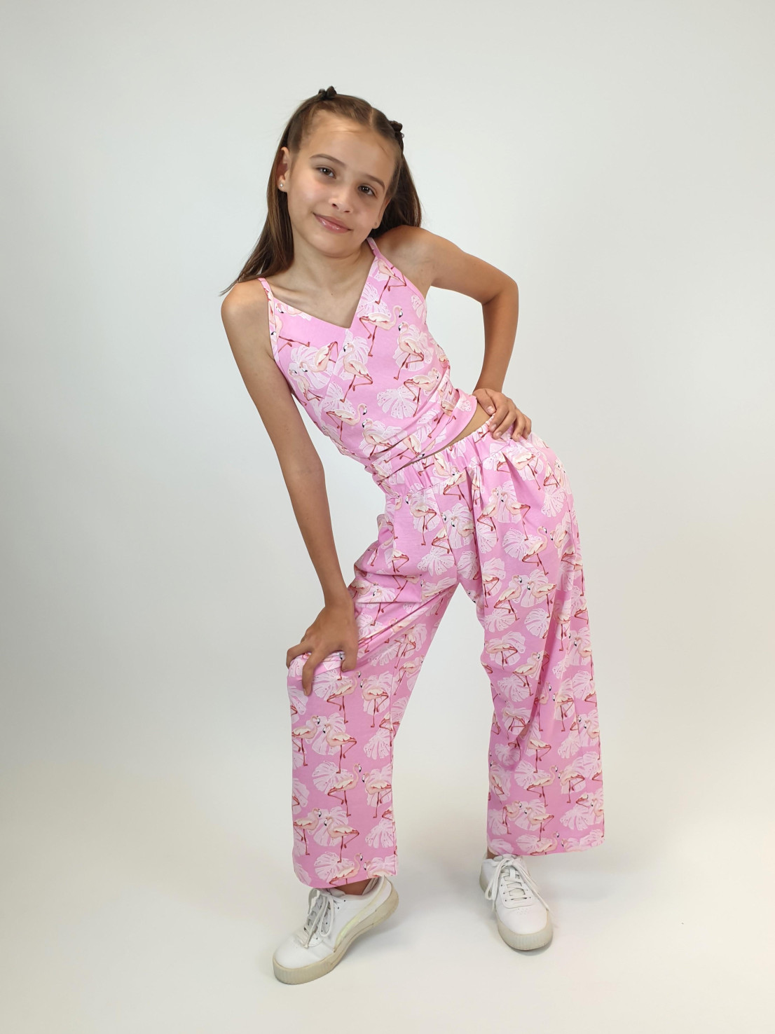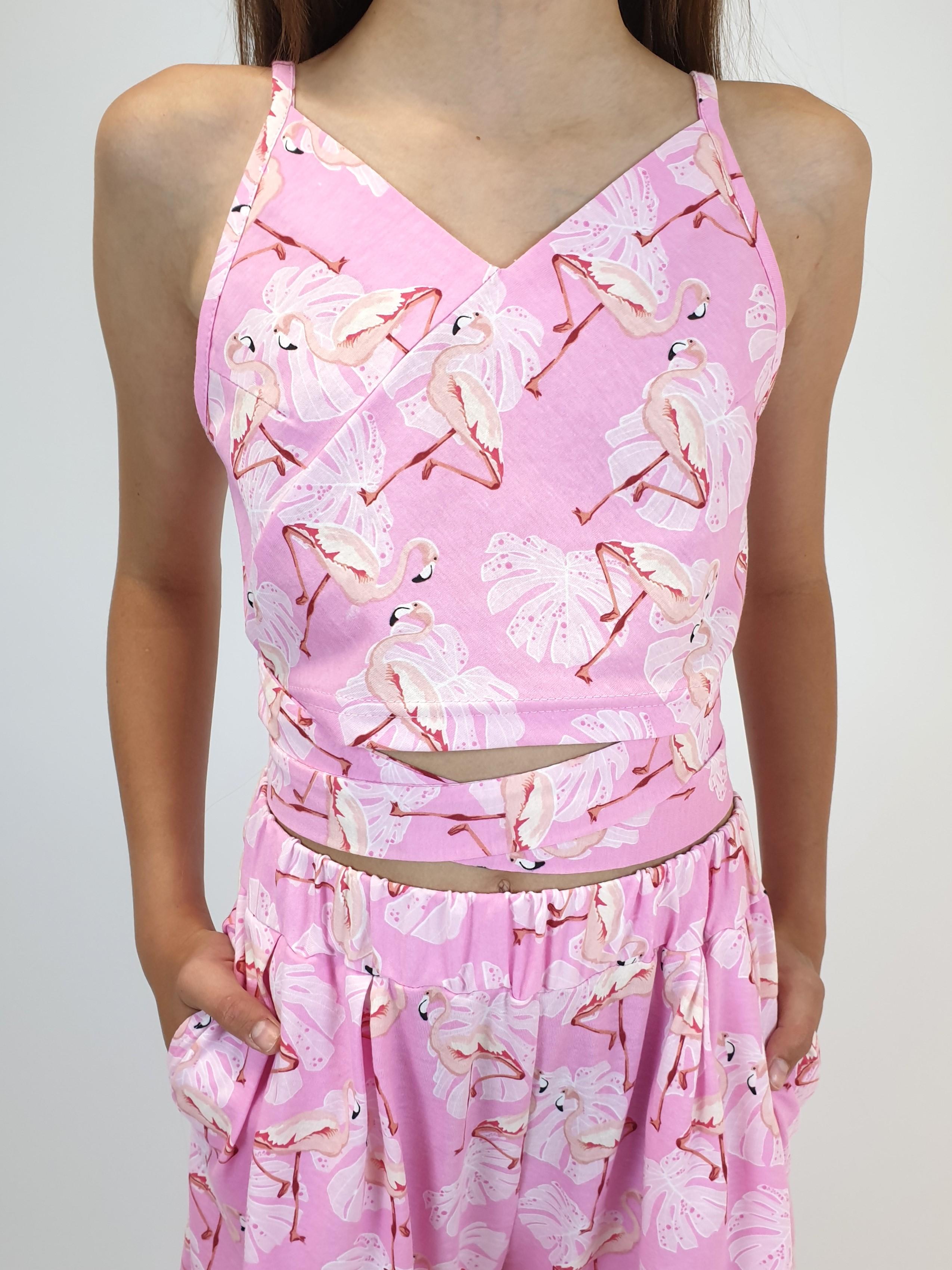 Комплект для девочки. Кулирное полотно: 100% х/б. Топ-на бретелях,имитация на "запах"по переду.На спинке внизу вставлена резинка.Длинный пояс из боковых швов. Брюки-прямые,длинные,мягкие встречные складки на переде.Притачной пояс с резинкой,два кармана в боковом шве.