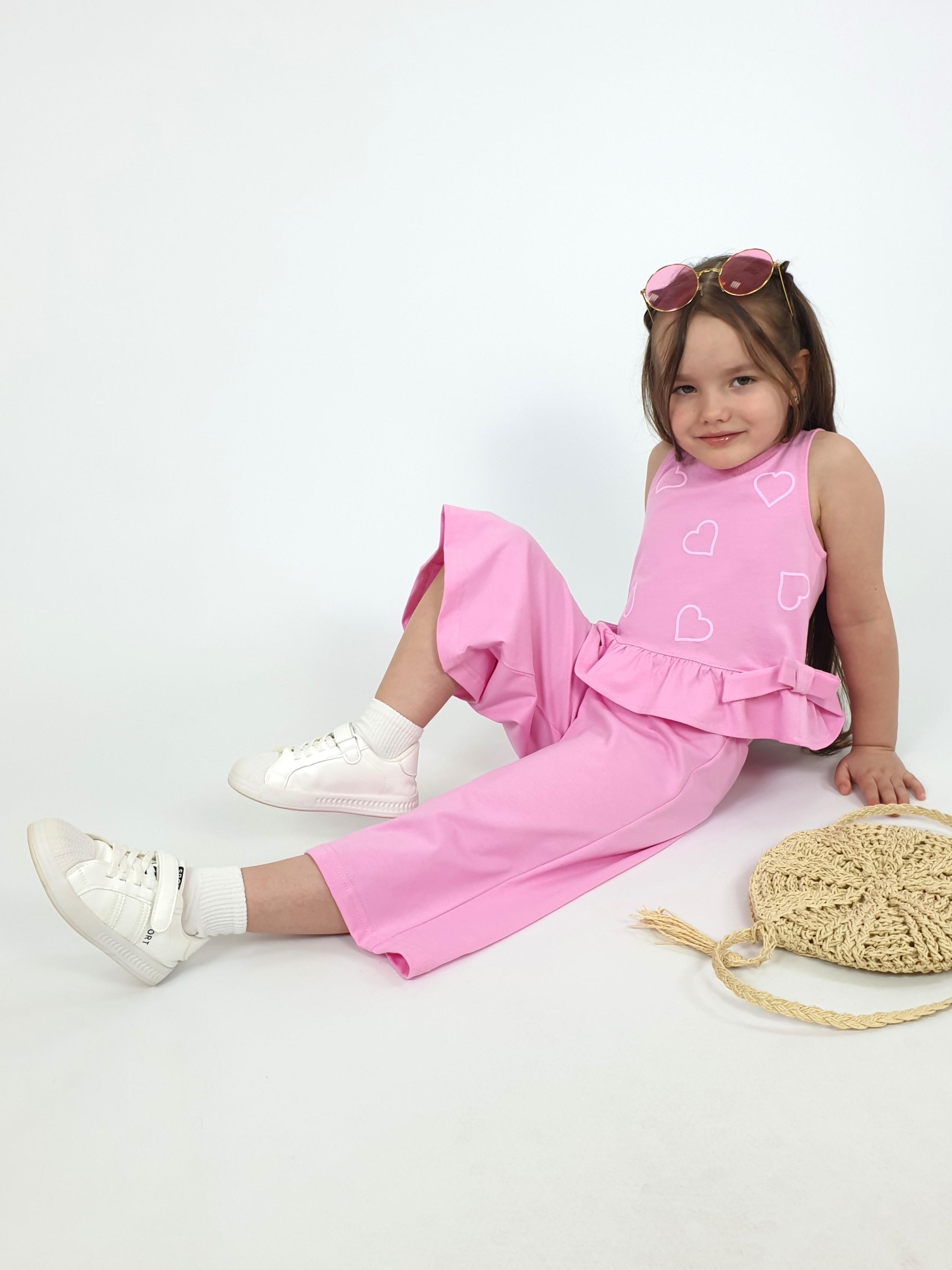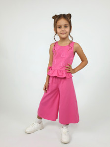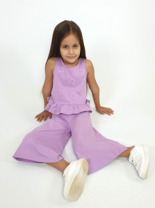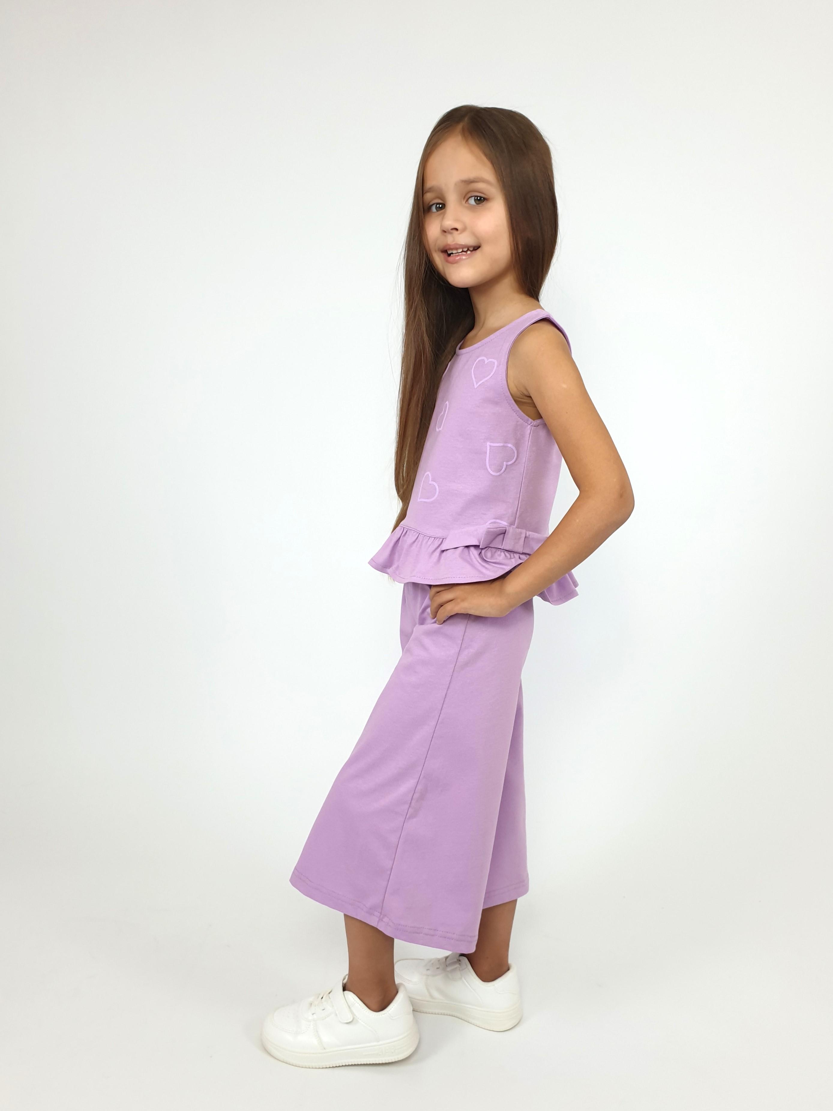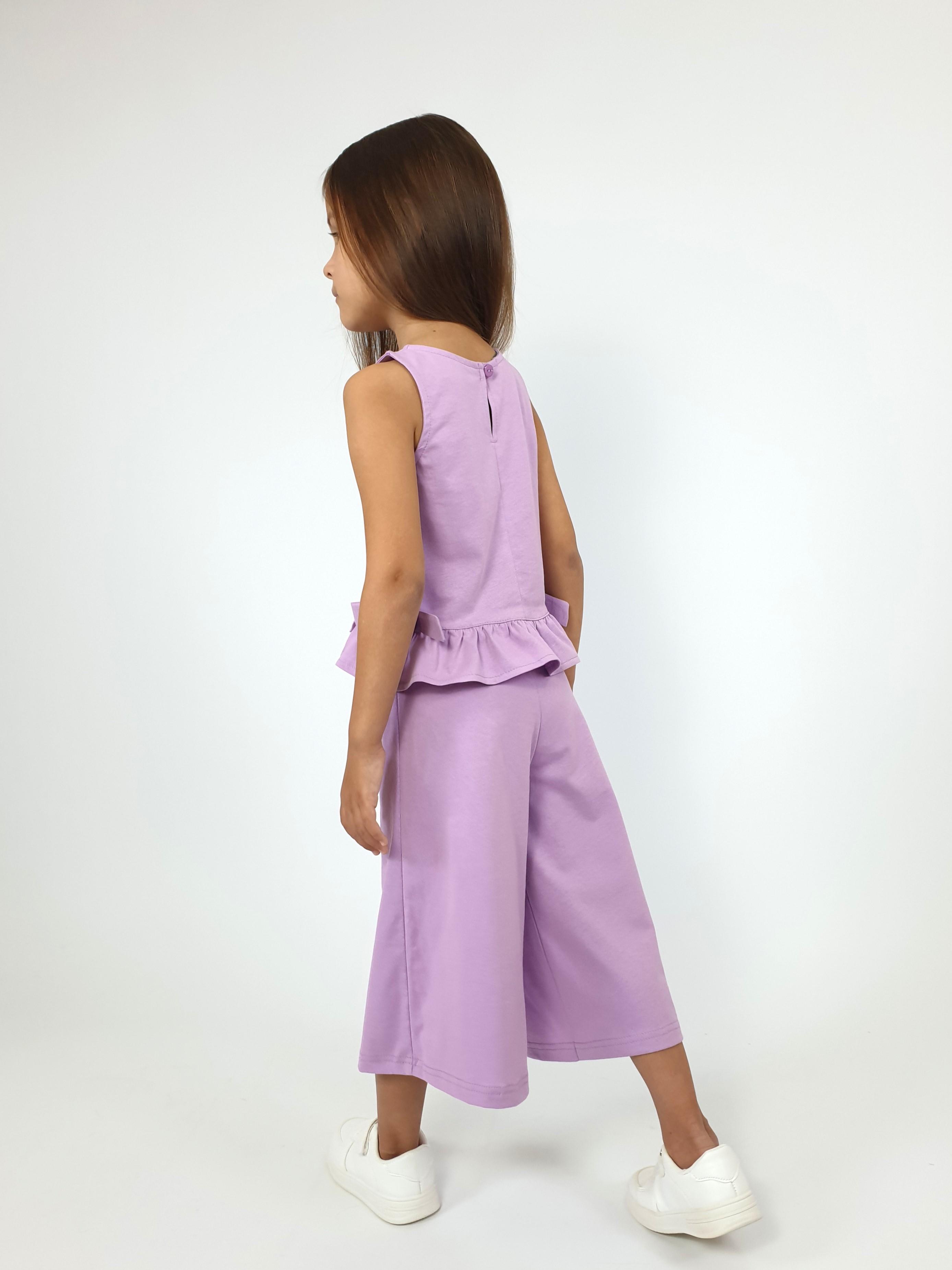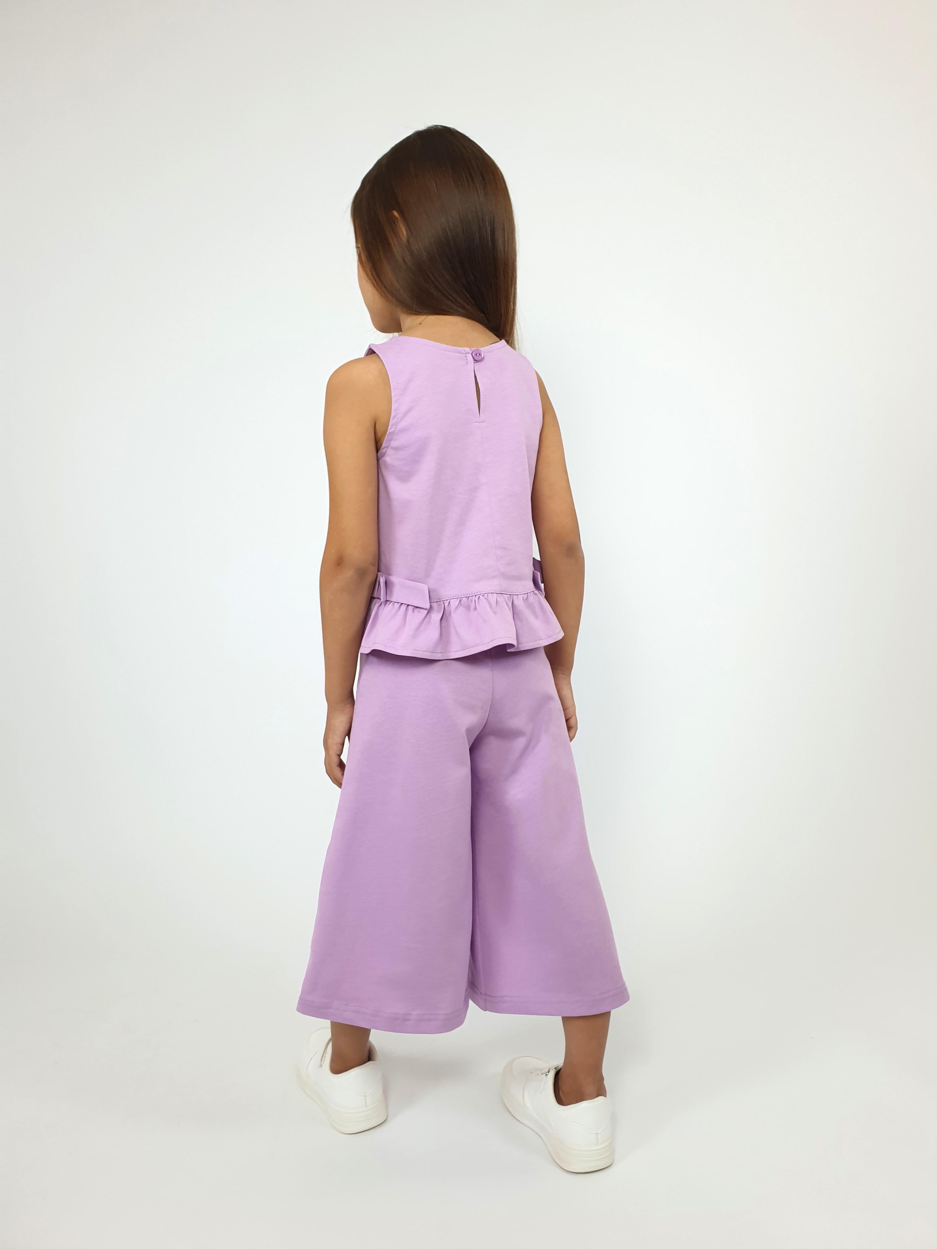 Кулирное полотно:100% х/б. Туника-силуэт трапеция,без рукава,с рюшей внизу.Горловина,пройма окантованы и подшиты.Застежка по спинке на пуговицу.Отделочные бантики внизу на боковом шве.Печать на переде. Брюки-укороченные,расширены к низу,пояс с резинкой.