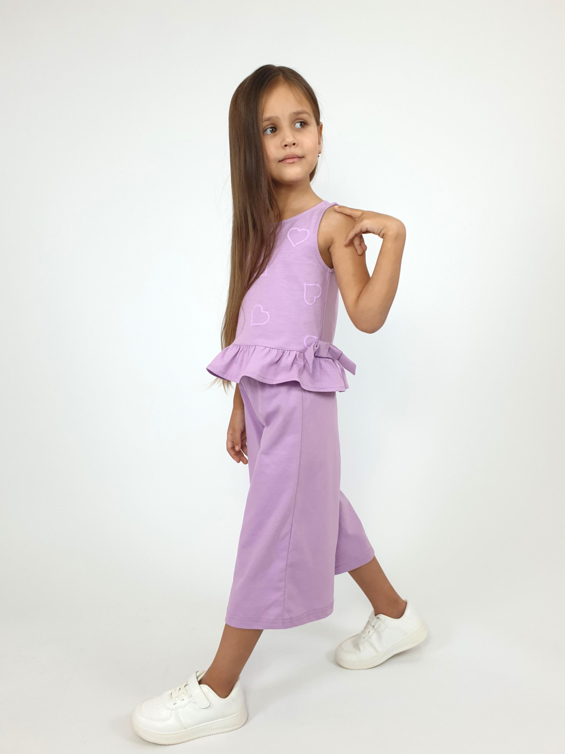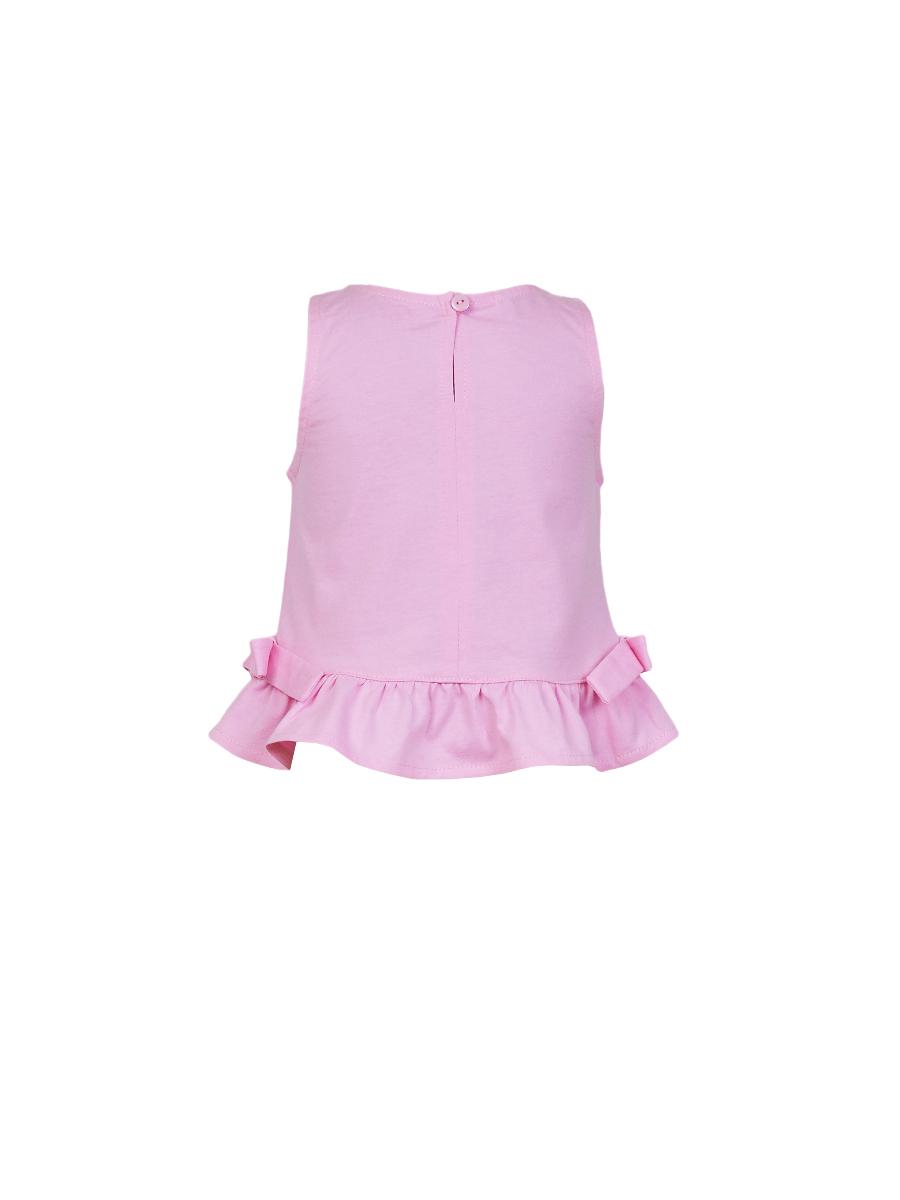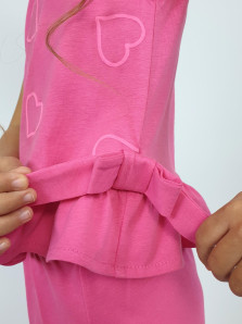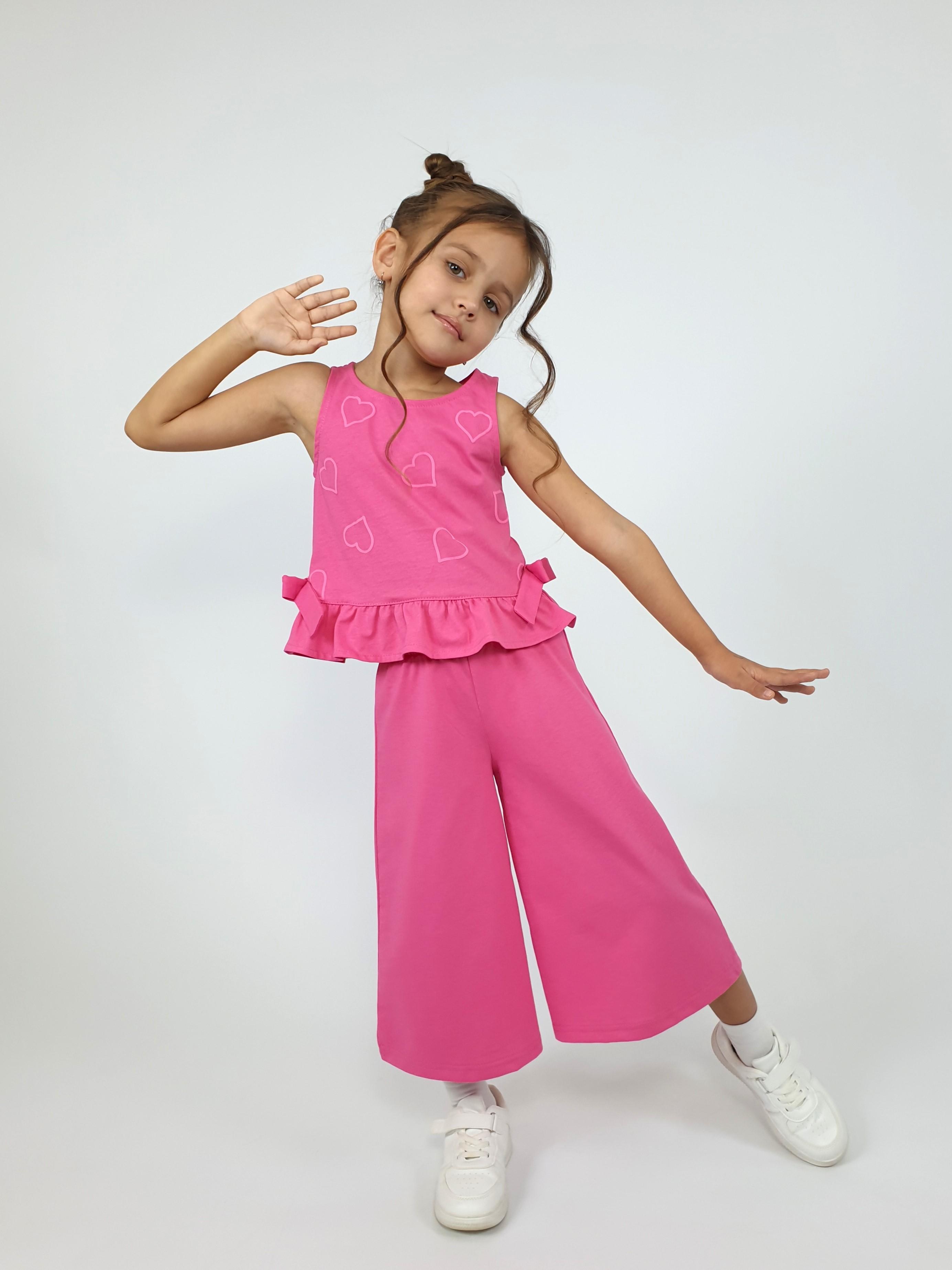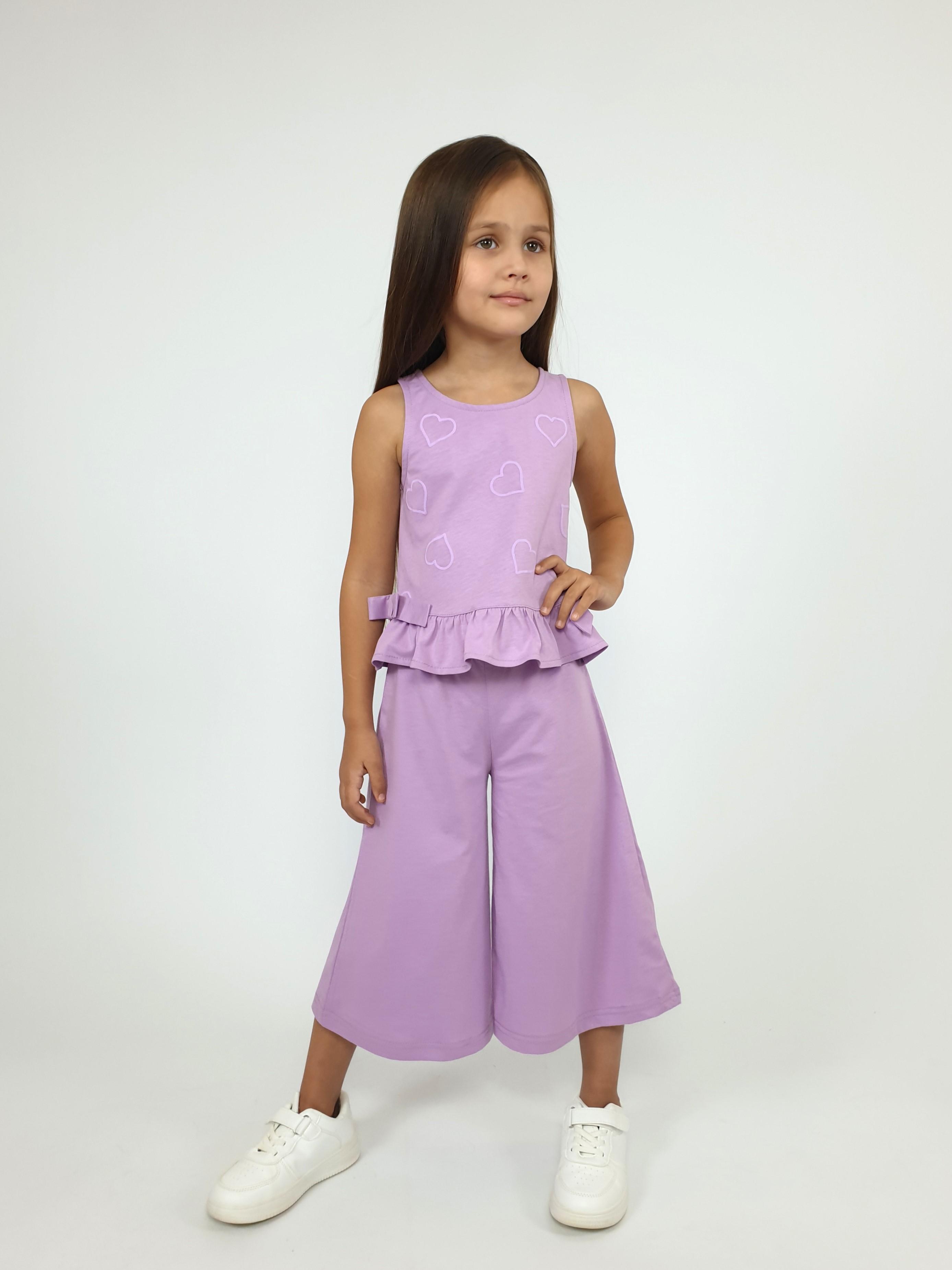 Кулирное полотно:100% х/б. Туника-силуэт трапеция,без рукава,с рюшей внизу.Горловина,пройма окантованы и подшиты.Застежка по спинке на пуговицу.Отделочные бантики внизу на боковом шве.Печать на переде. Брюки-укороченные,расширены к низу,пояс с резинкой.